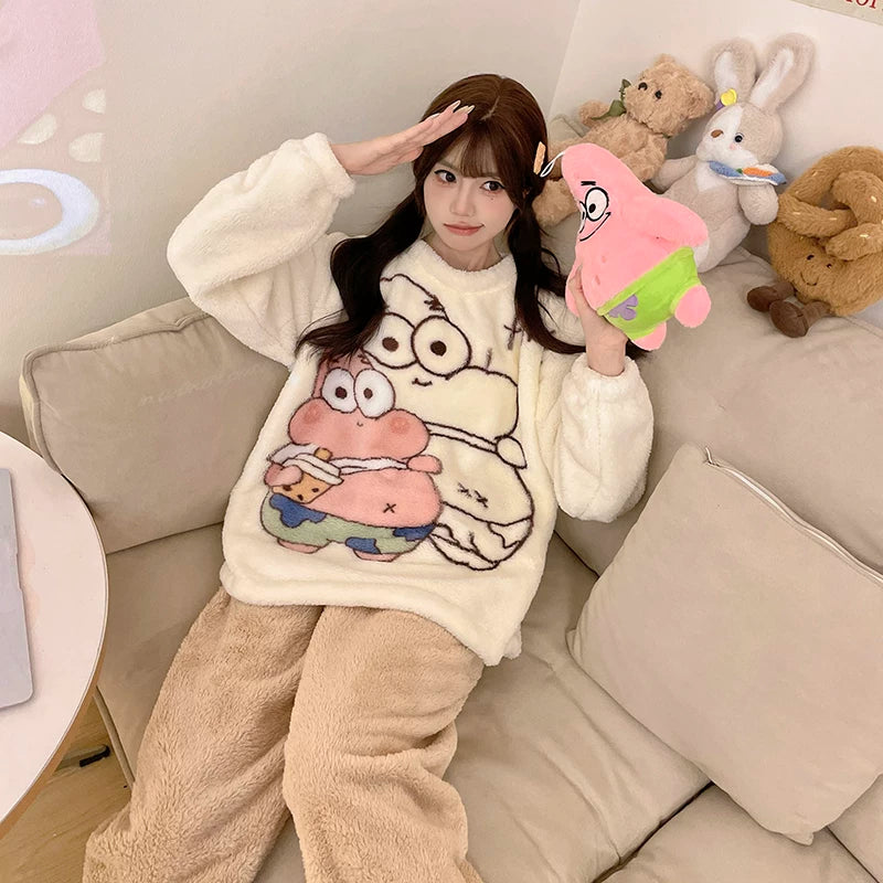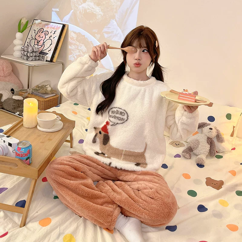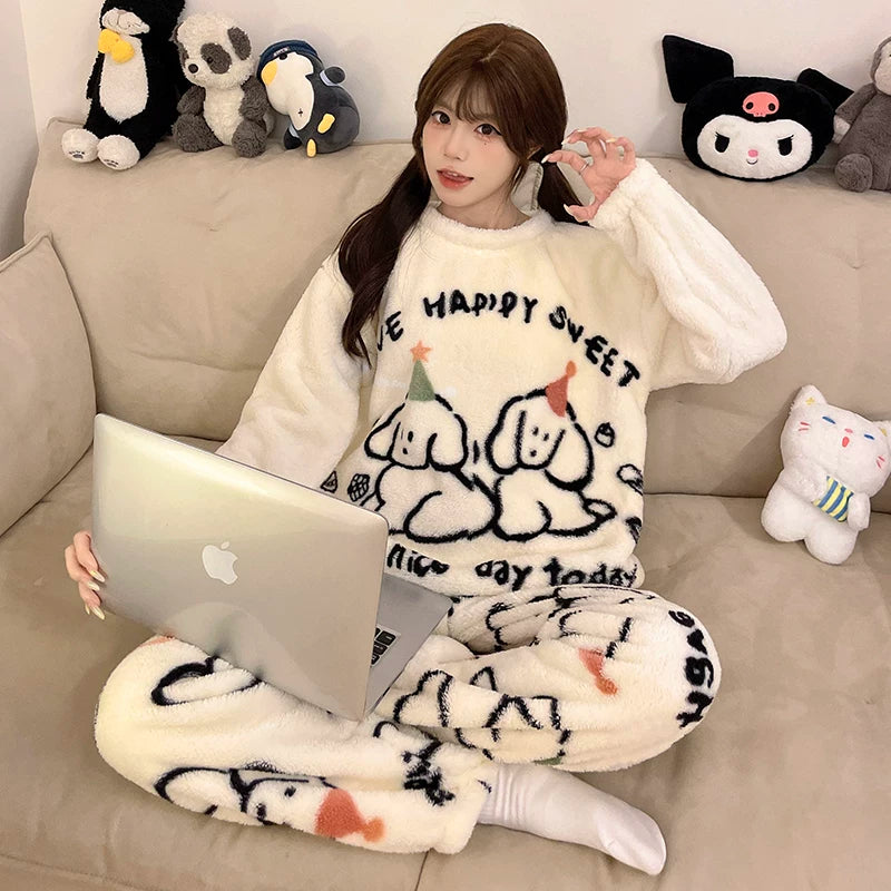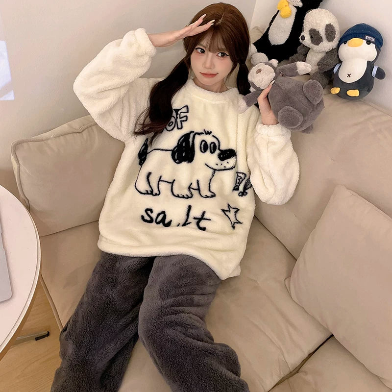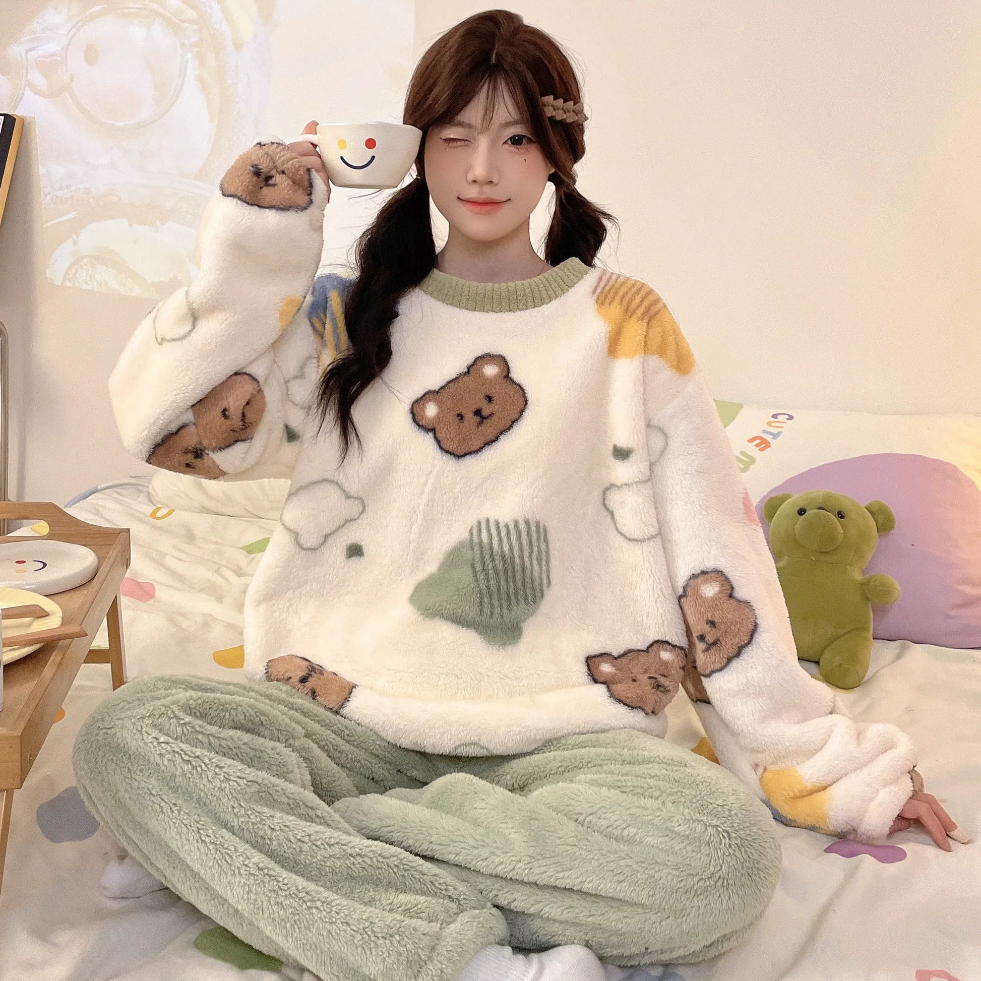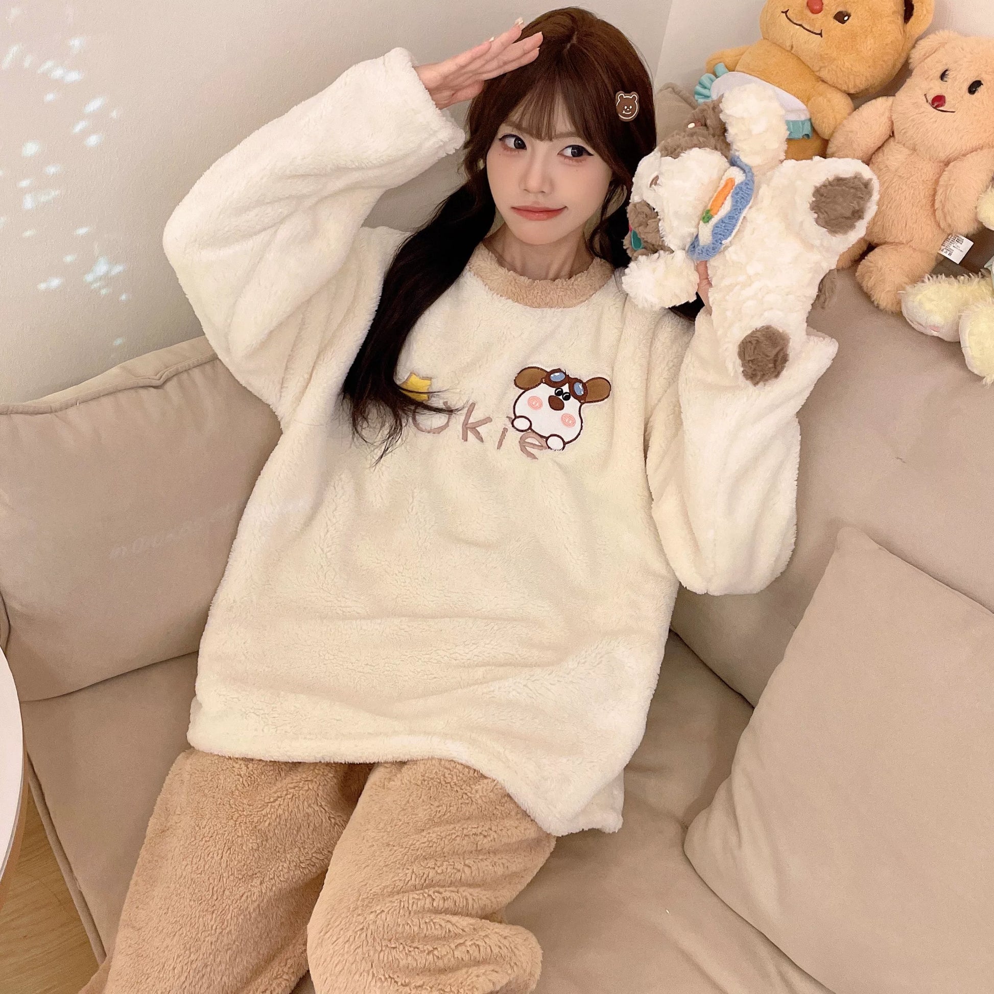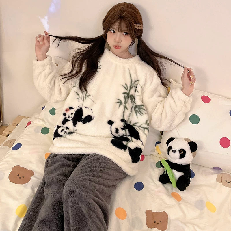 Cizgi filmi boz və qara pişik qış yeni mərcan yunlu pijama qadın yun astarlı və qalınlaşmış tələbə flanel ev geyimi xarici geyimlər