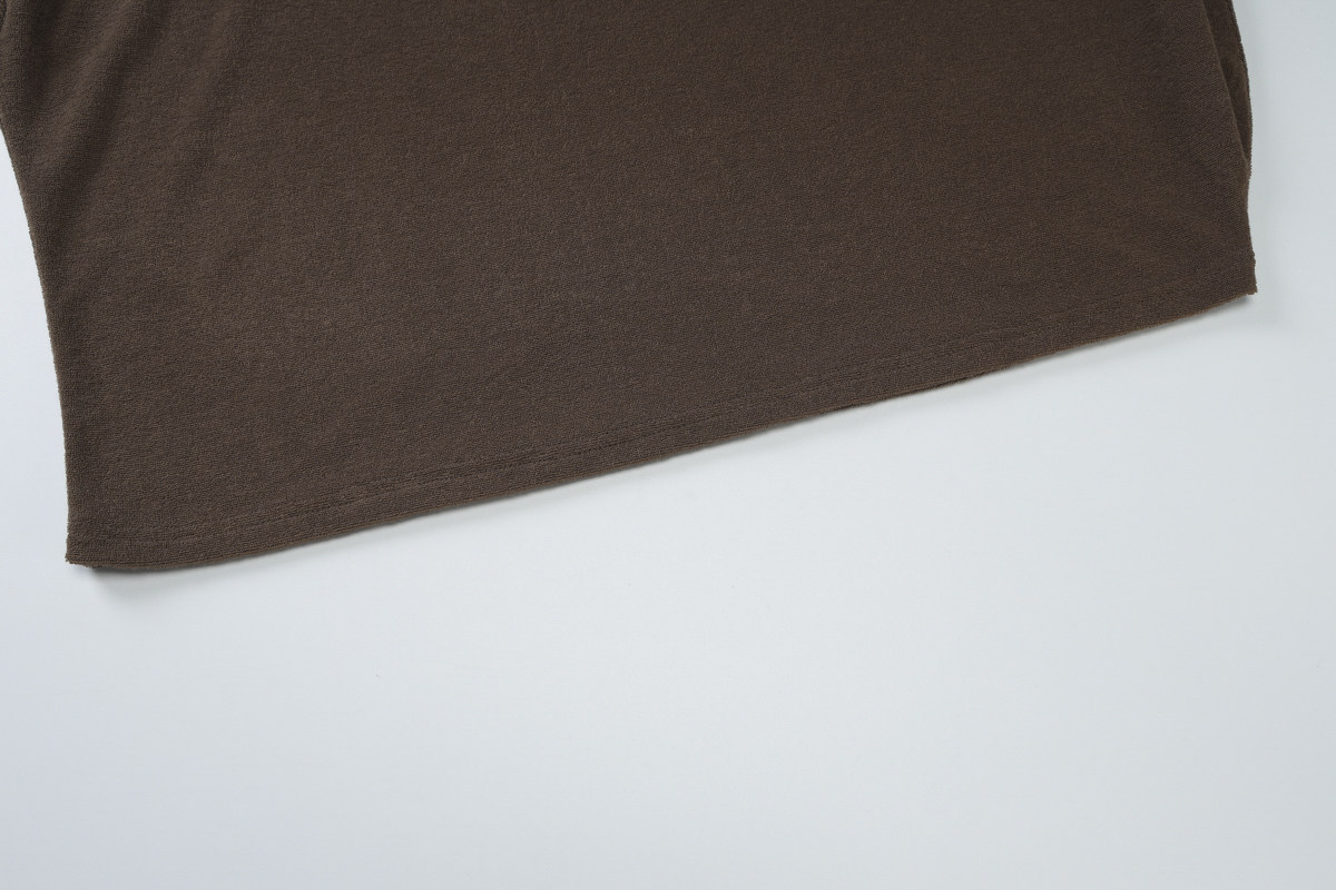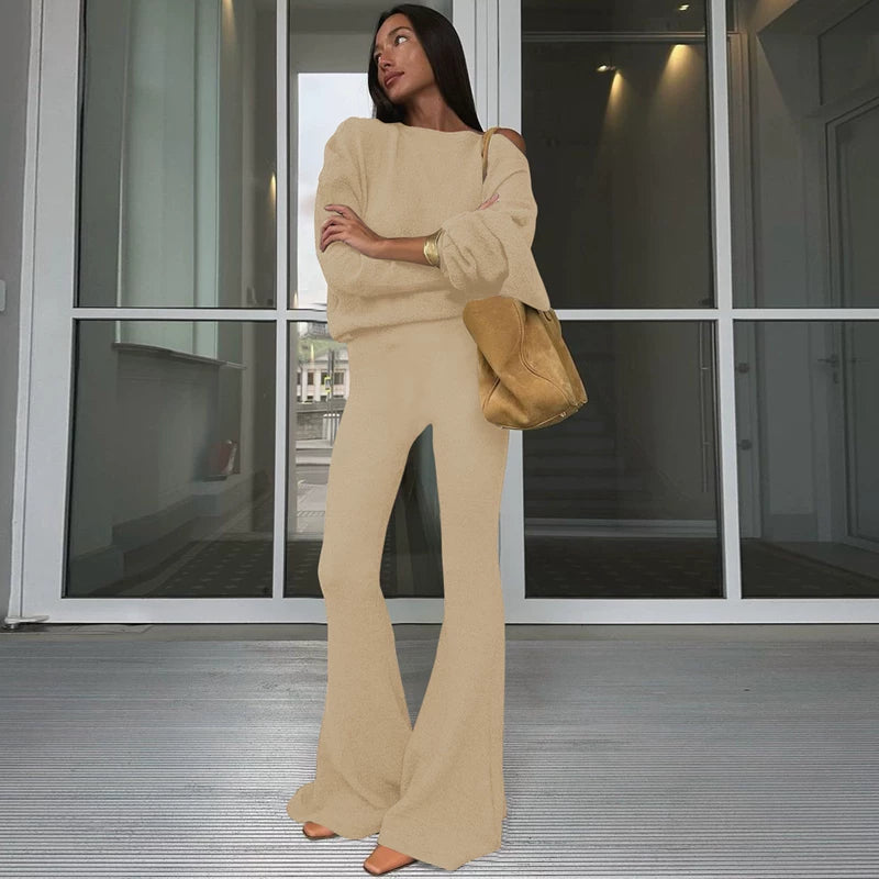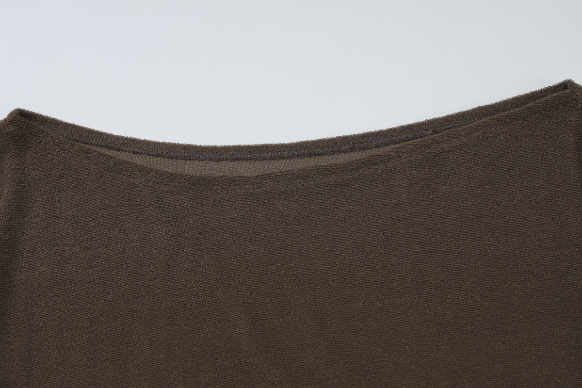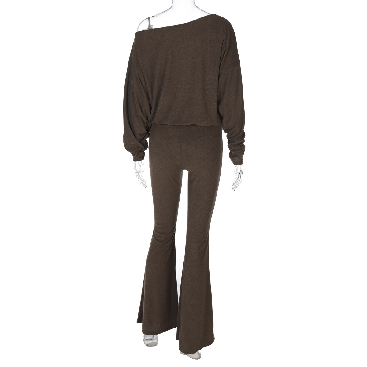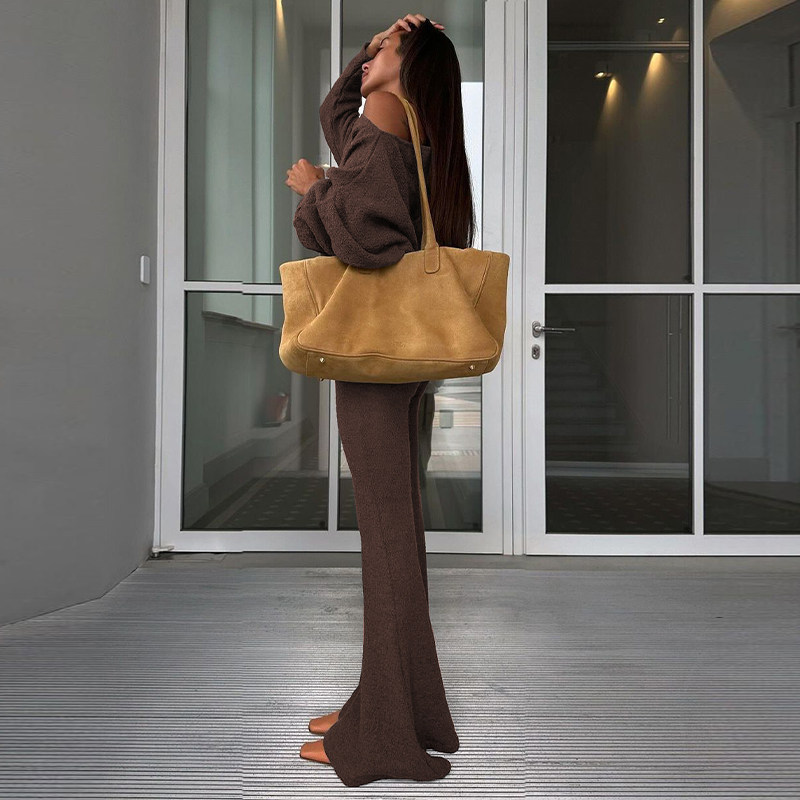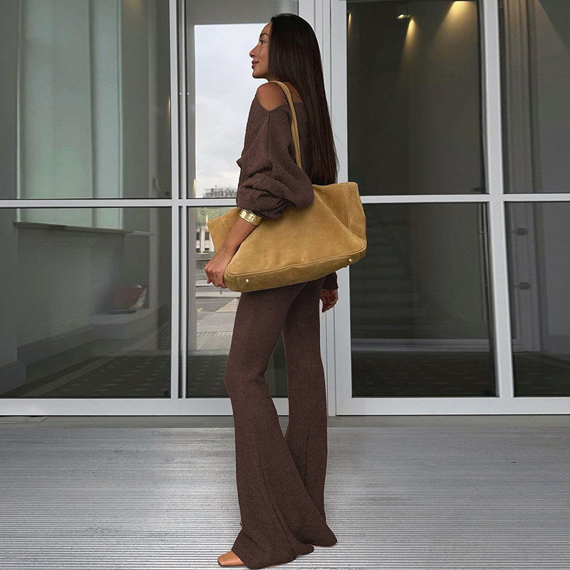 Dəbli qəhvəyi rəngli, çiyinləri açıq uzunqol köynək və geniş şalvar, iki hissəli dəst, 2025-ci ilin yaz/payız mövsümünün dəbli və dəbli üslubu.
