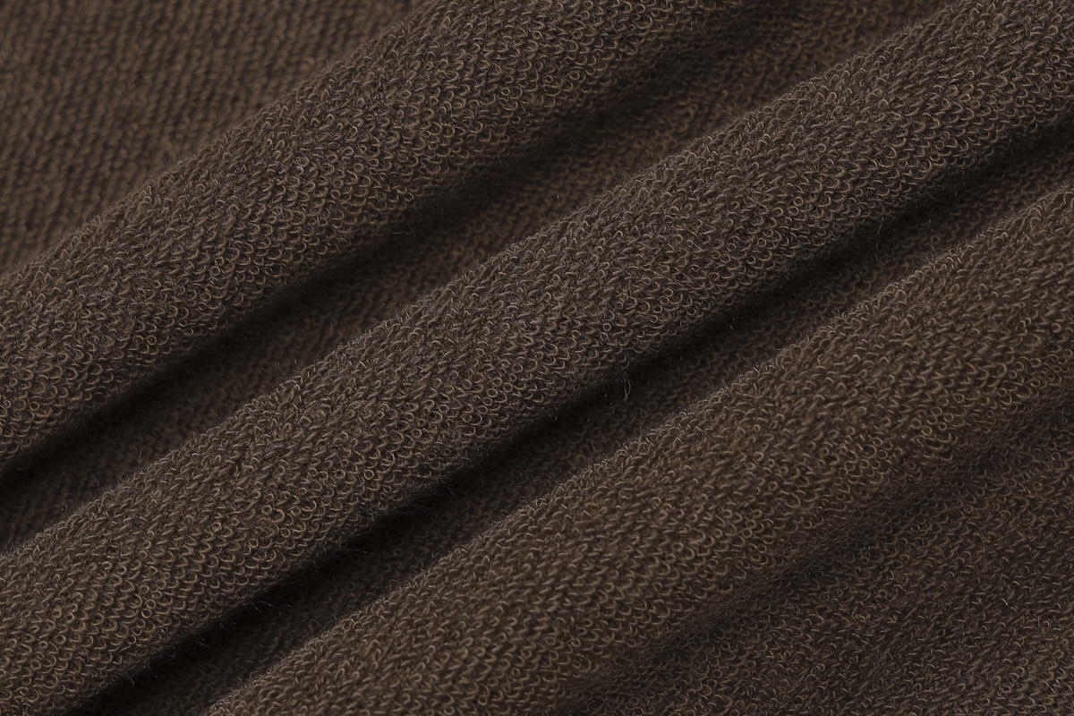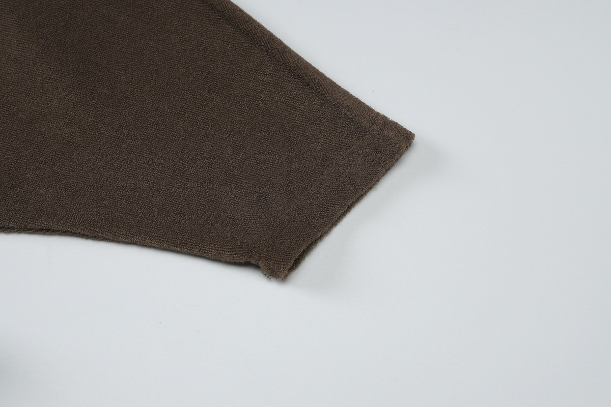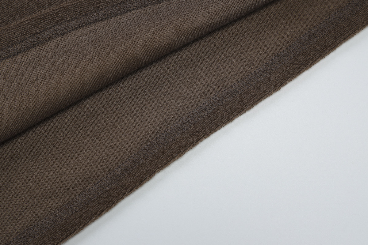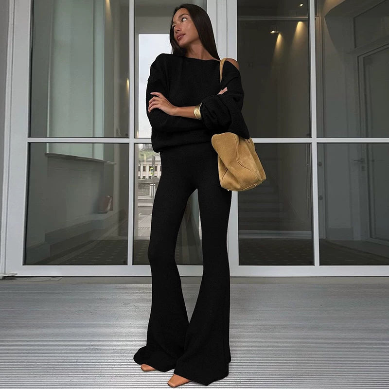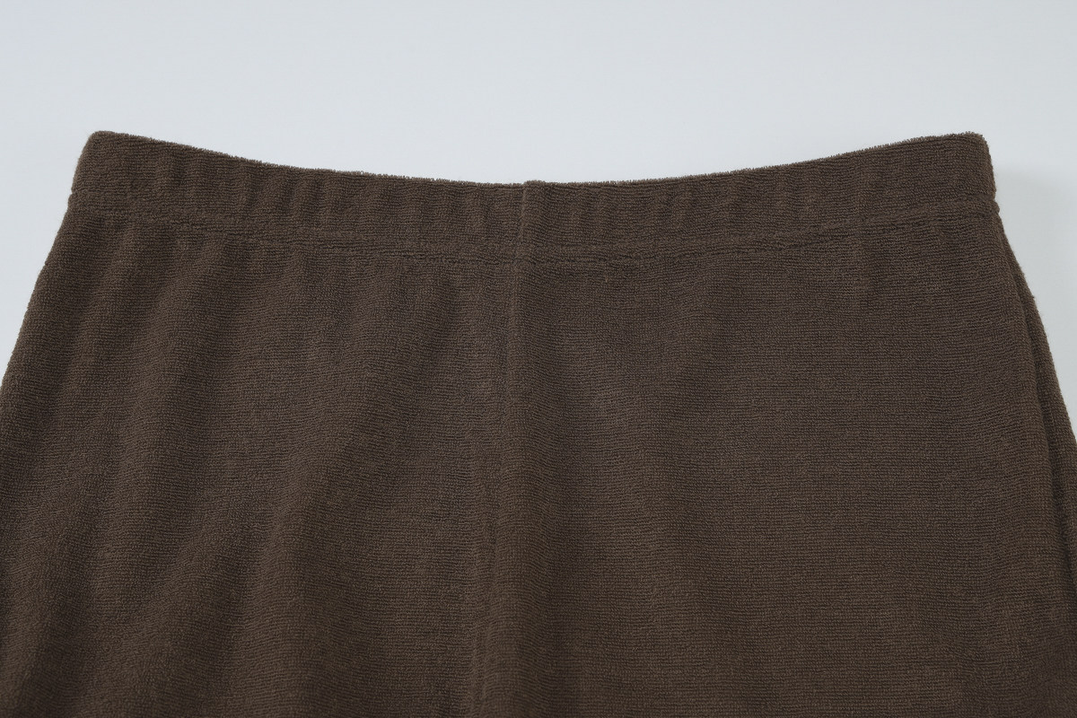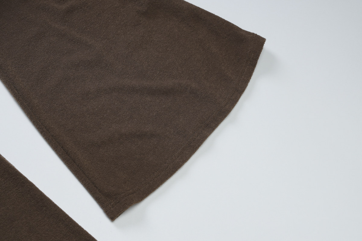 Dəbli qəhvəyi rəngli, çiyinləri açıq uzunqol köynək və geniş şalvar, iki hissəli dəst, 2025-ci ilin yaz/payız mövsümünün dəbli və dəbli üslubu.