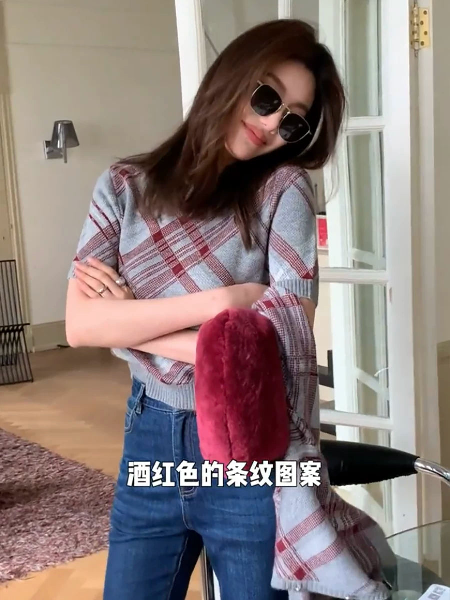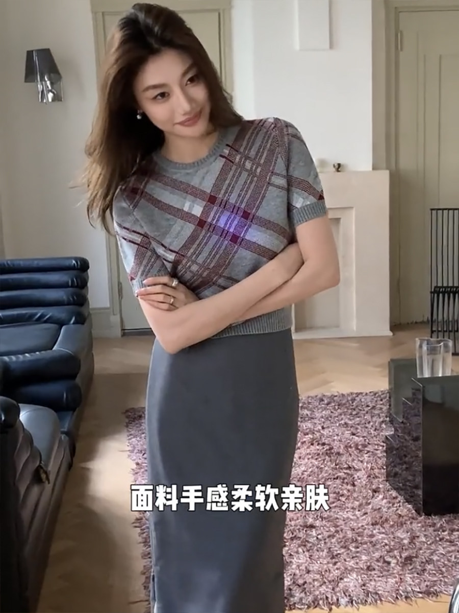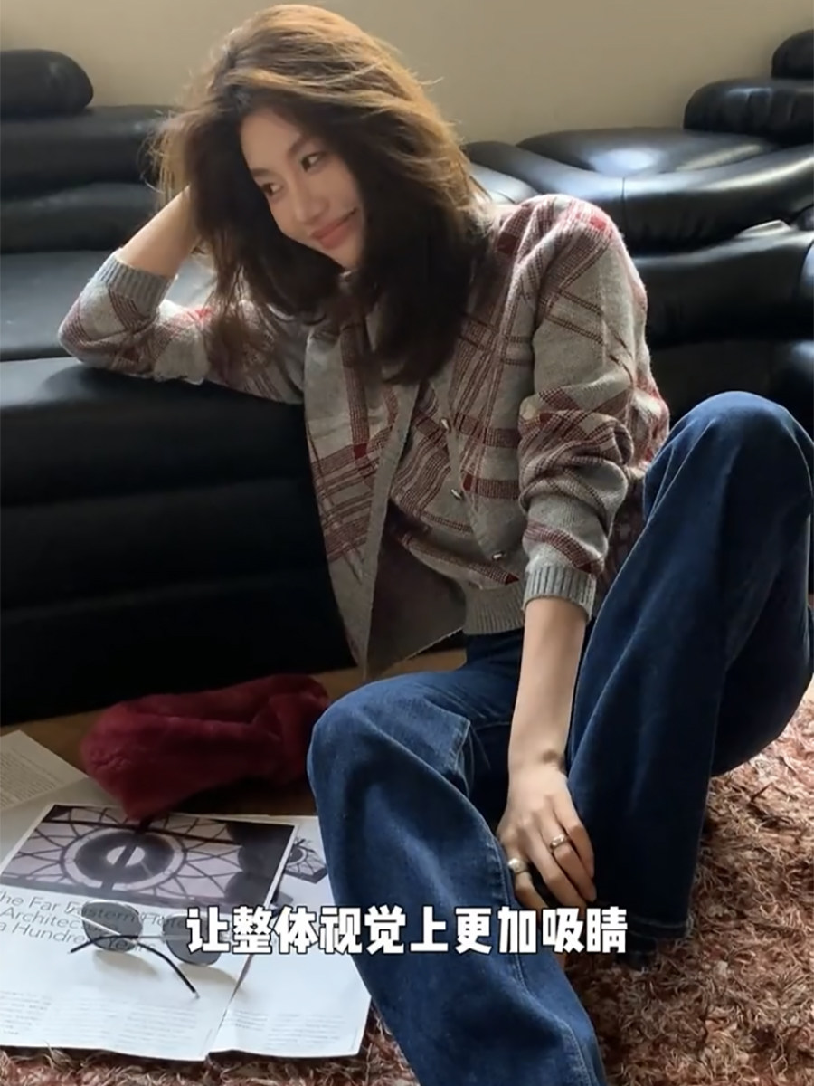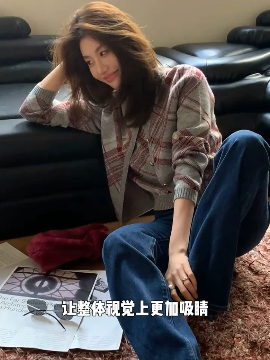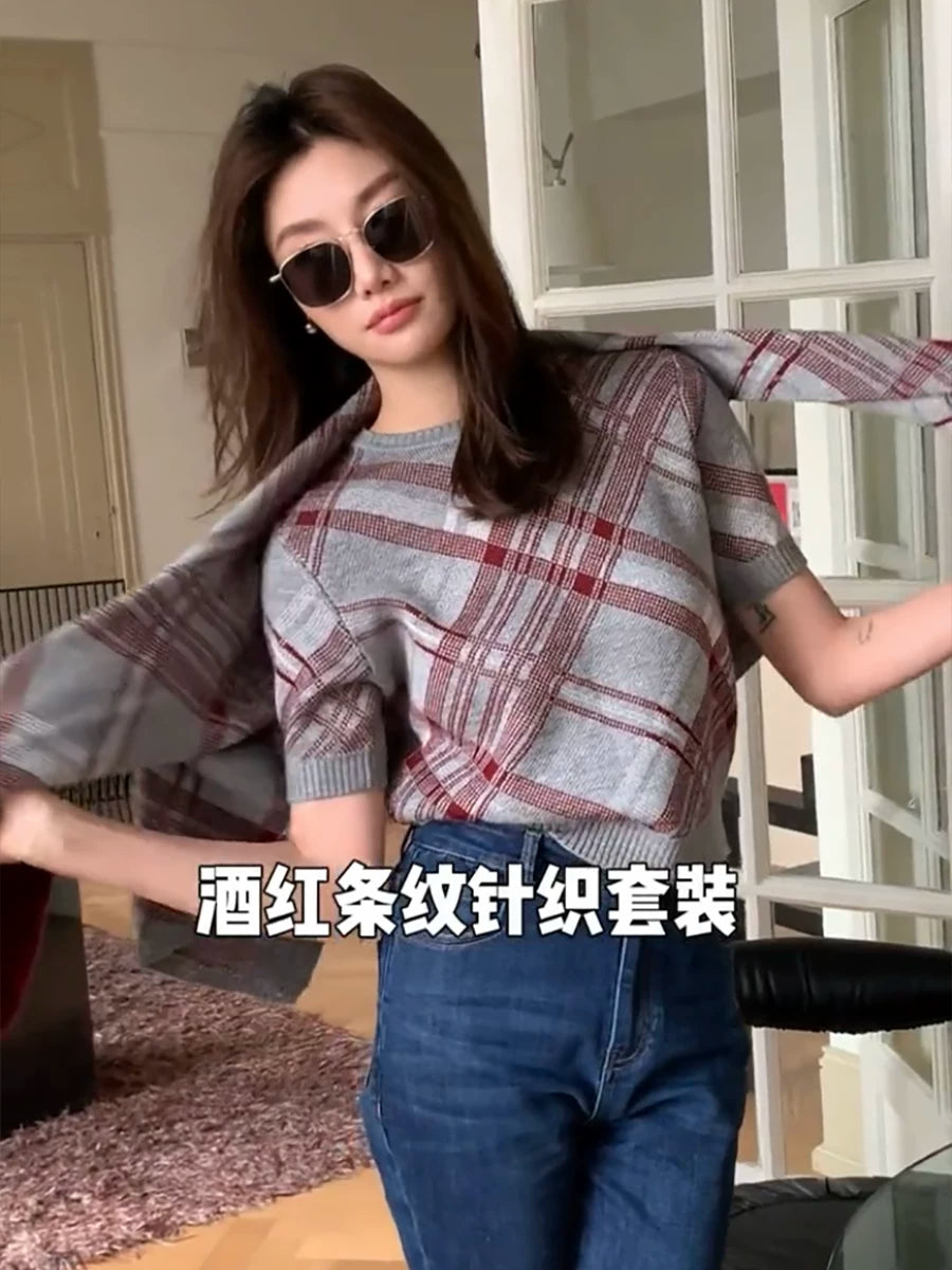 Gündəlik və rahat iki hissəli dəst, 2025-ci ilin erkən yaz yeni rəngli bloklu dama-dama toxunmuş hırka qısaqol top dəsti