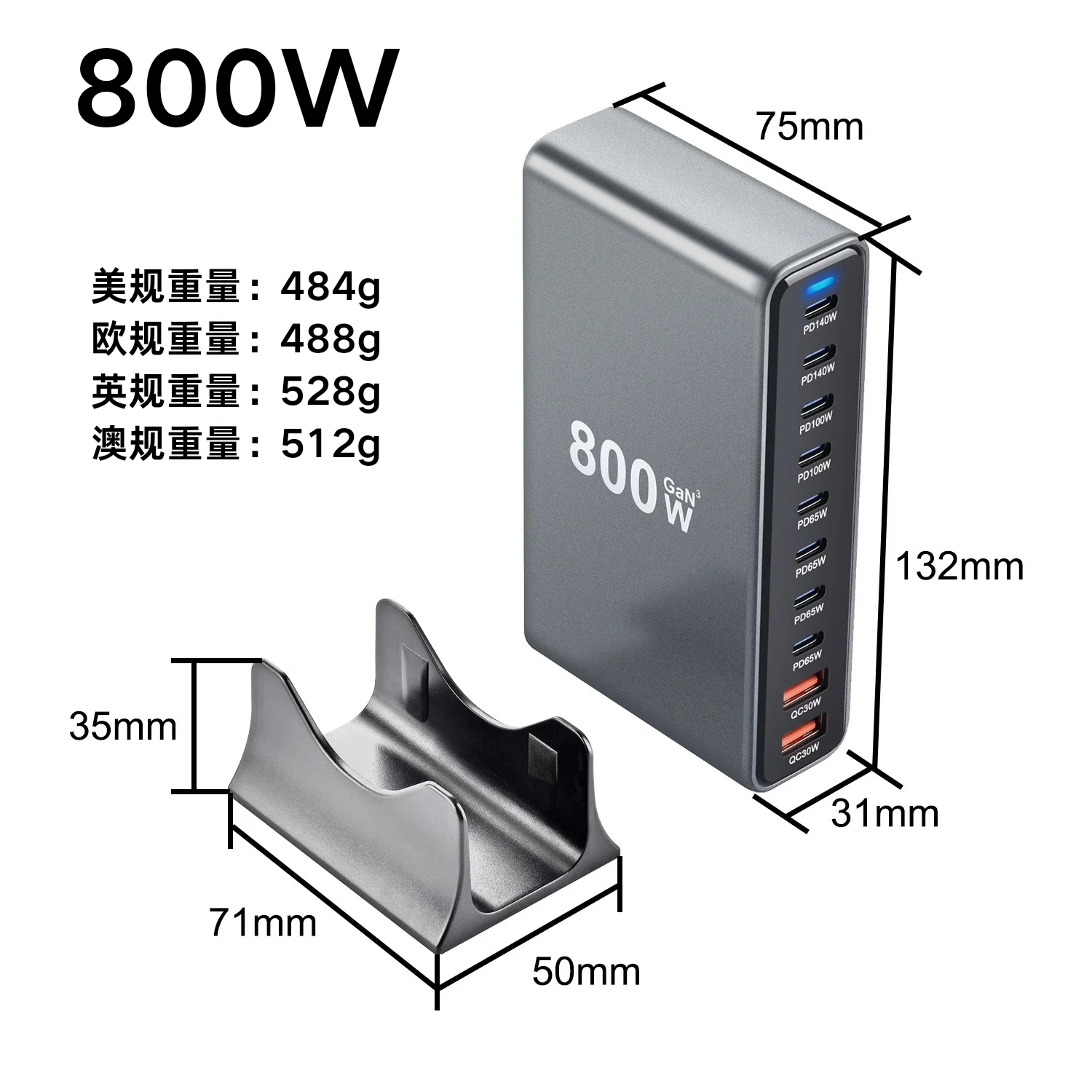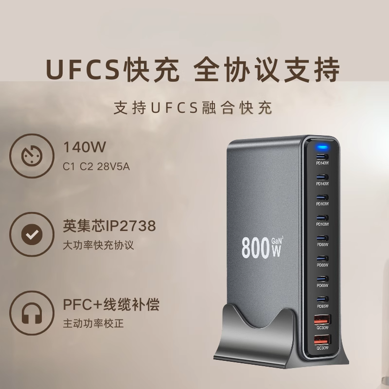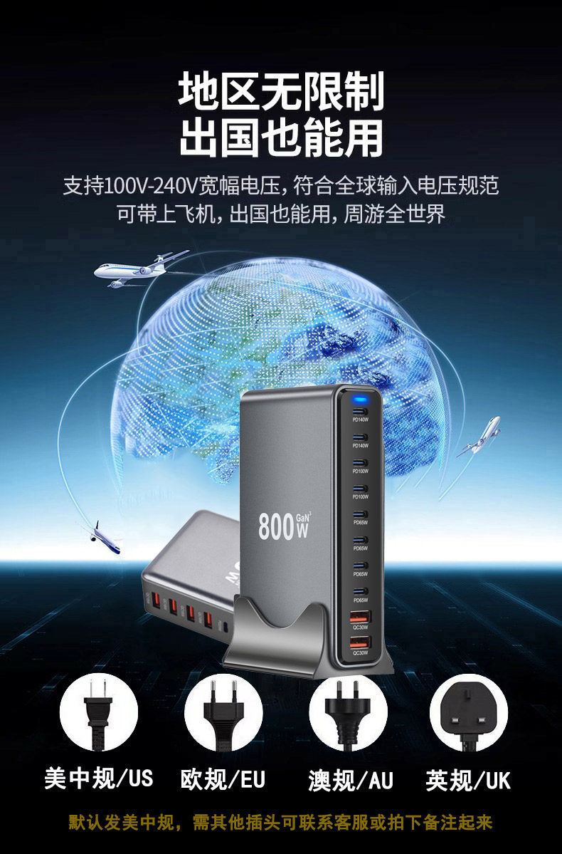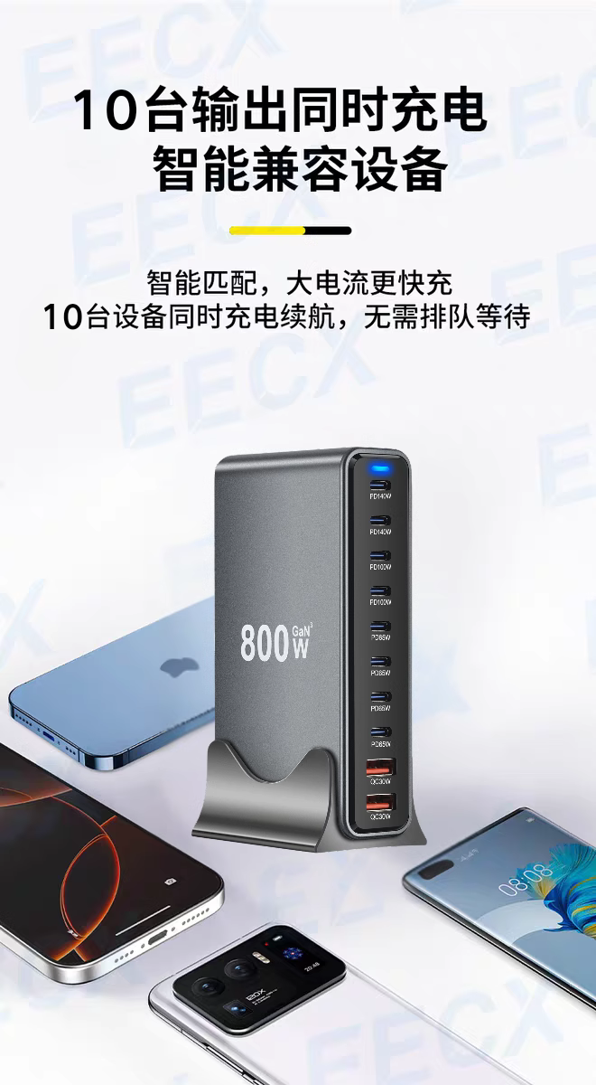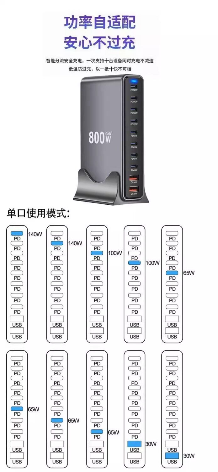 Huawei, Apple 16, Xiaomi telefonları və noutbukları, Böyük Britaniya, AB, Avstraliya və ABŞ standart rozetkaları ilə uyğun gələn yeni GaN 800W sürətli şarjlı çoxportlu USB yüksək güclü PD 140W masaüstü şarj doku.