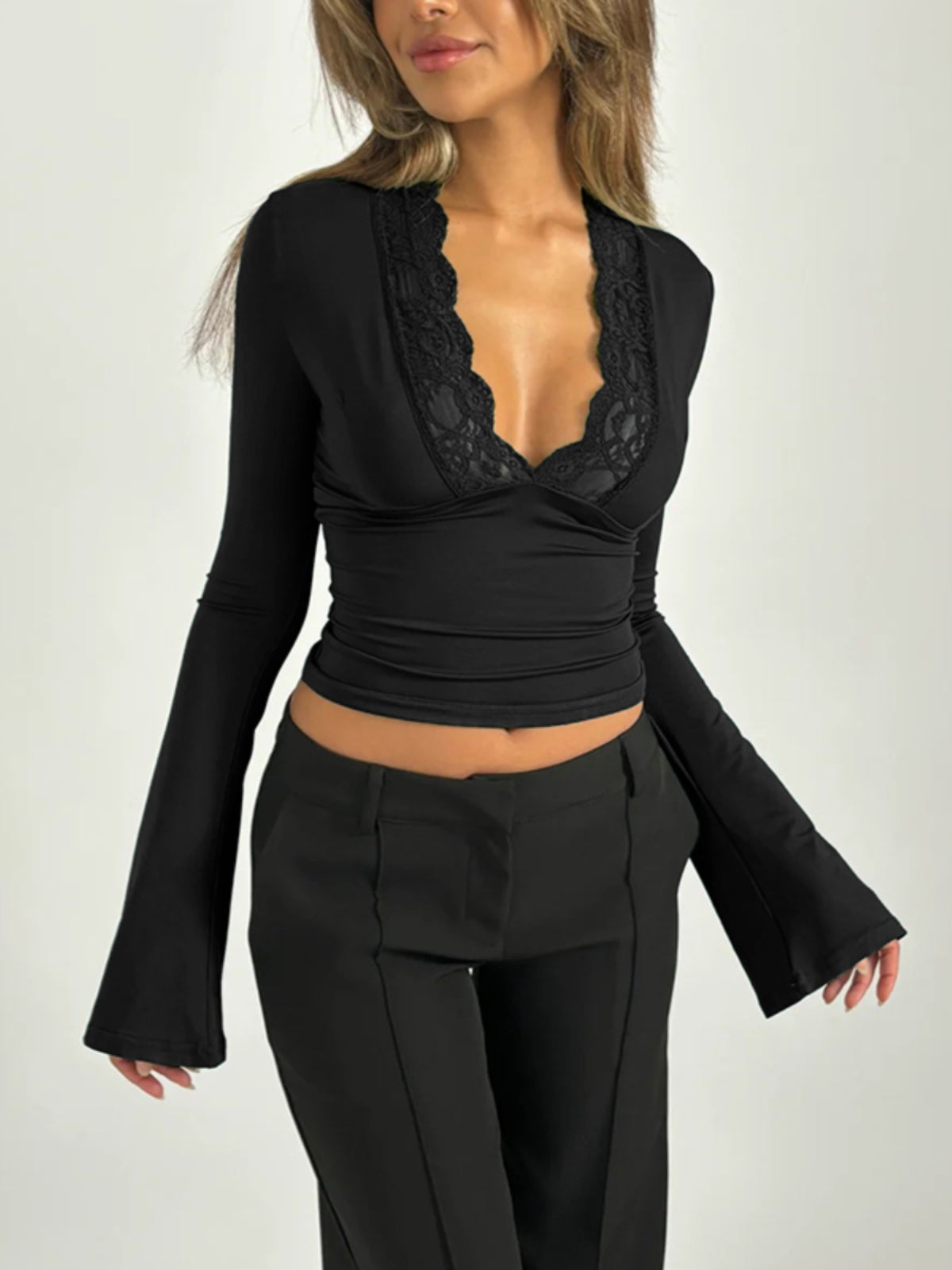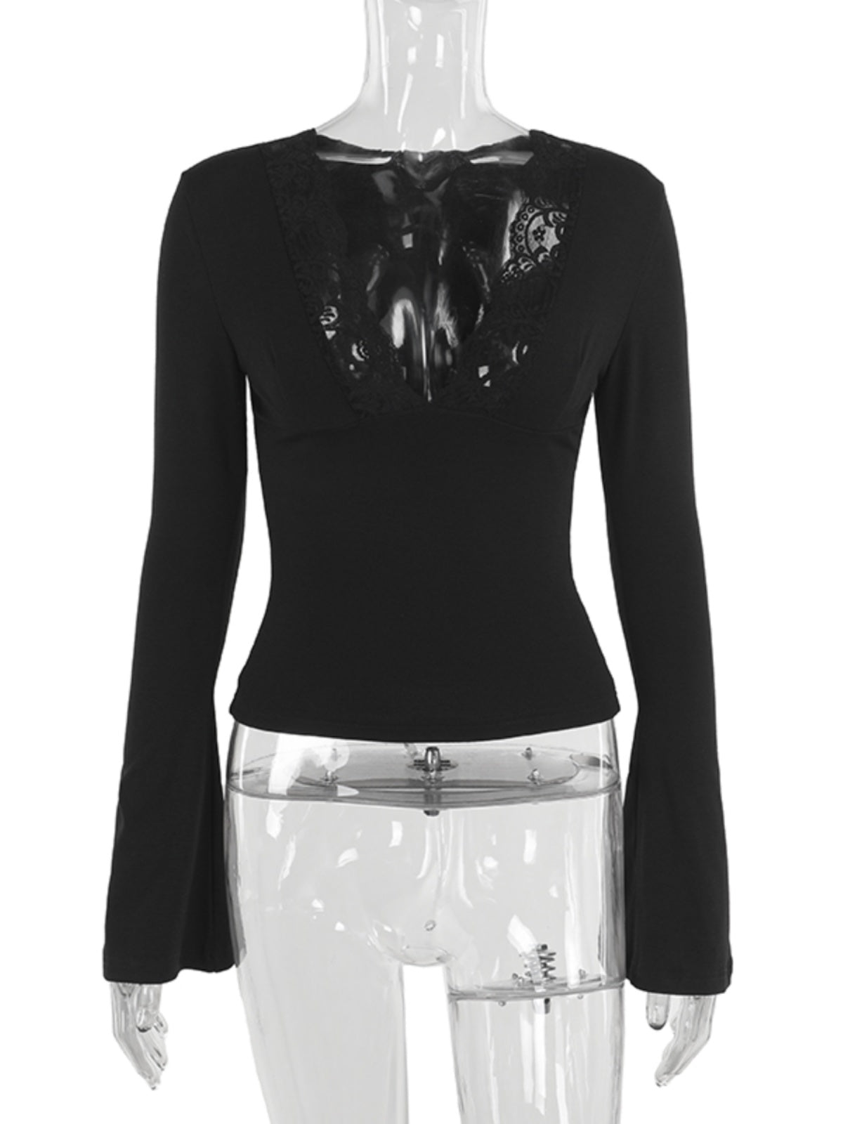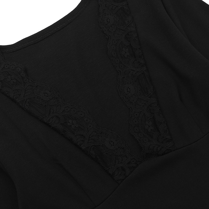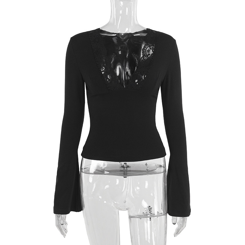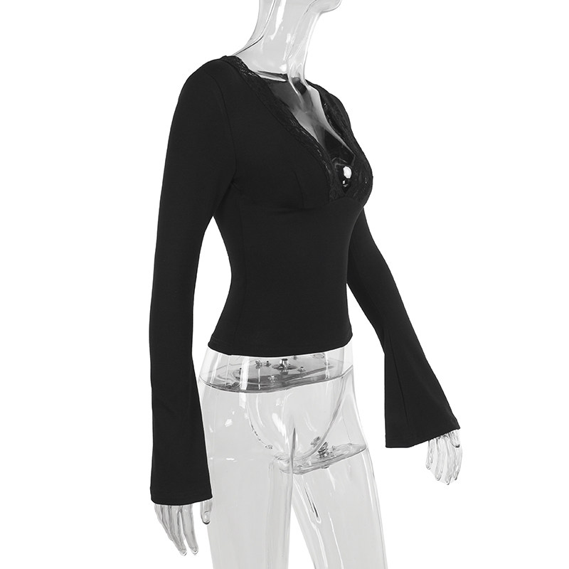 Möhtəşəm, seksual Avropa və Amerika üslubunda, qadınlar üçün krujeva V-yaxalı futbolka, 2025-ci ilin yeni üslubu, belini sıxan uzunqol köynək.
