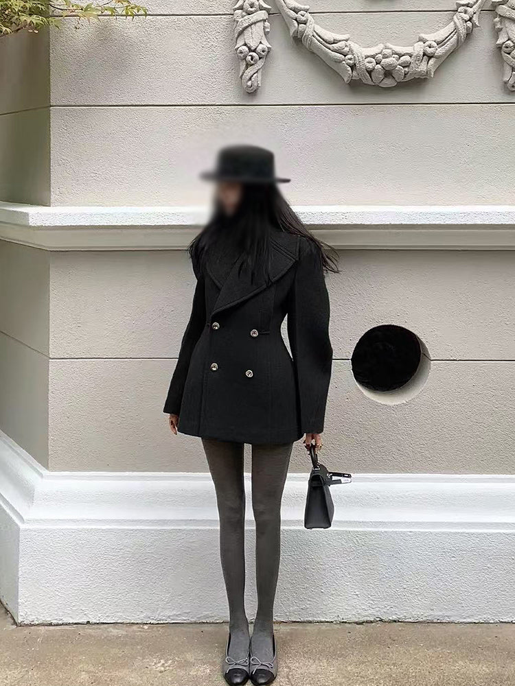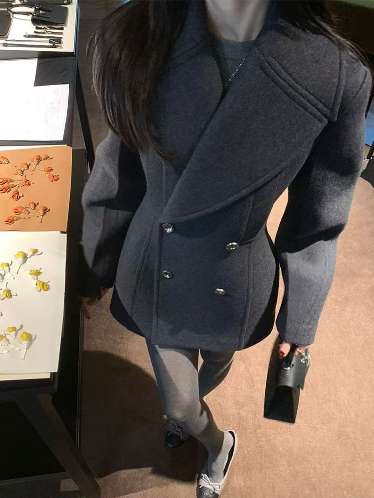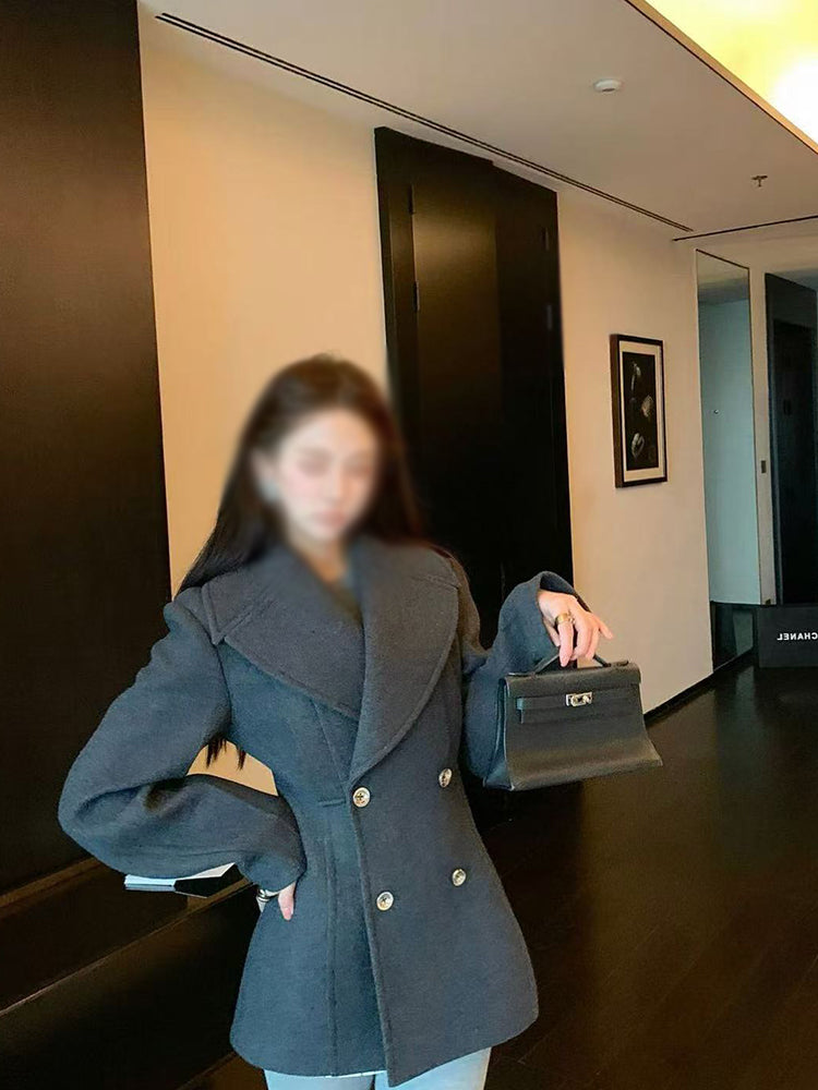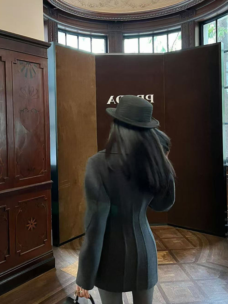 Old Qian Style Boz Yun Palto Qadınlar üçün İkiqat Döşlü Qum Saatı Bel Orta Uzunluqlu Zərif Kostyum Yun Palto