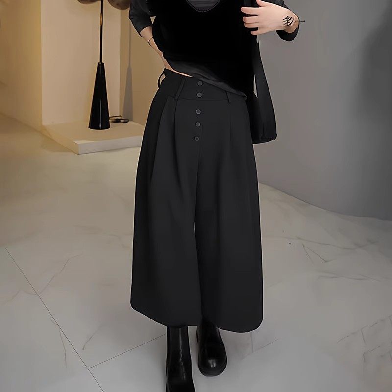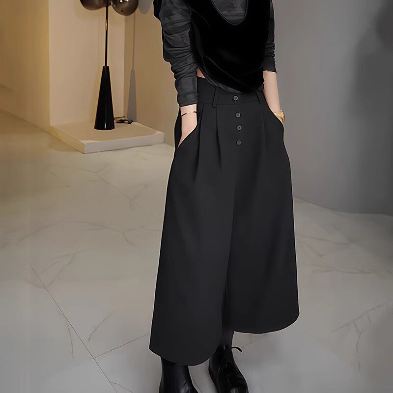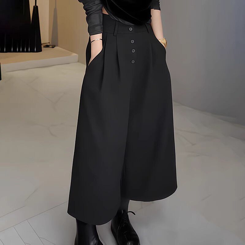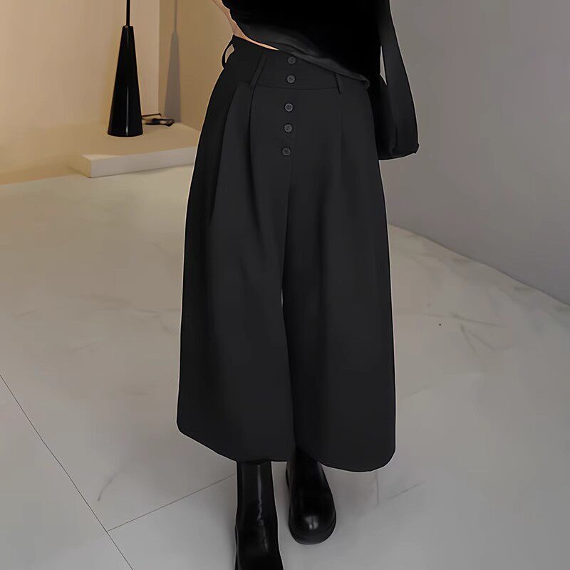 Qadın qara qısa kostyum şalvarı, yaz üslubunda, böyük ölçüdə, yüksək belli, arıqladıcı, büzməli dizayn, gündəlik və boş enli şalvar.