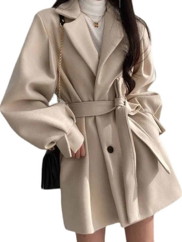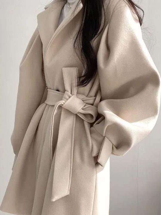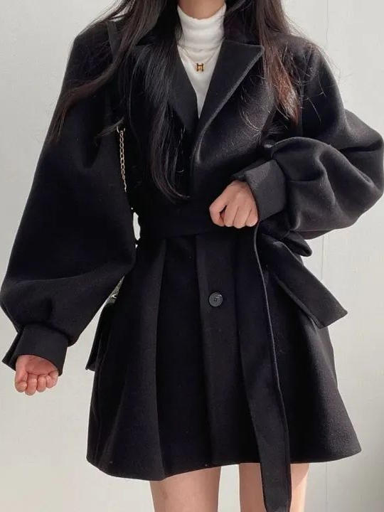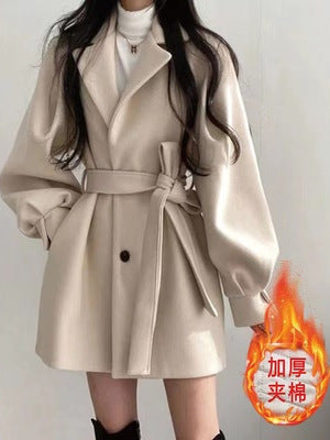 Qadın qış yun paltosu, kiçik, orta uzunluqlu, kostyum yaxası, qalınlaşdırılmış, kəmərli, arıqladıcı, fənər qollu, pambıqla örtülmüş trençkot