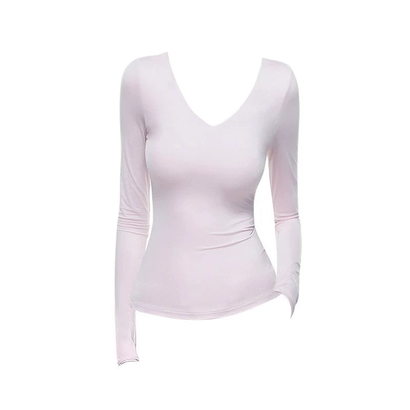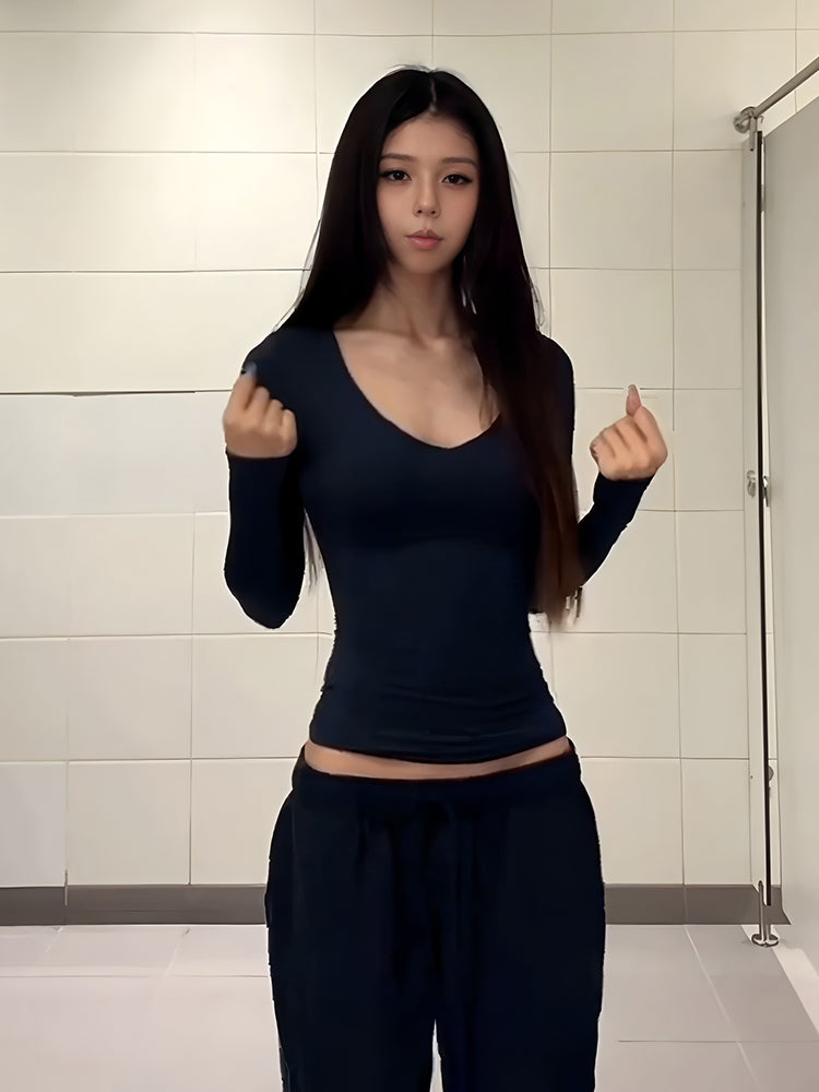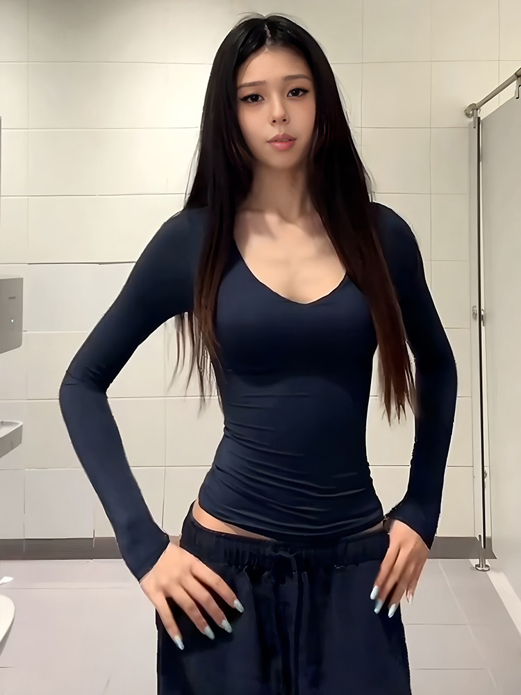 Qadınlar üçün Amerika üslubunda seksual V-yaxalı uzunqol futbolka, 2025-ci ilin payızının əvvəlləri üçün yeni model, incə oturuşlu, elastik bel çəkən köynək.