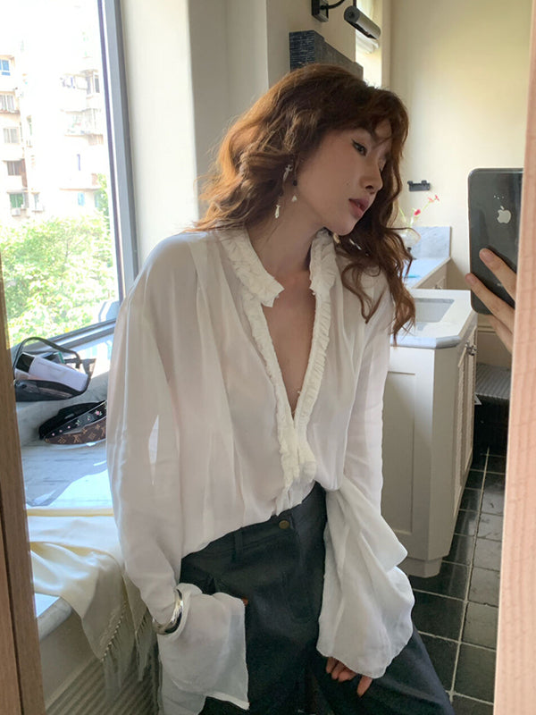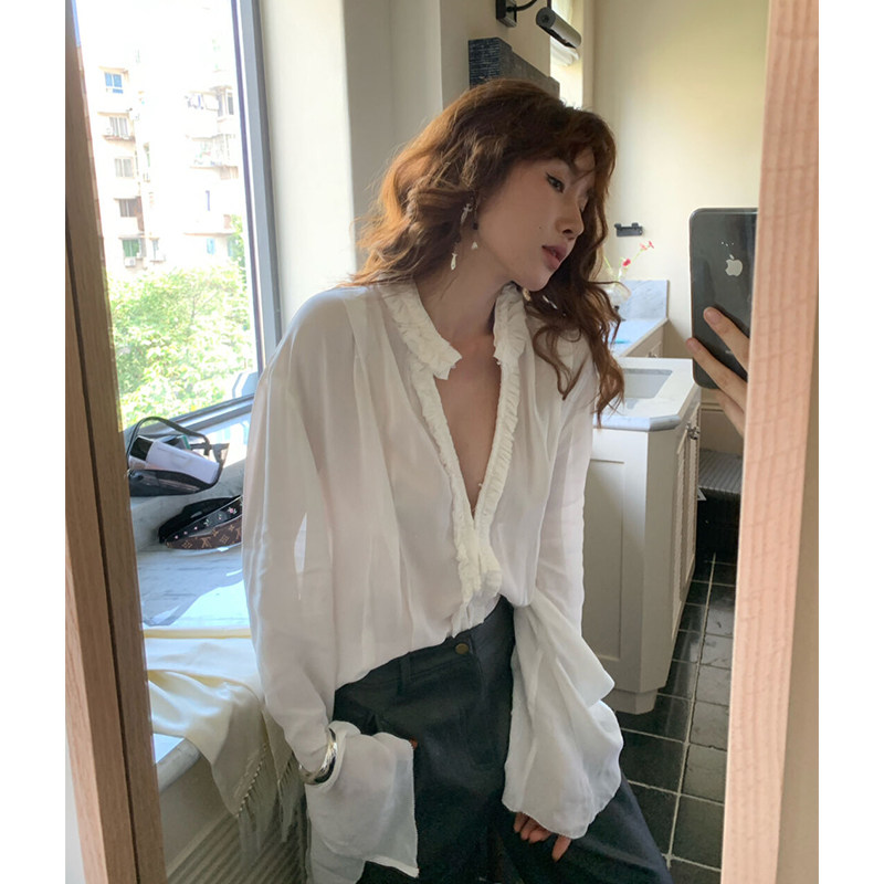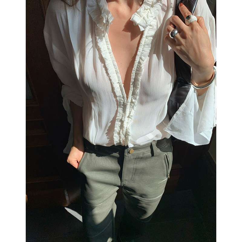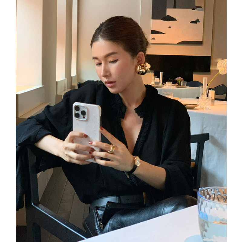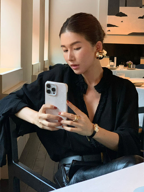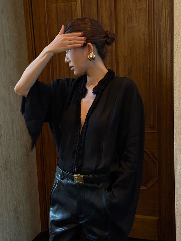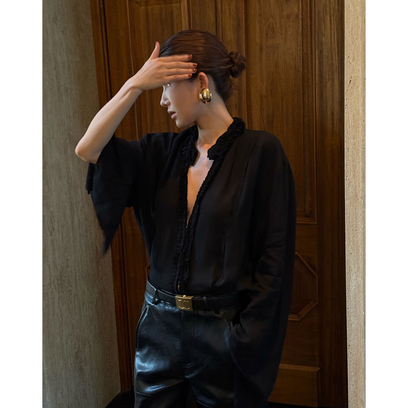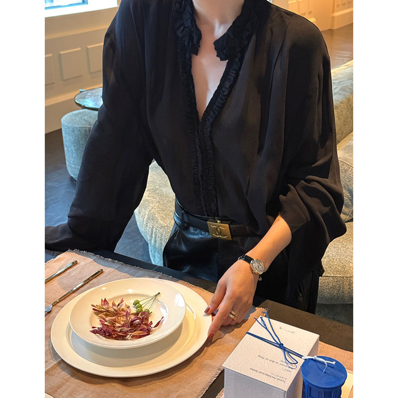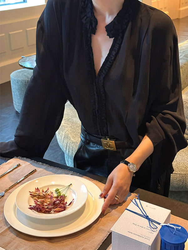 Qadınlar üçün fransız üslubunda dizaynlı, qırışlı haşiyəli, V-yaxalı, qara uzunqol köynək, payız üslubunda, zərif, dəbdəbəli, gənc və şık.