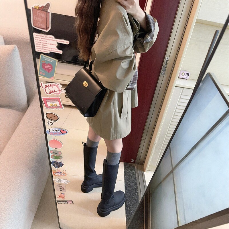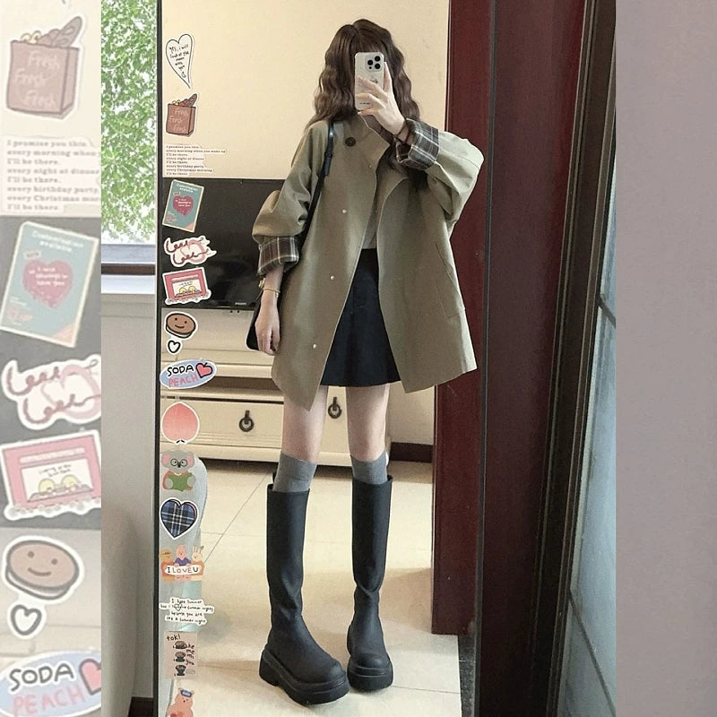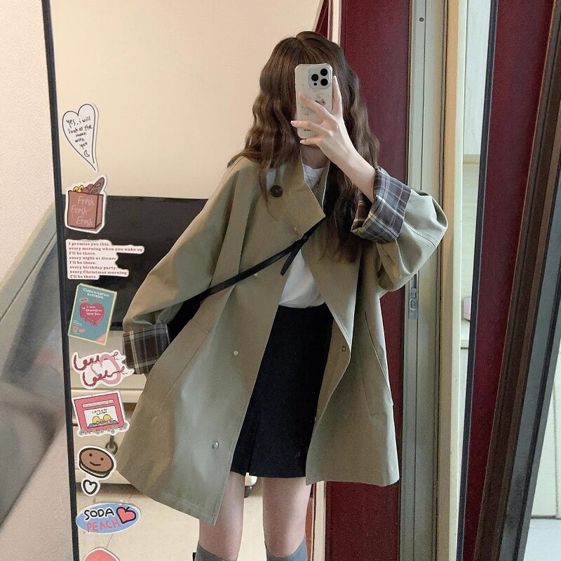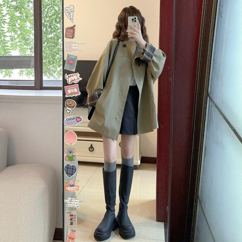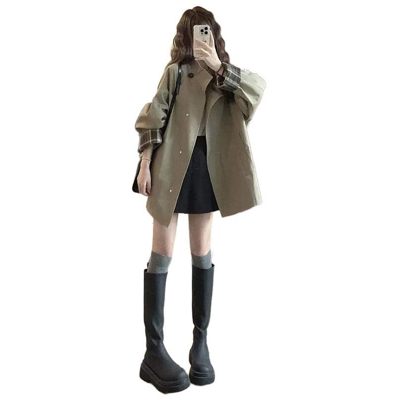 Qadınlar üçün Koreya üslubunda trençkot, Britaniya üslubunda, yeni 2026-cı ilin yazı, böyük ölçülü, böyük ölçülü qadınlar üçün zərif ayaq üstə yaxalıqlı qısa dəbli palto.