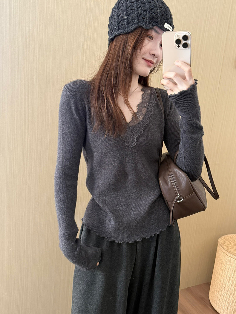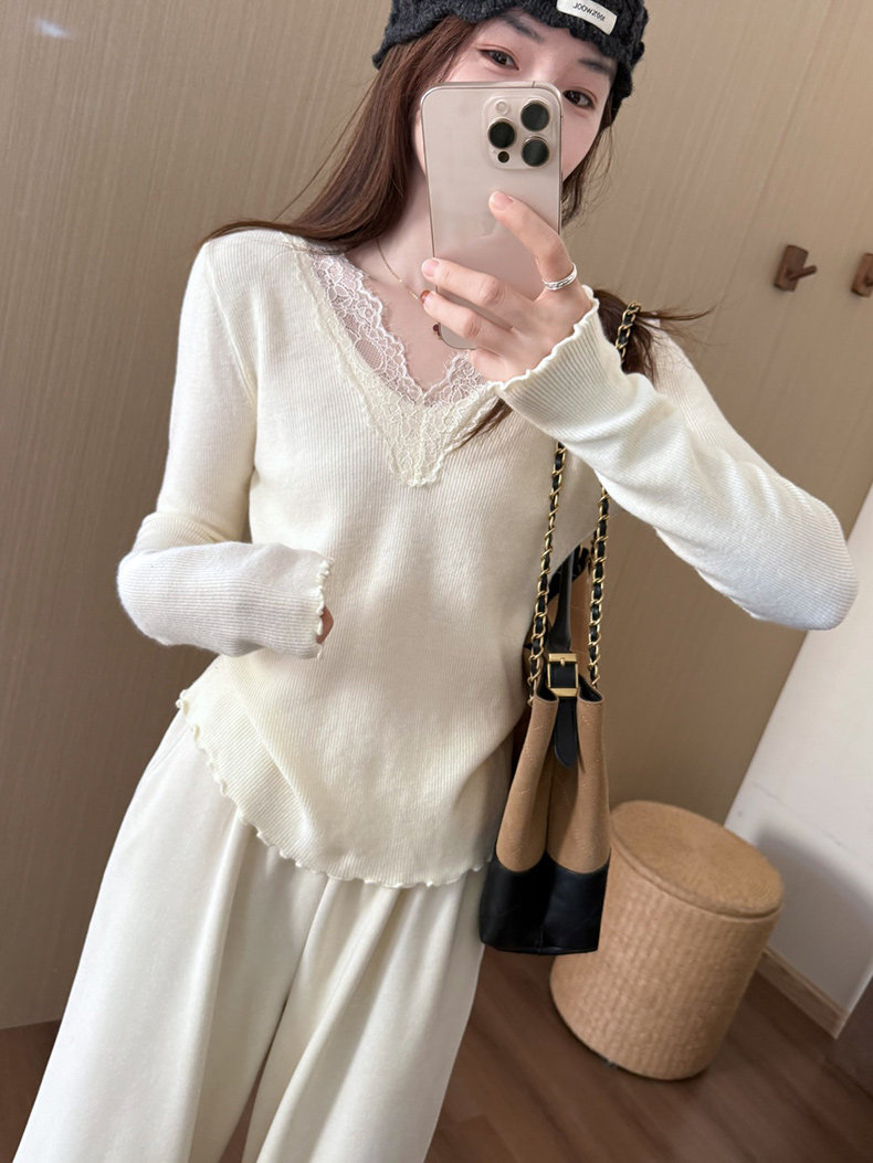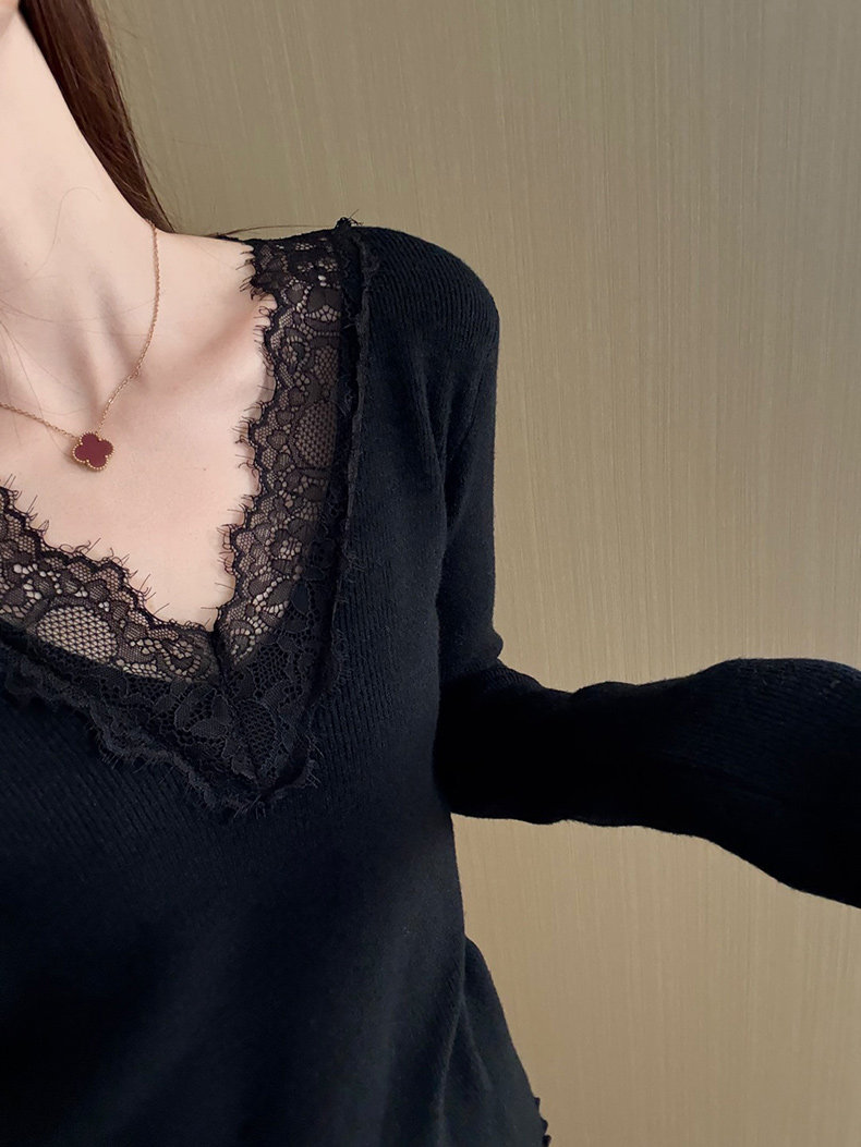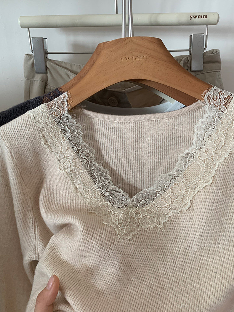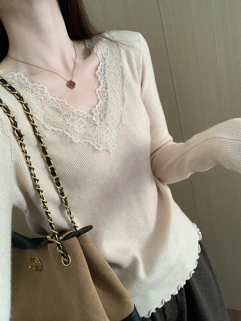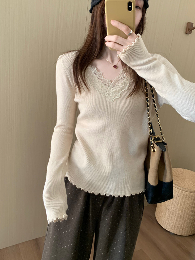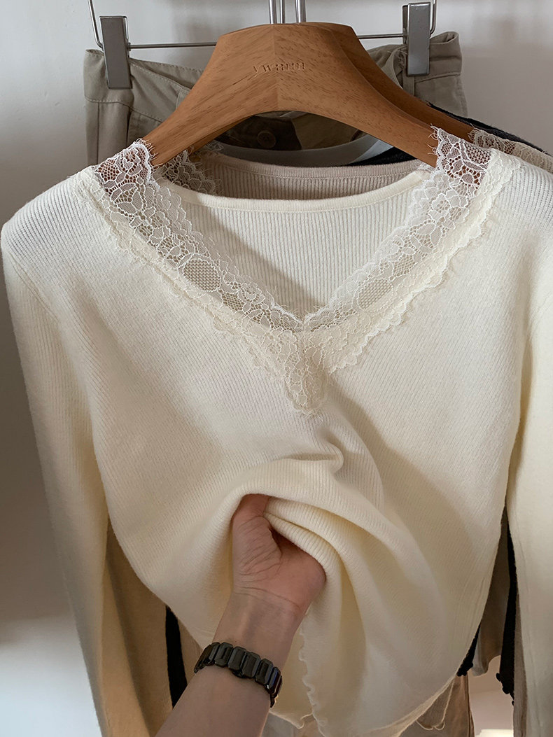 Qadınlar üçün sadə rəngli V-formalı krujeva əsas qatlı top, 2025 payız yeni Koreya üslubunda sadə üslublu daxili qatlı top.