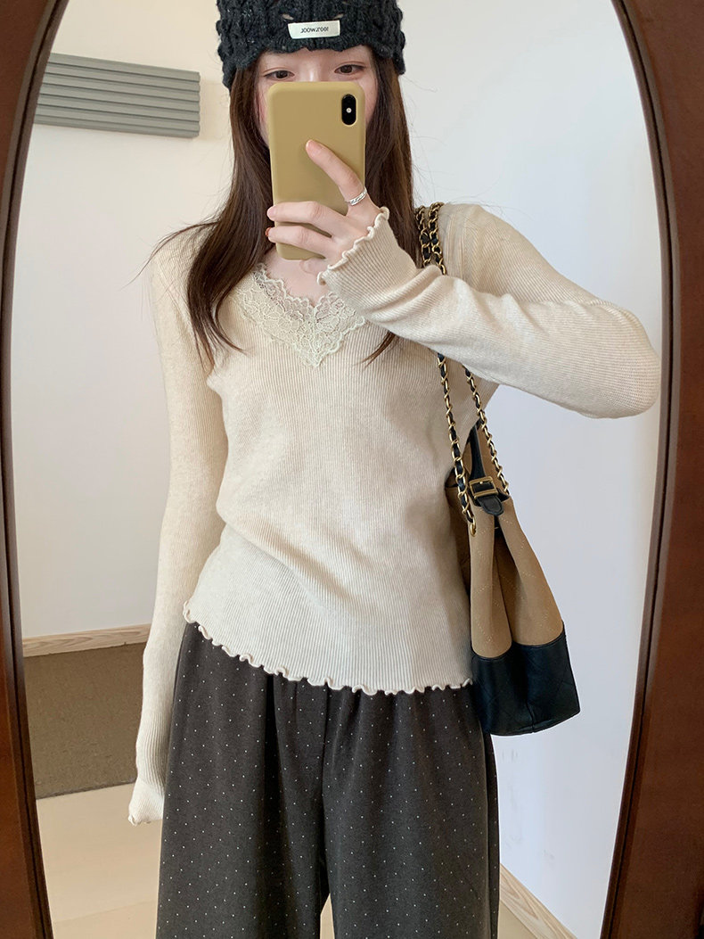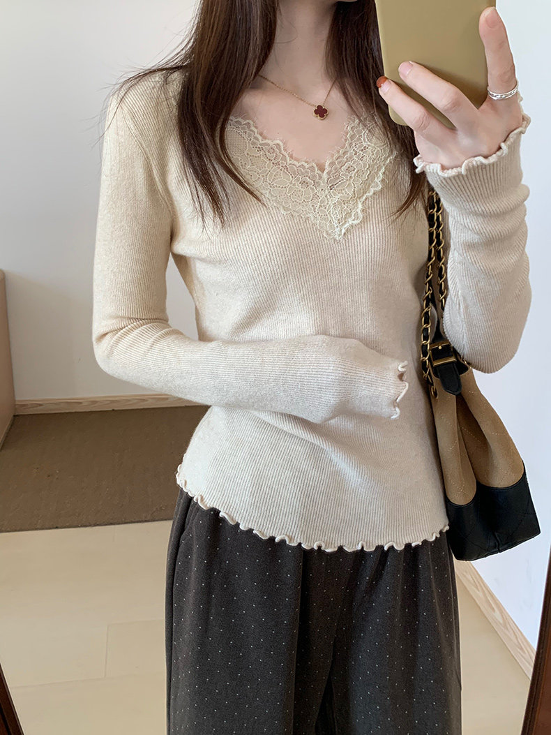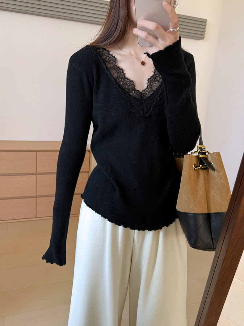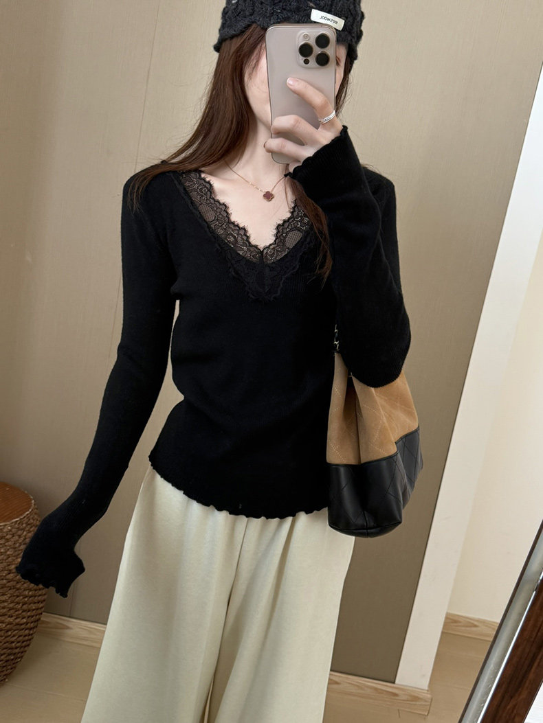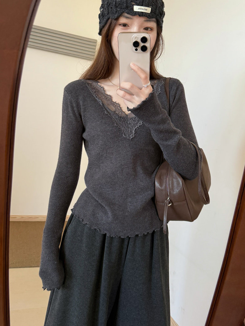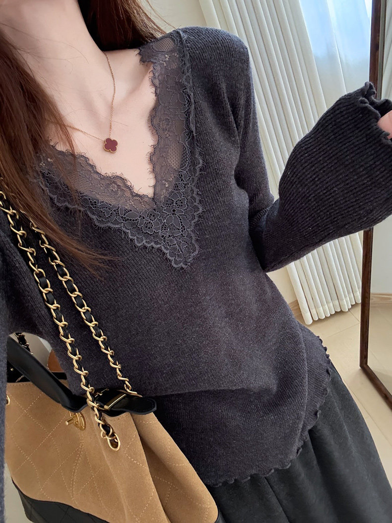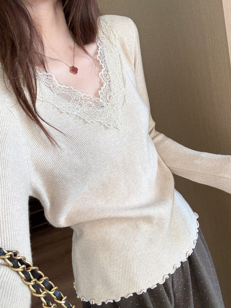 Qadınlar üçün sadə rəngli V-formalı krujeva əsas qatlı top, 2025 payız yeni Koreya üslubunda sadə üslublu daxili qatlı top.