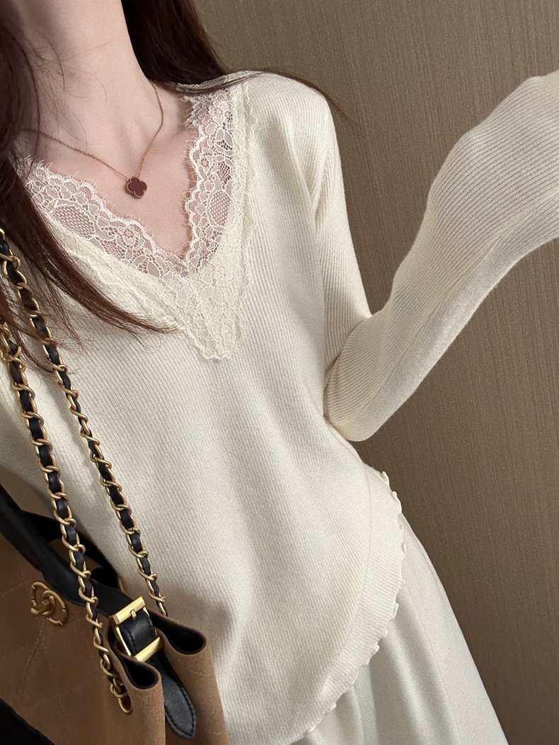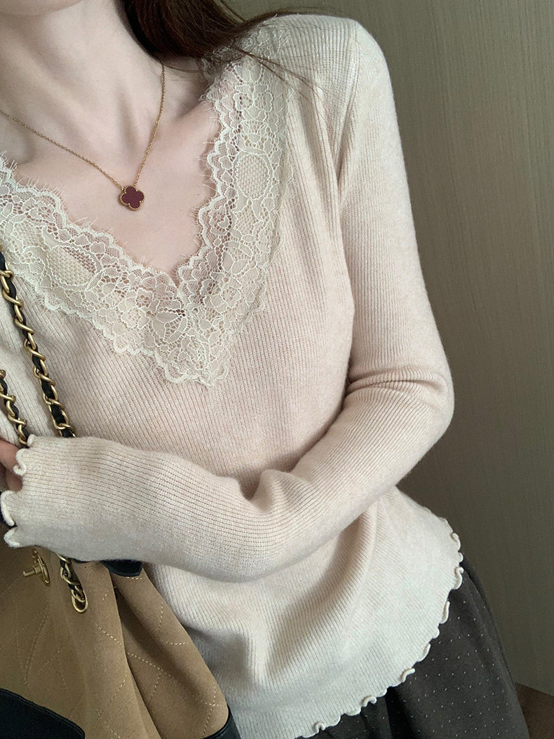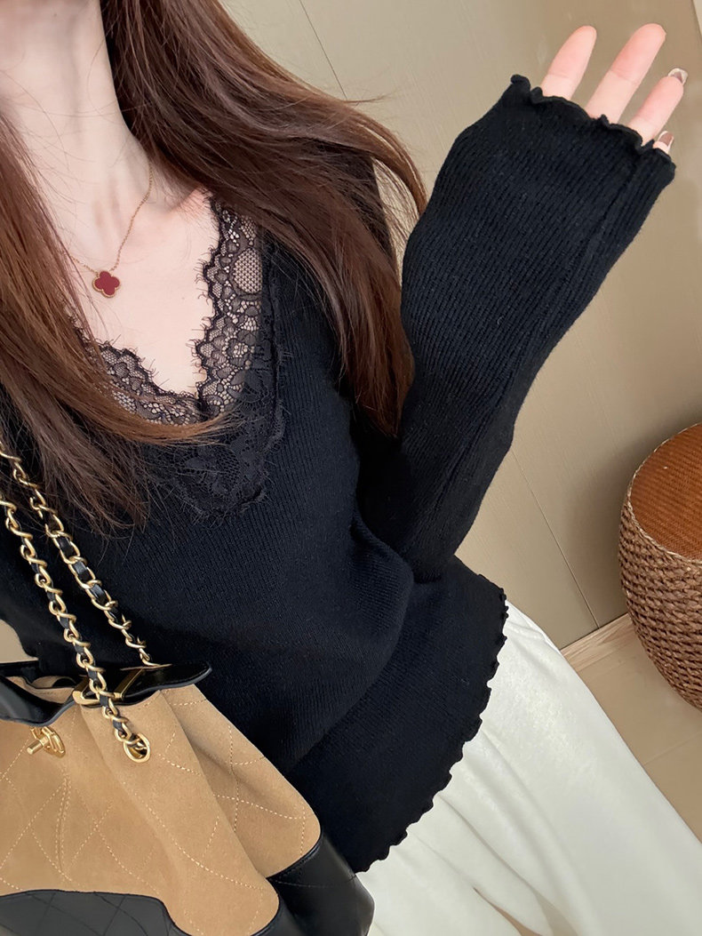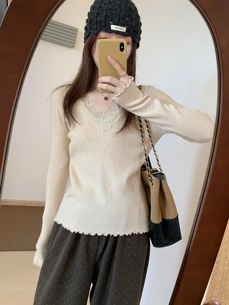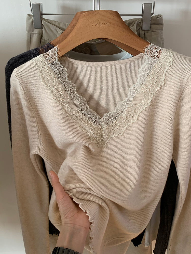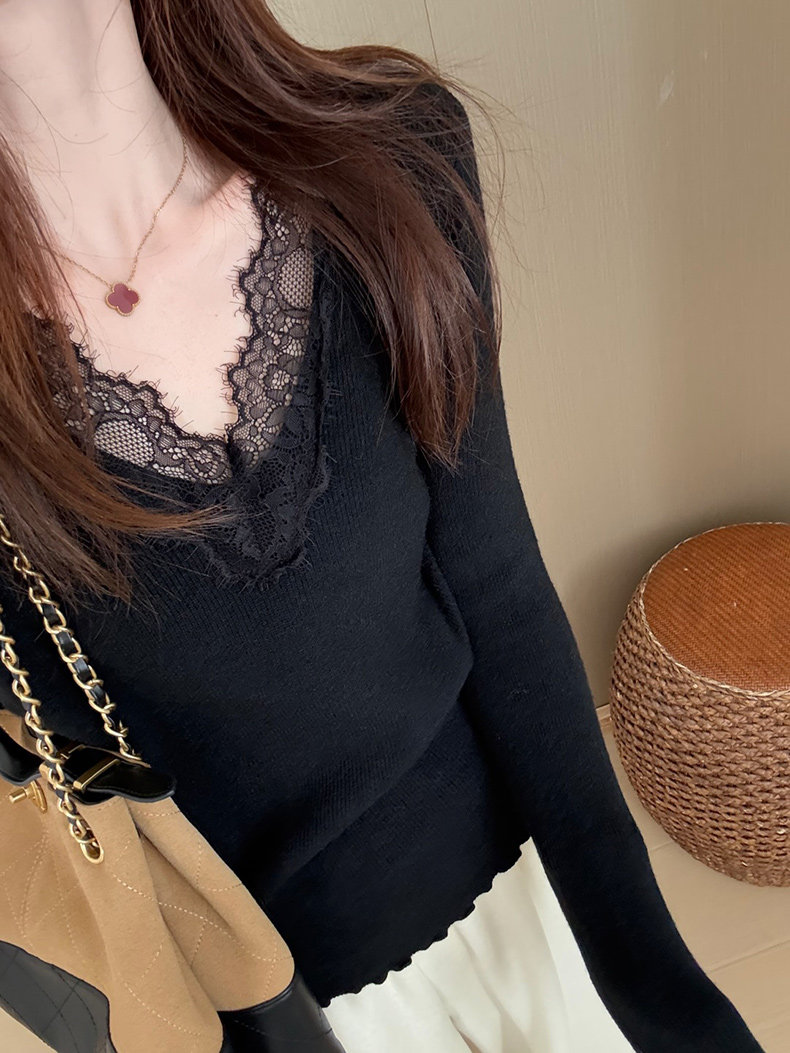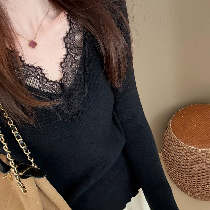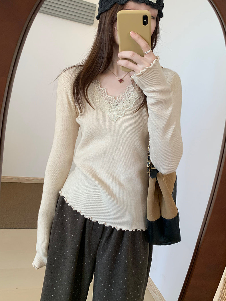 Qadınlar üçün sadə rəngli V-formalı krujeva əsas qatlı top, 2025 payız yeni Koreya üslubunda sadə üslublu daxili qatlı top.