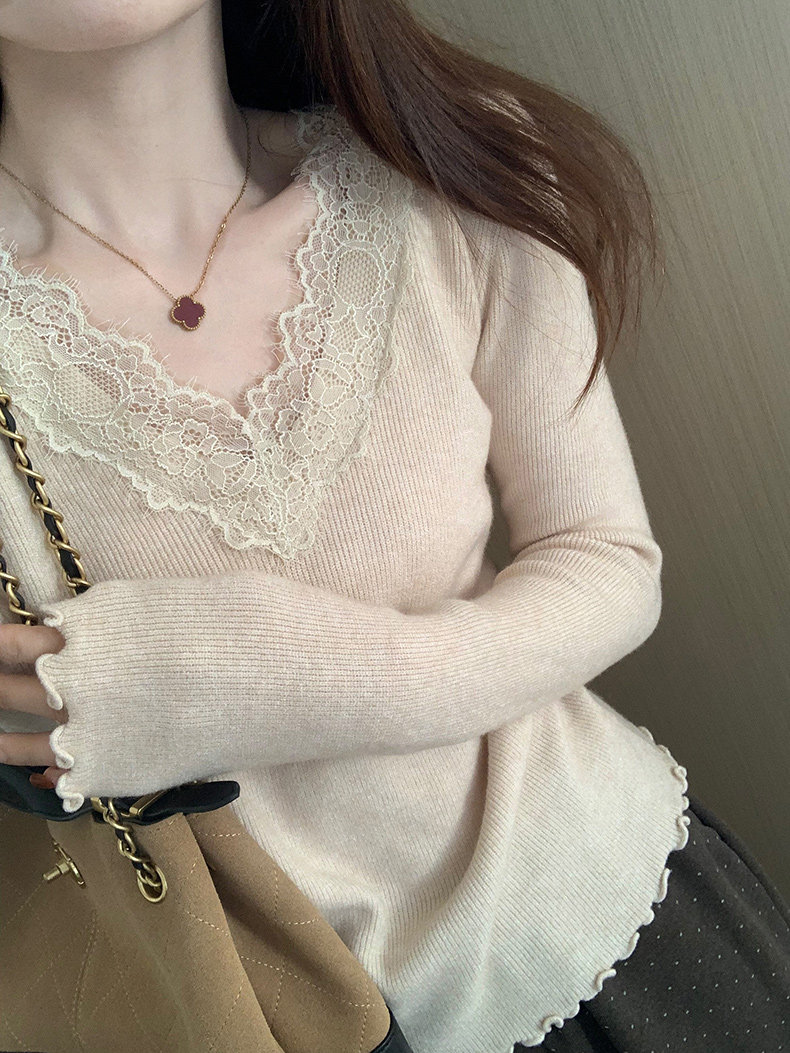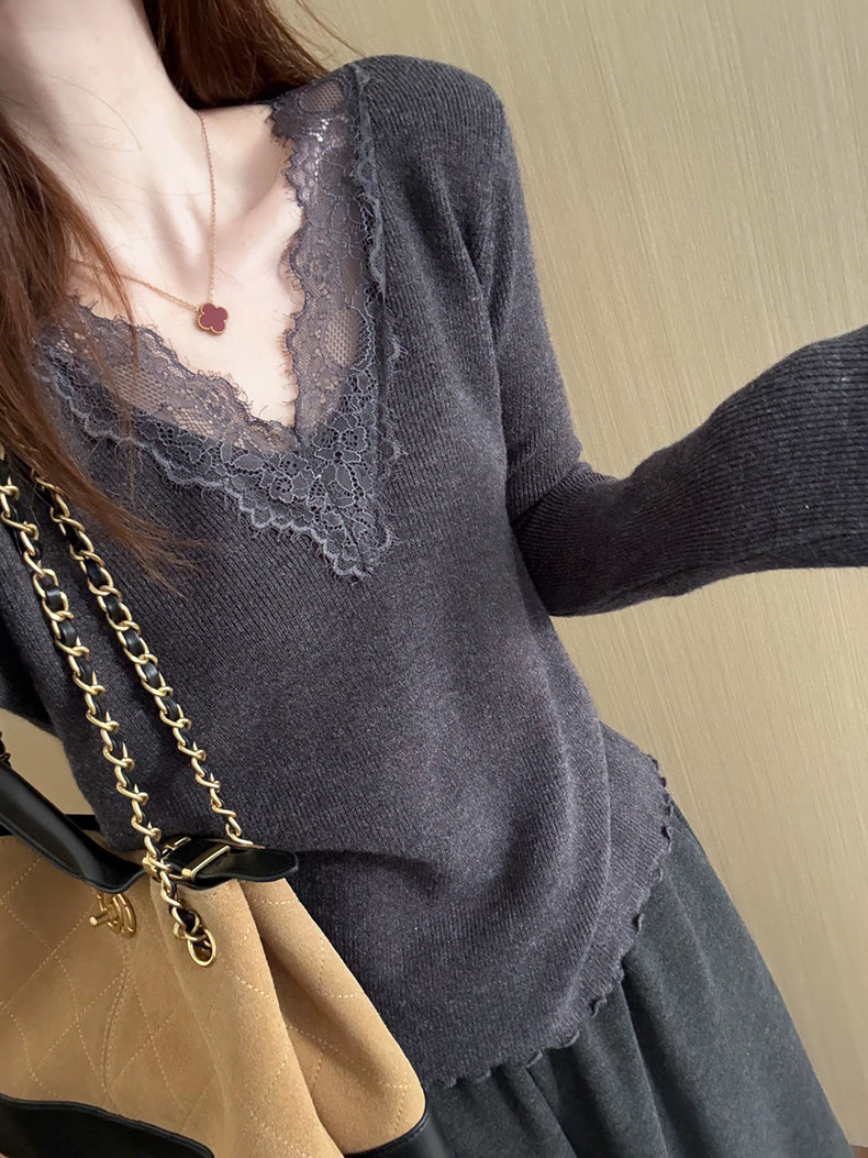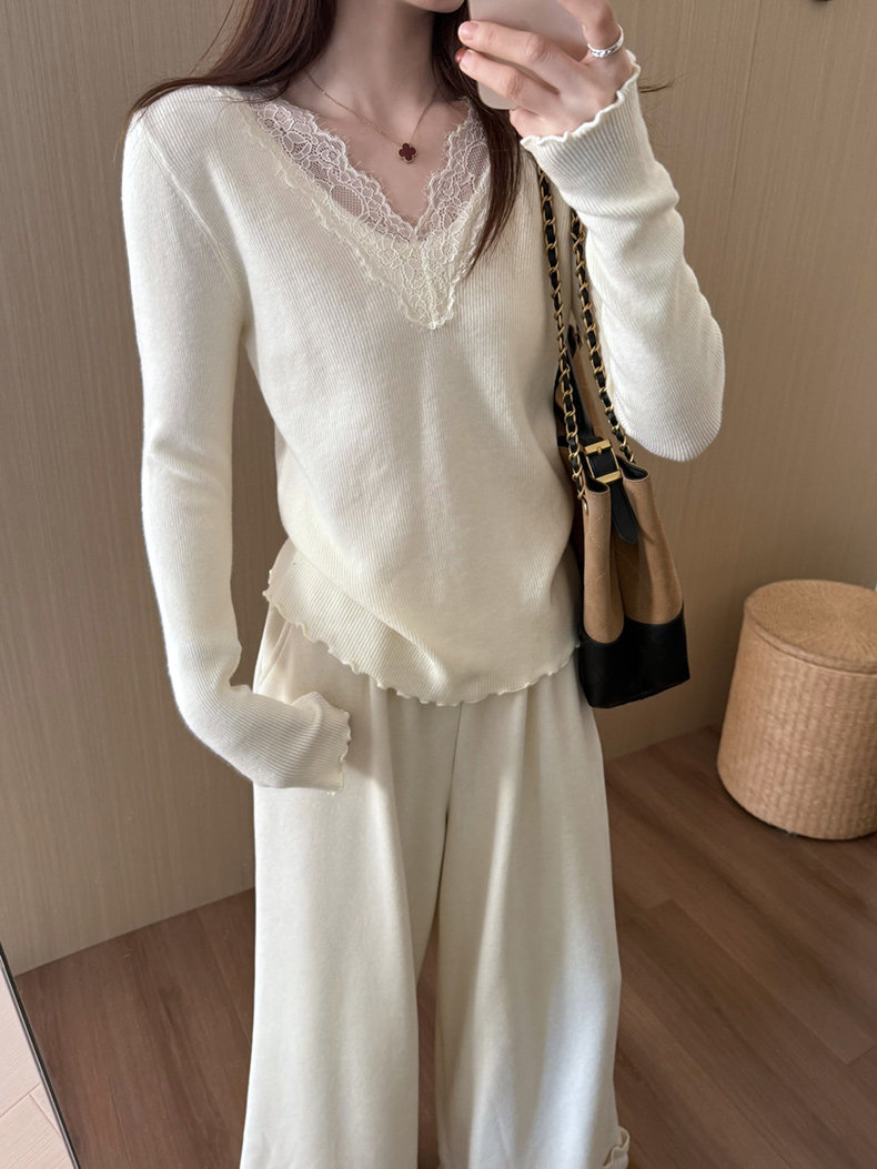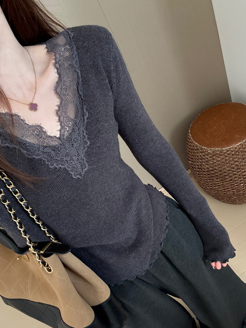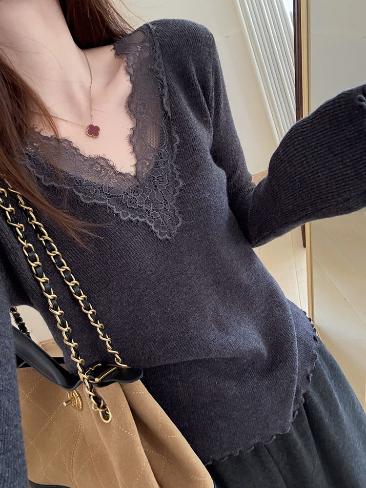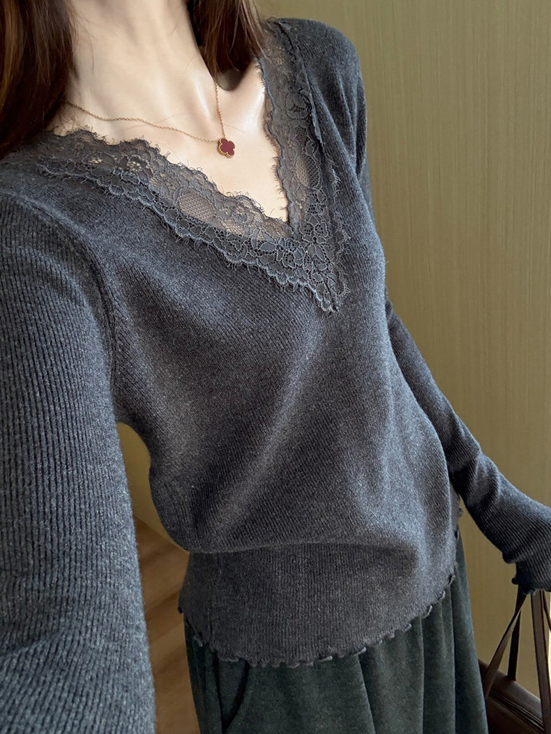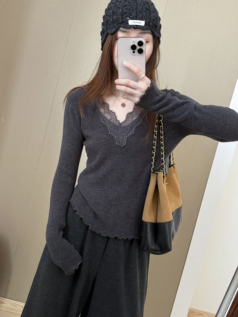 Qadınlar üçün sadə rəngli V-formalı krujeva əsas qatlı top, 2025 payız yeni Koreya üslubunda sadə üslublu daxili qatlı top.