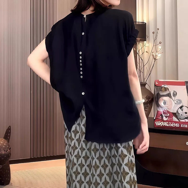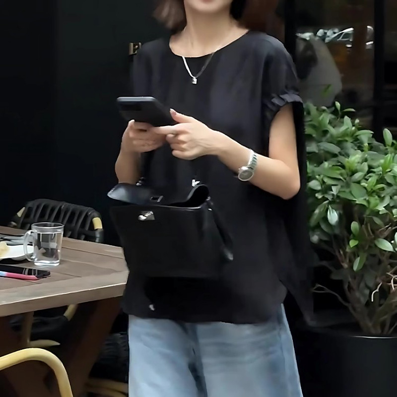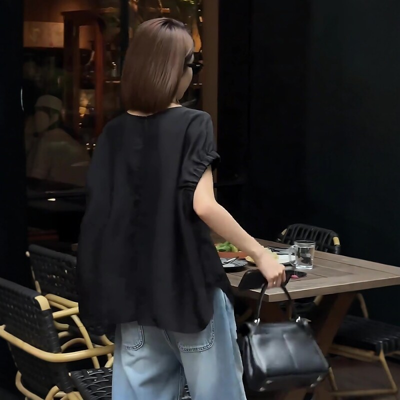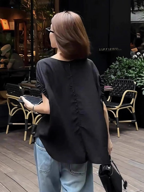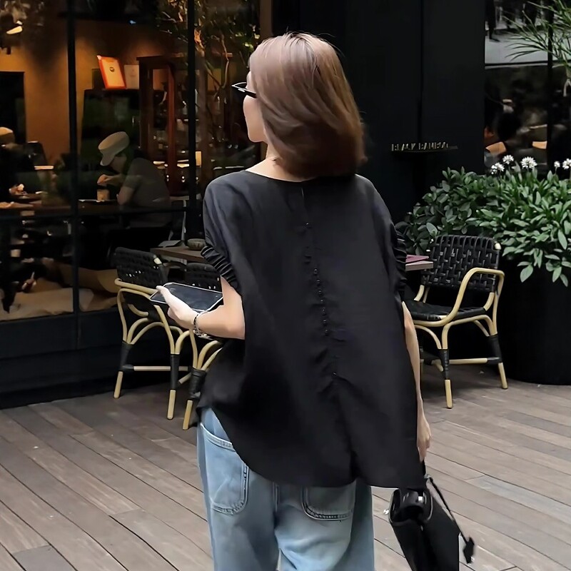 Qara qısaqol, arxa düyməli köynək, böyük ölçülü qadınlar üçün uyğundur, yay üçün idealdır. İncə, geniş, şık və zərif.