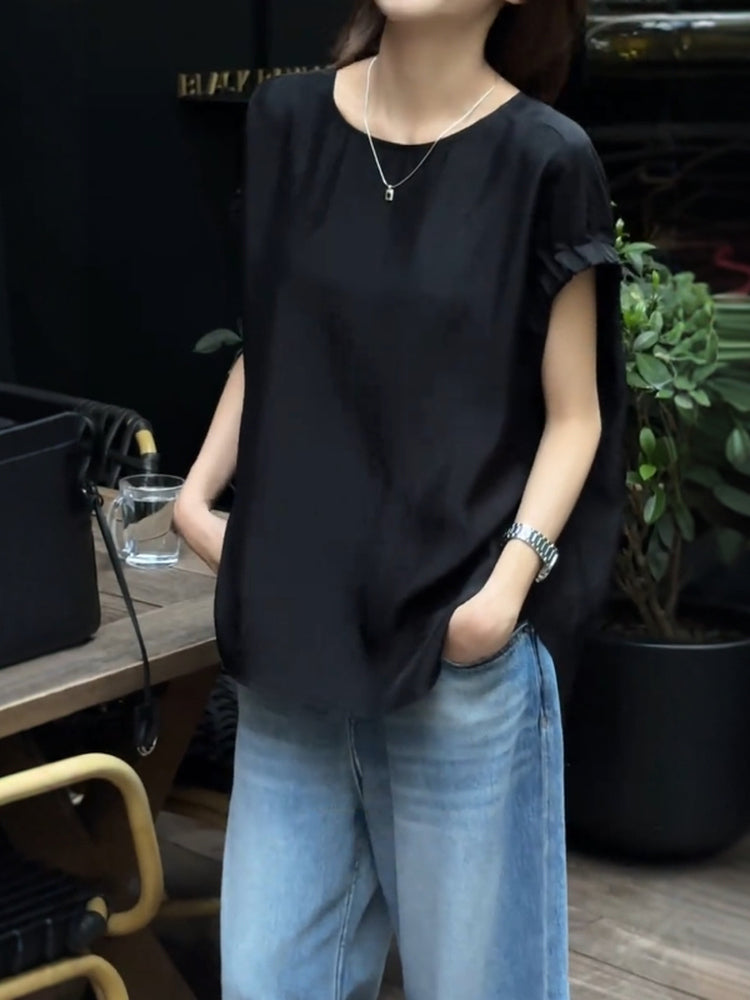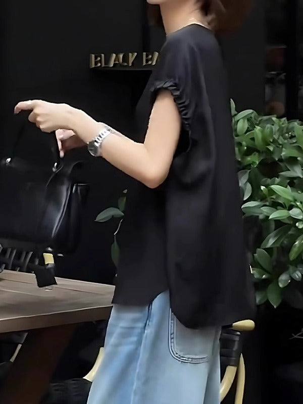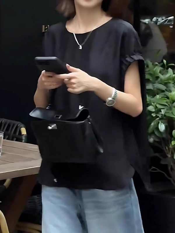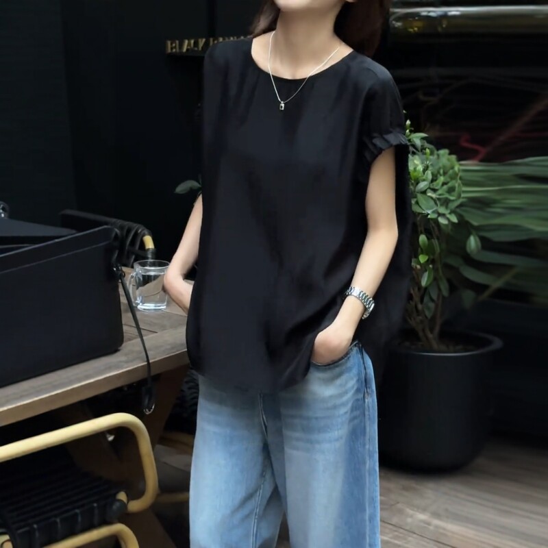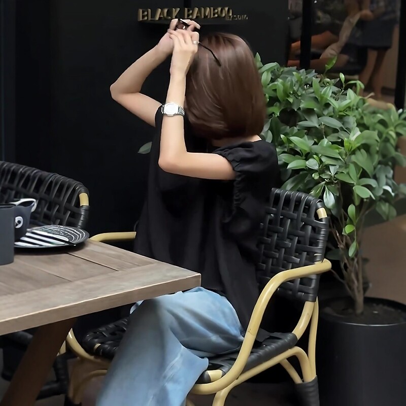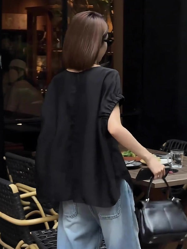 Qara qısaqol, arxa düyməli köynək, böyük ölçülü qadınlar üçün uyğundur, yay üçün idealdır. İncə, geniş, şık və zərif.