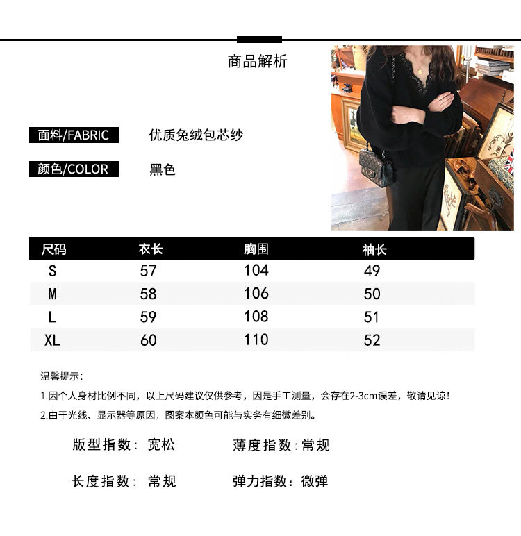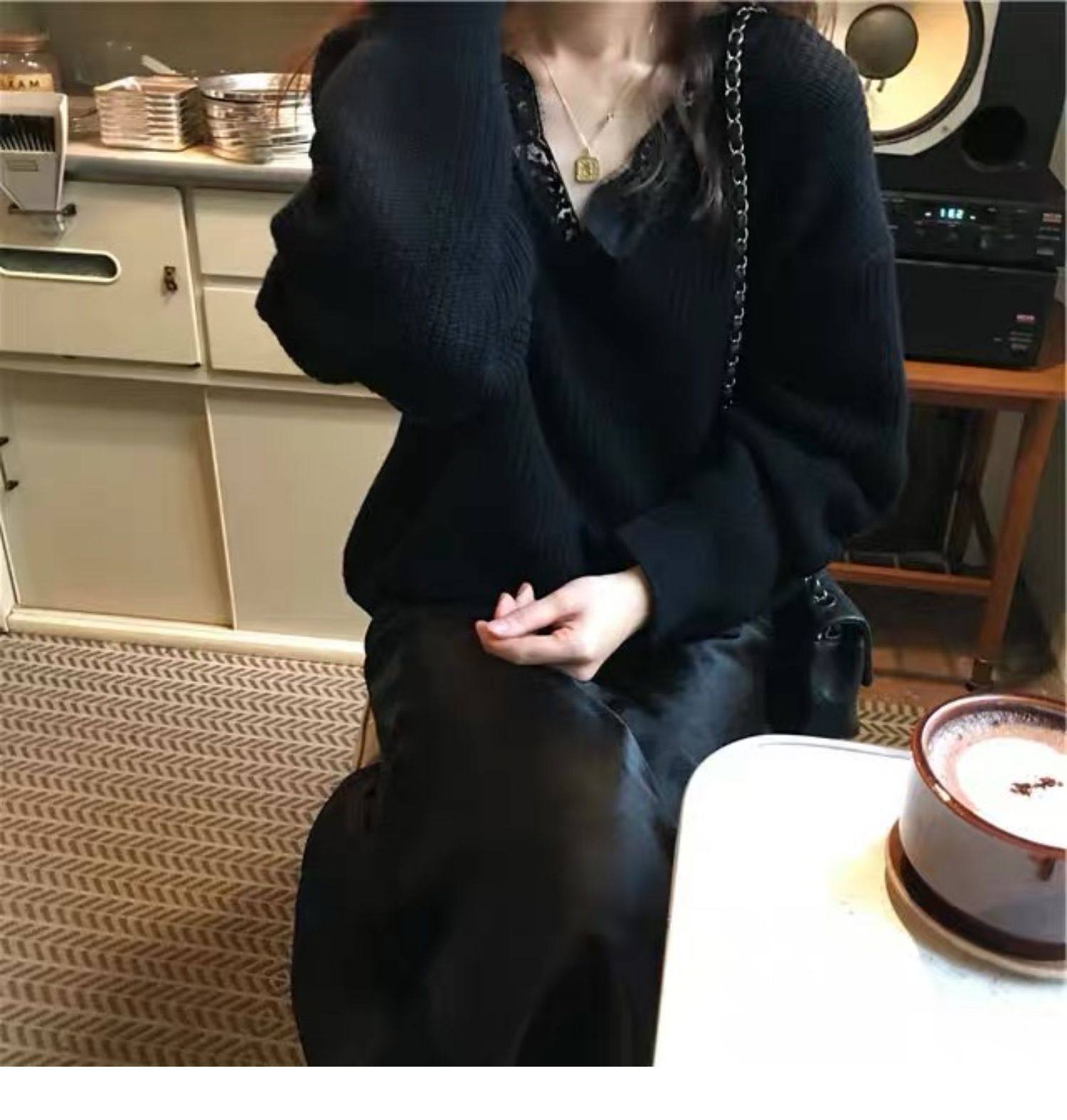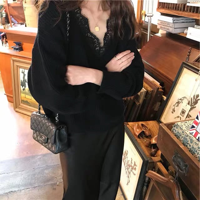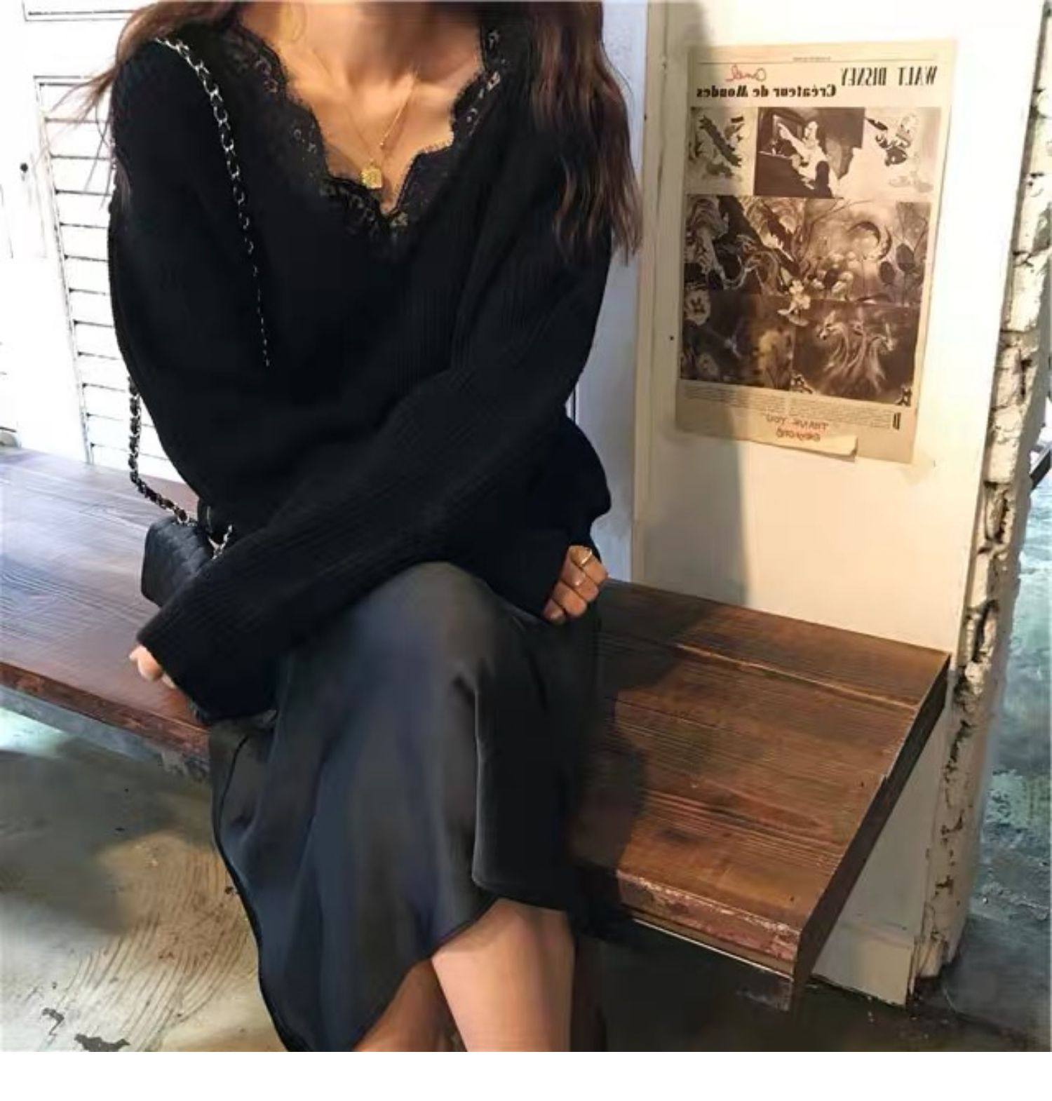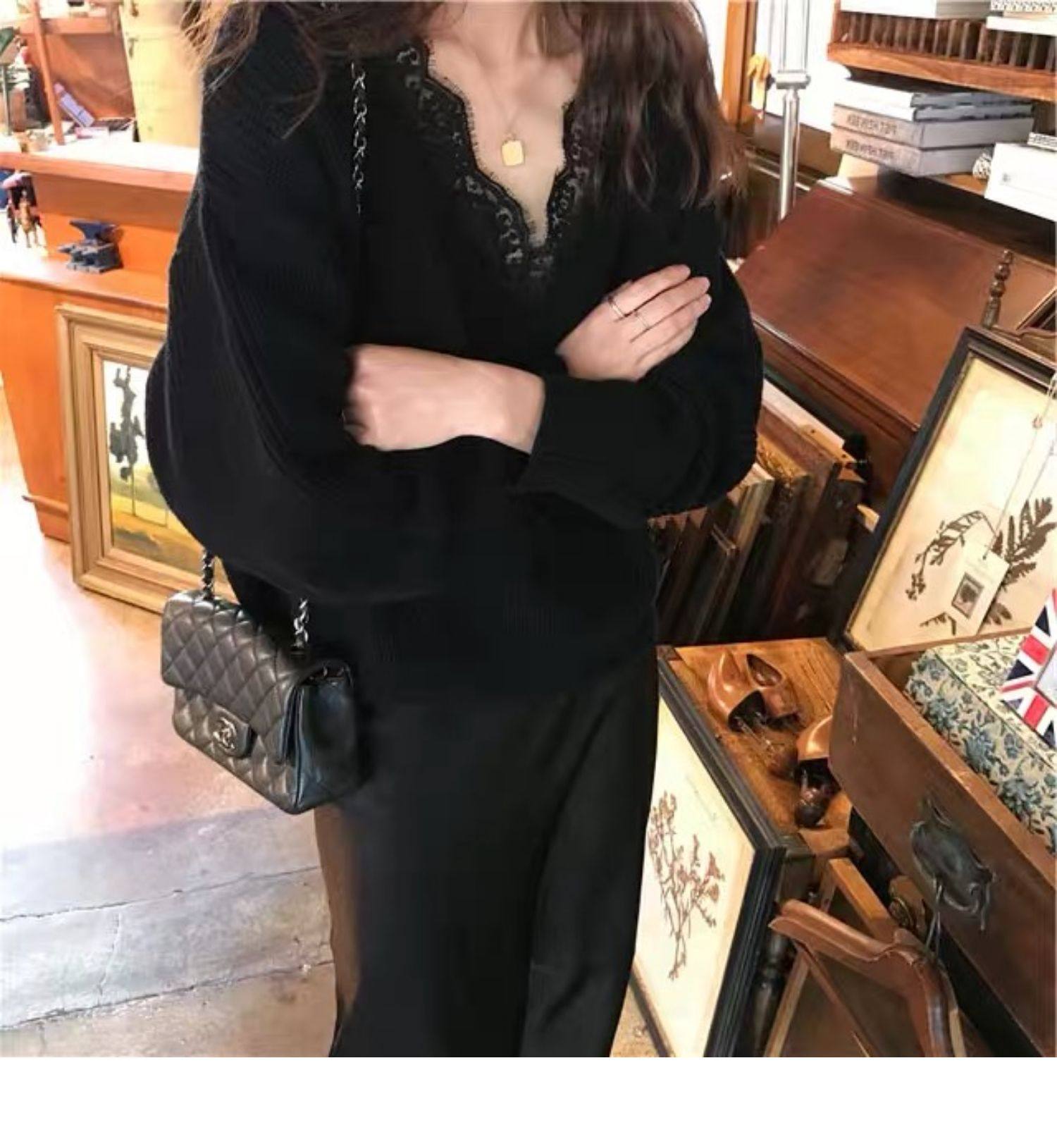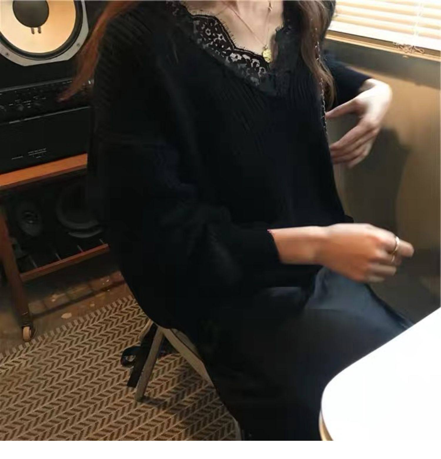 Qara rəngli krujeva ilə bəzədilmiş V-yaxalı toxunma sviter, qadın sviteri, payız və qış üçün geniş üst geyimi, iç geyimi.