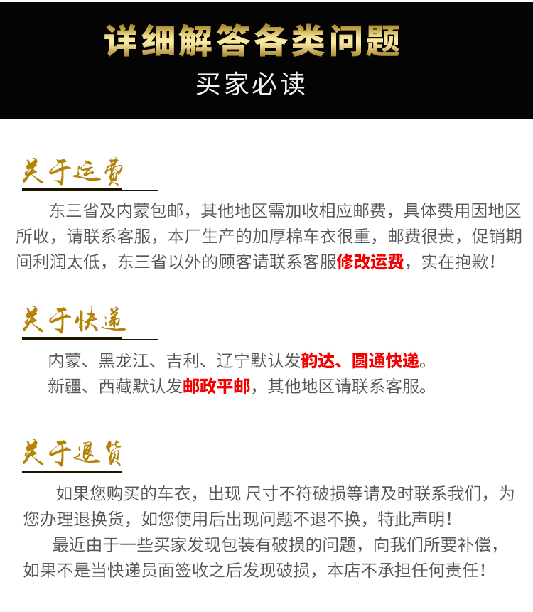 温馨提示:东北半罩棉车衣,由于采用牛津布材质,采用针线缝制工艺,可能存在针眼,不支持防水,如果有防水要求的客户请慎拍!