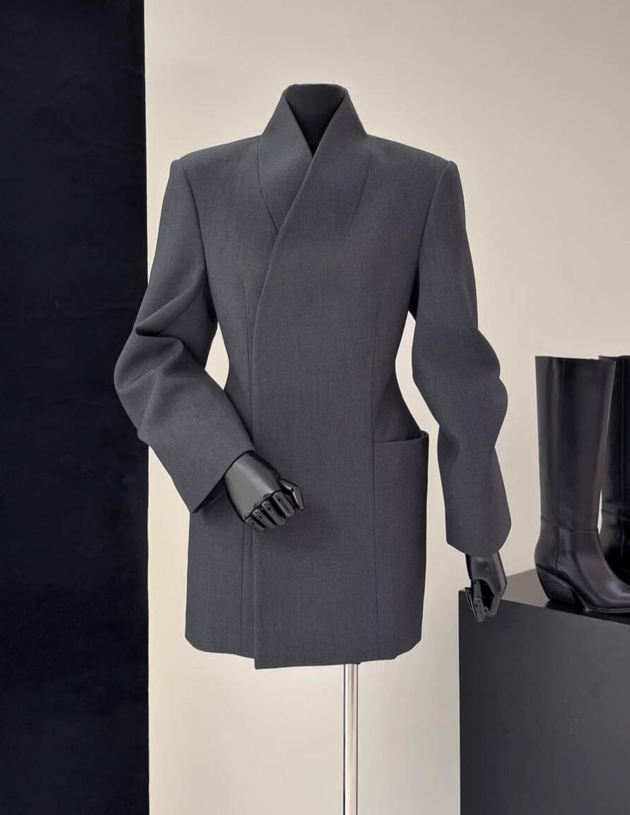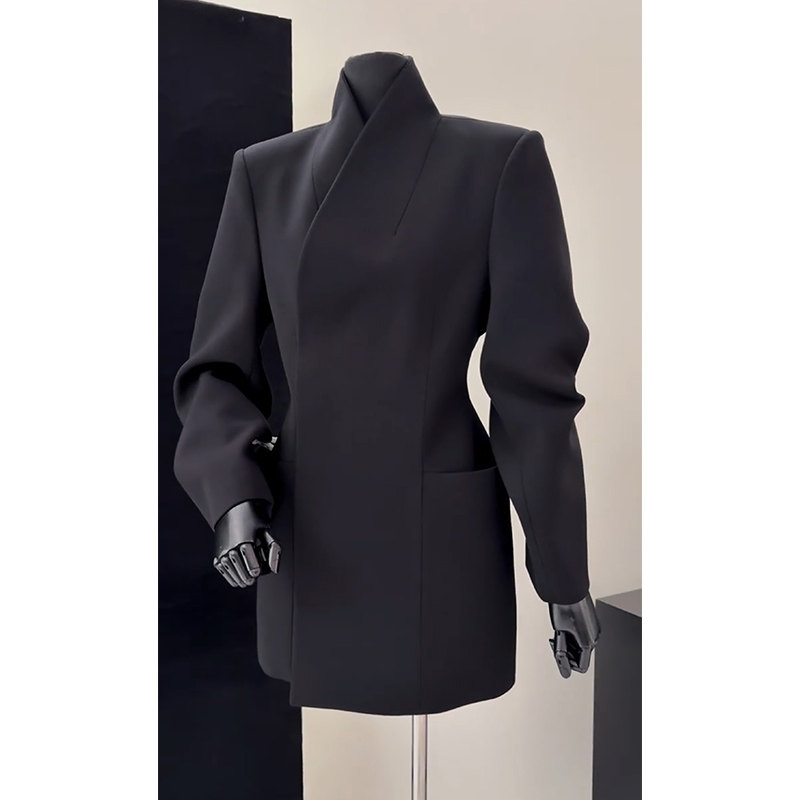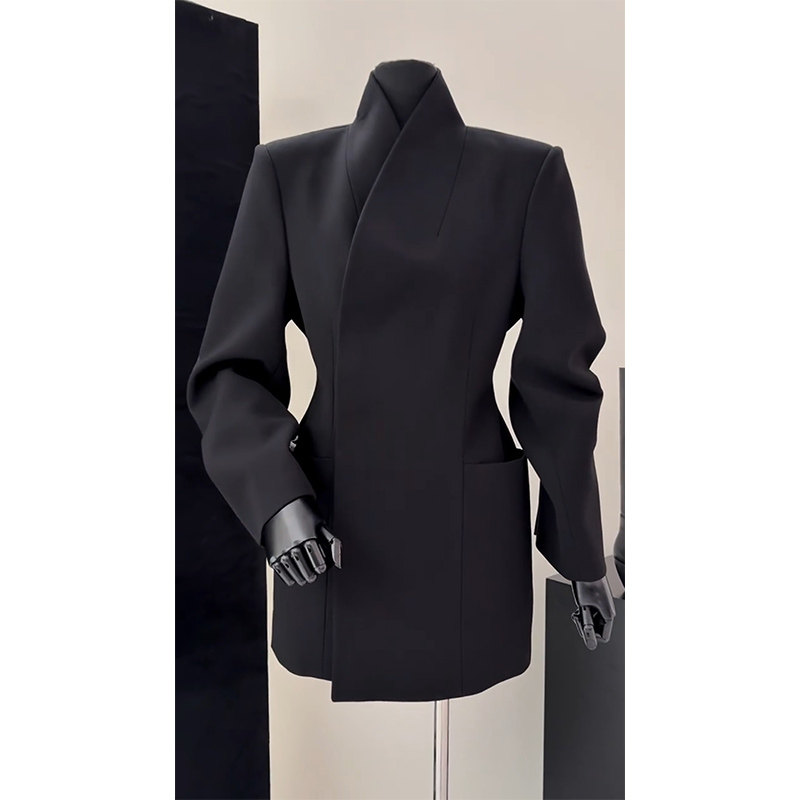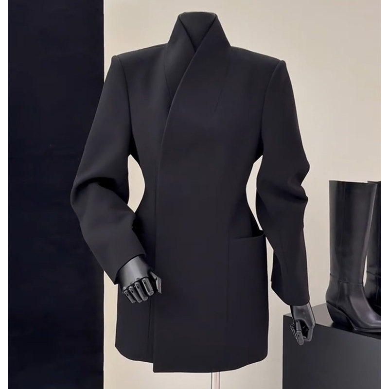 Qışın əvvəlləri üçün Hepburn üslubunda hazırlanmış möhtəşəm qara rəngli dayaq yaxalı blazer, incə bədənli qadınlar və peşəkar səyahətlər üçün idealdır.