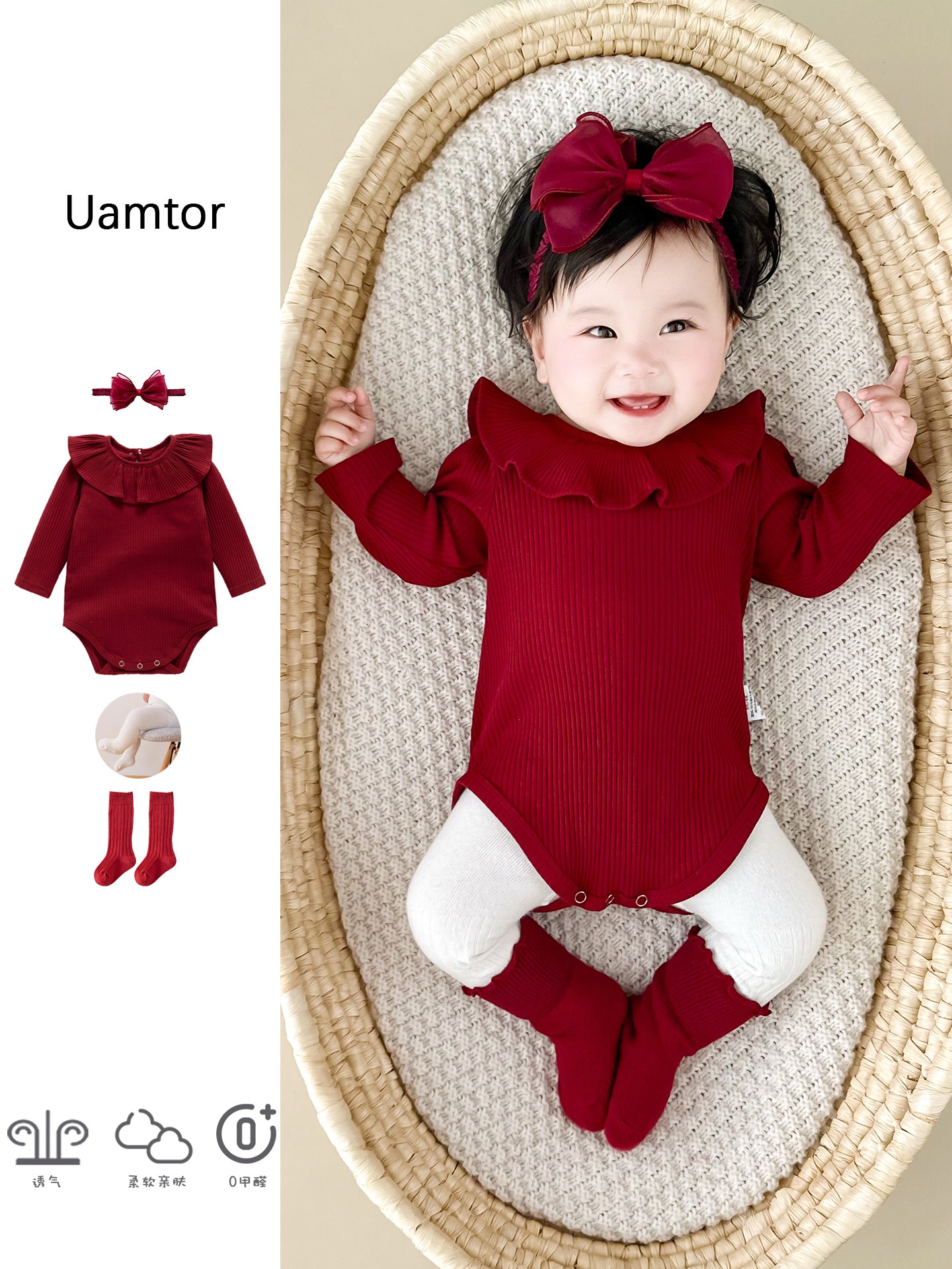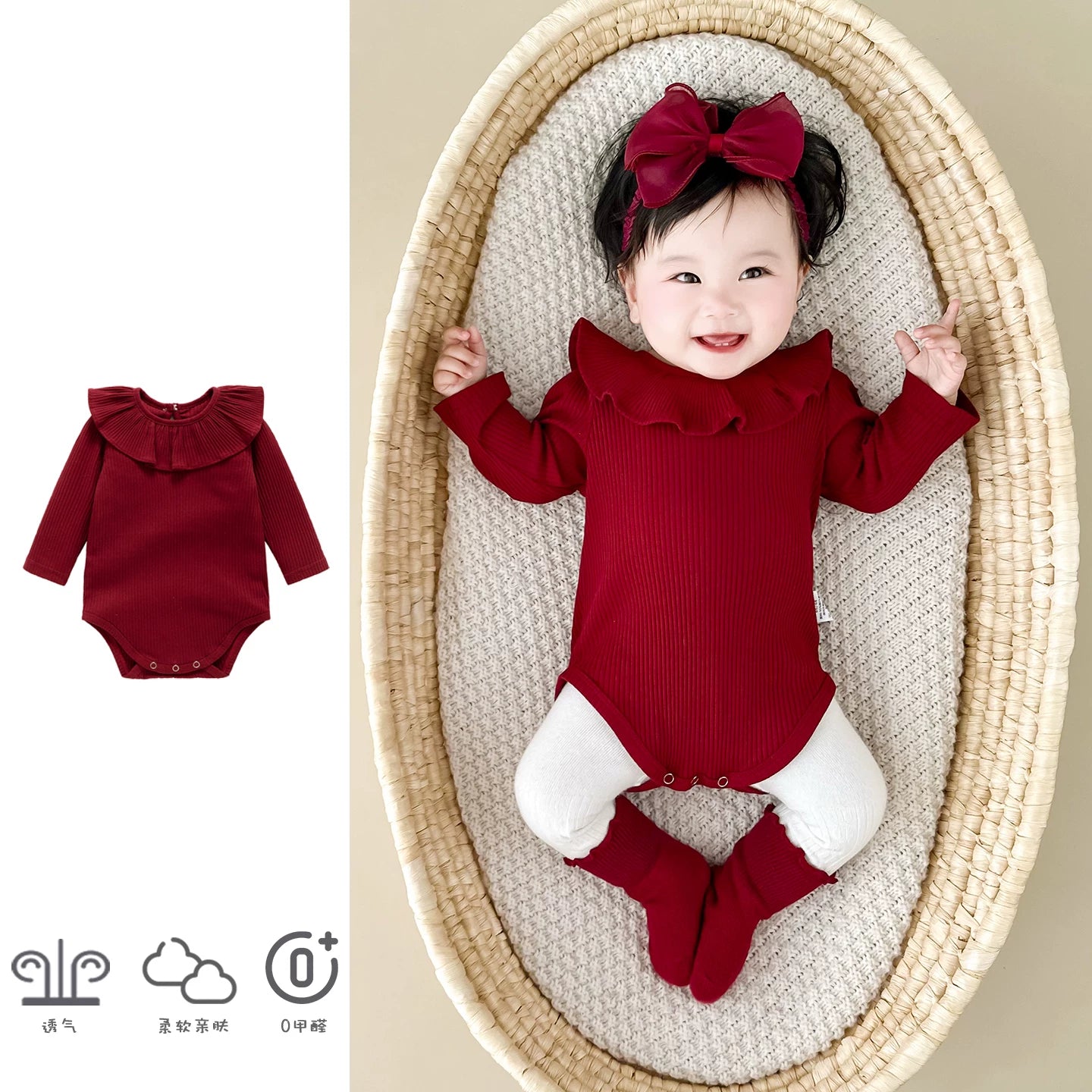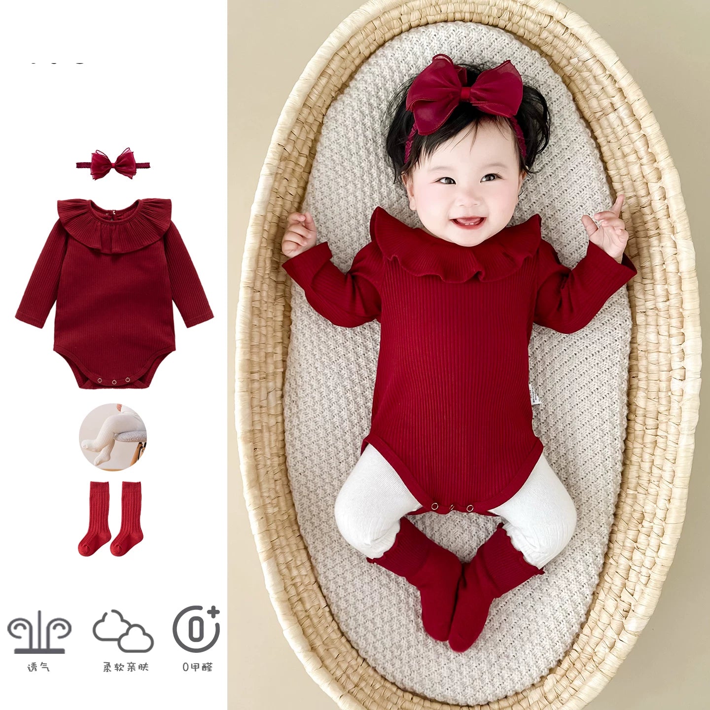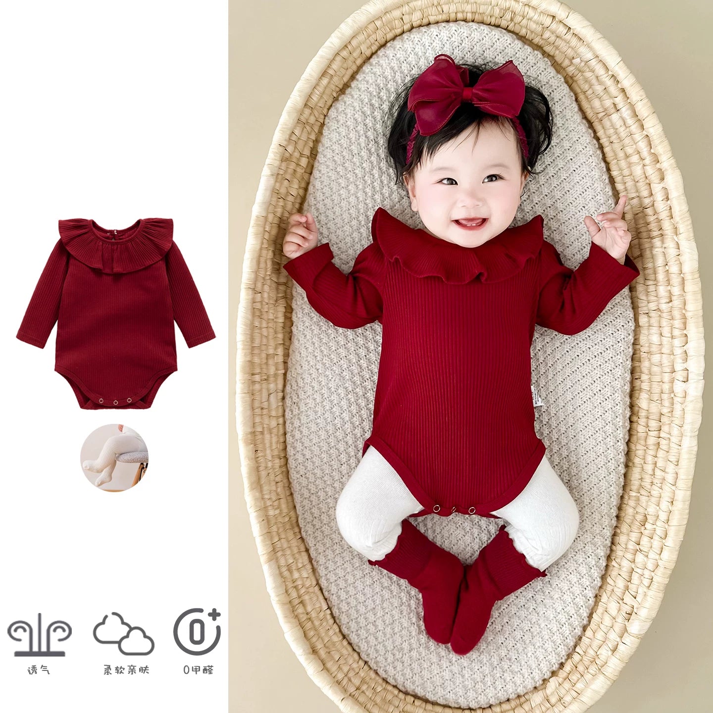 Qızlar üçün Fransız Uamtor Payız Körpə Onesi, Tam Ay/100 Günlük Şahzadə Romperi, Qırmızı Bəzəkli Kostyum