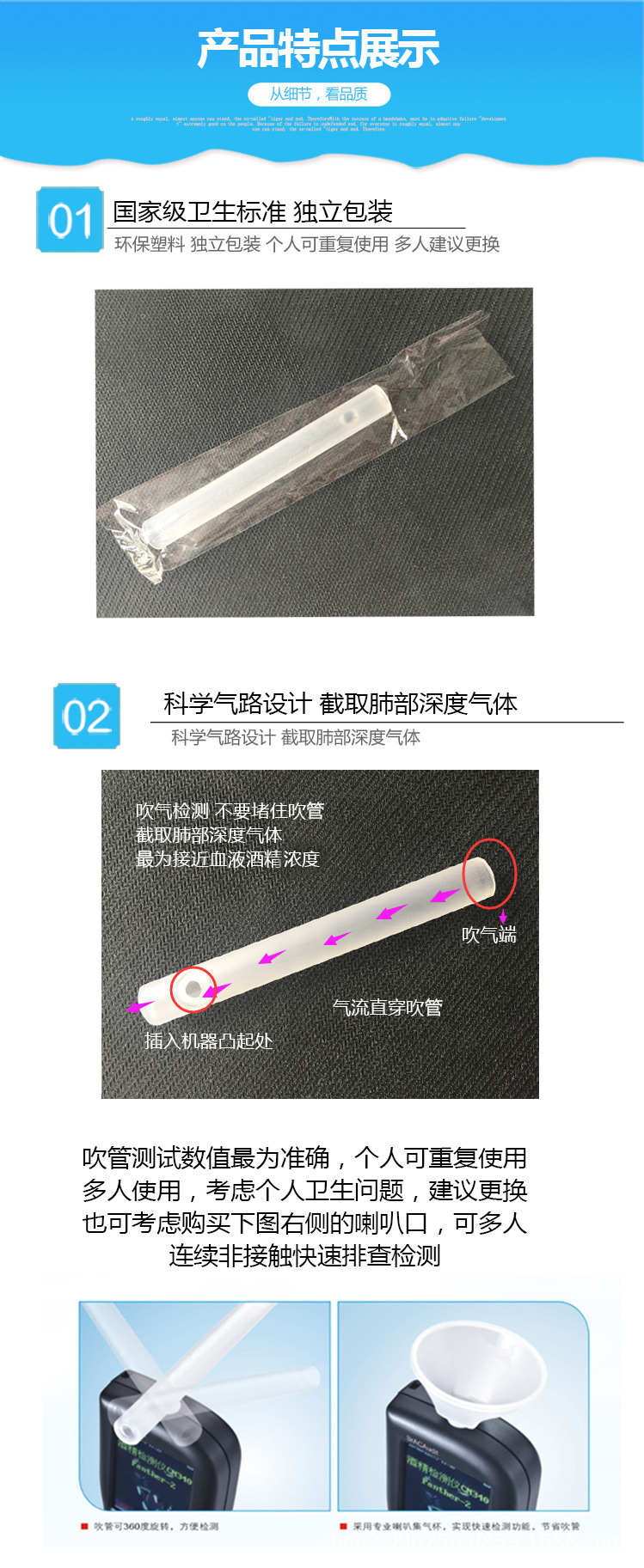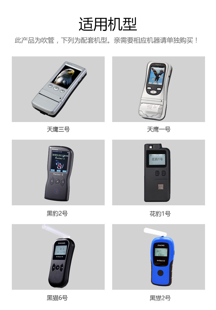 1、本吹管适用酒精检测仪吹管:如天鹰1号,天鹰3号,花豹3号,花豹2号,黑豹二号、花豹一号等等;