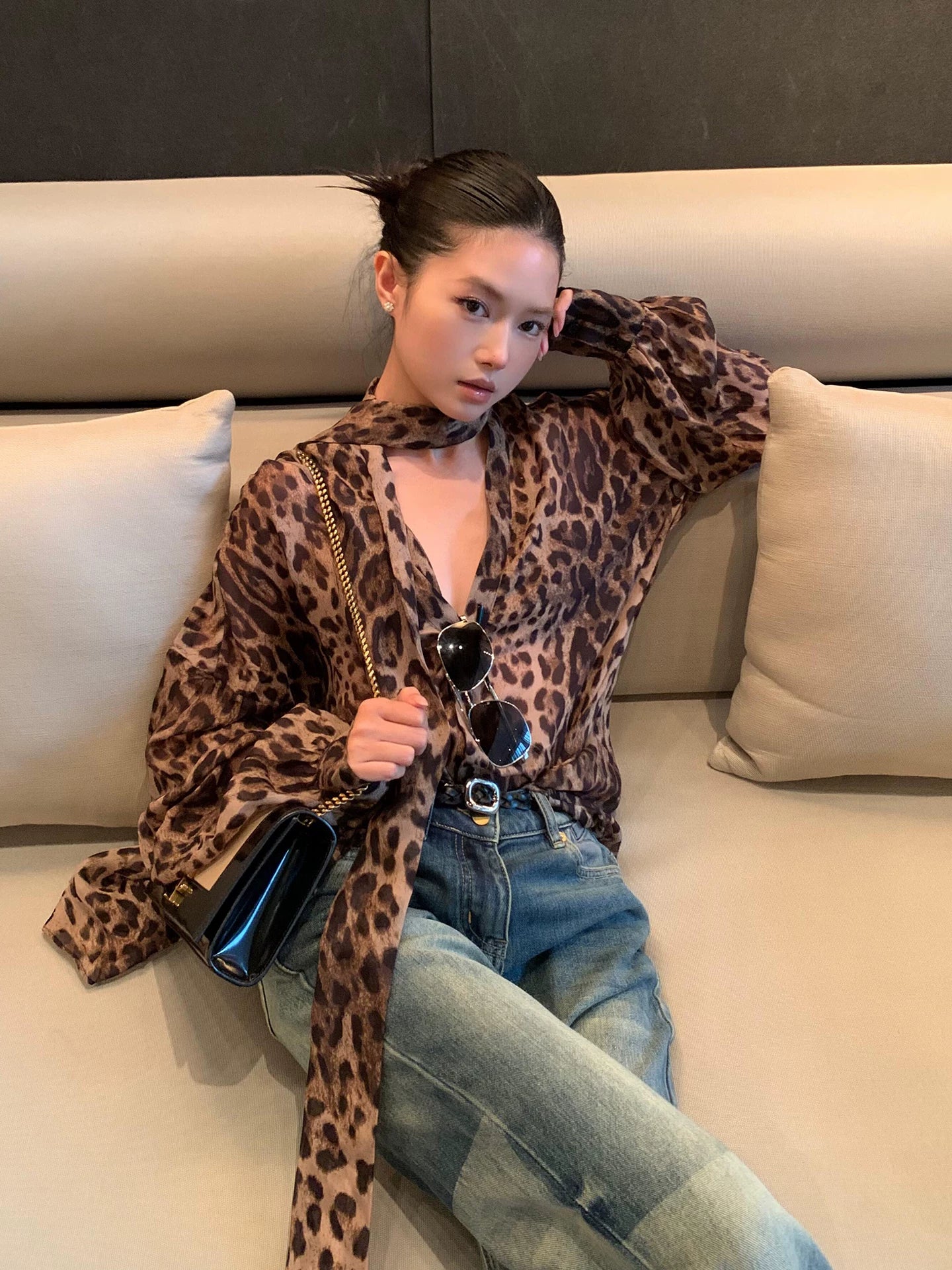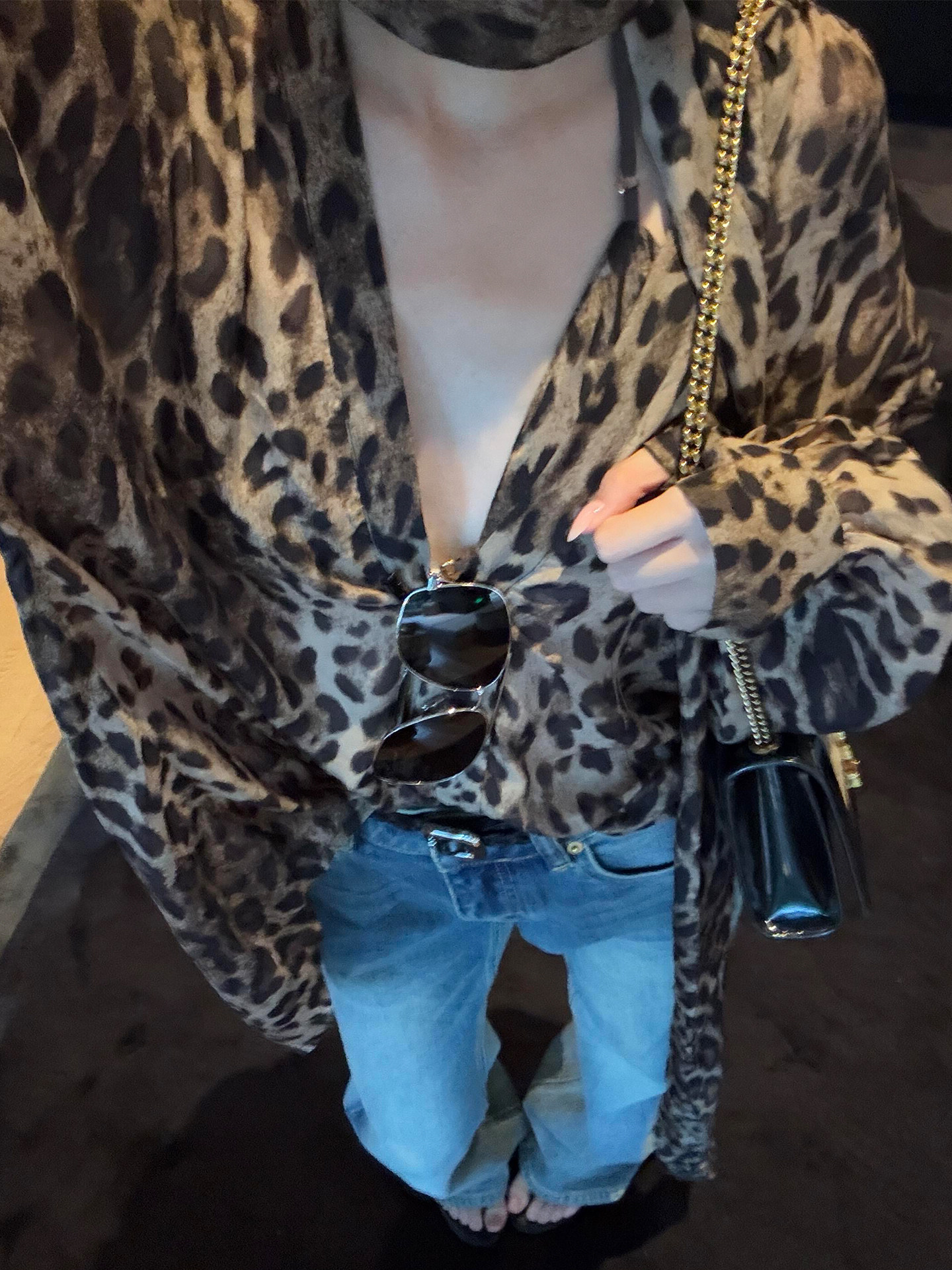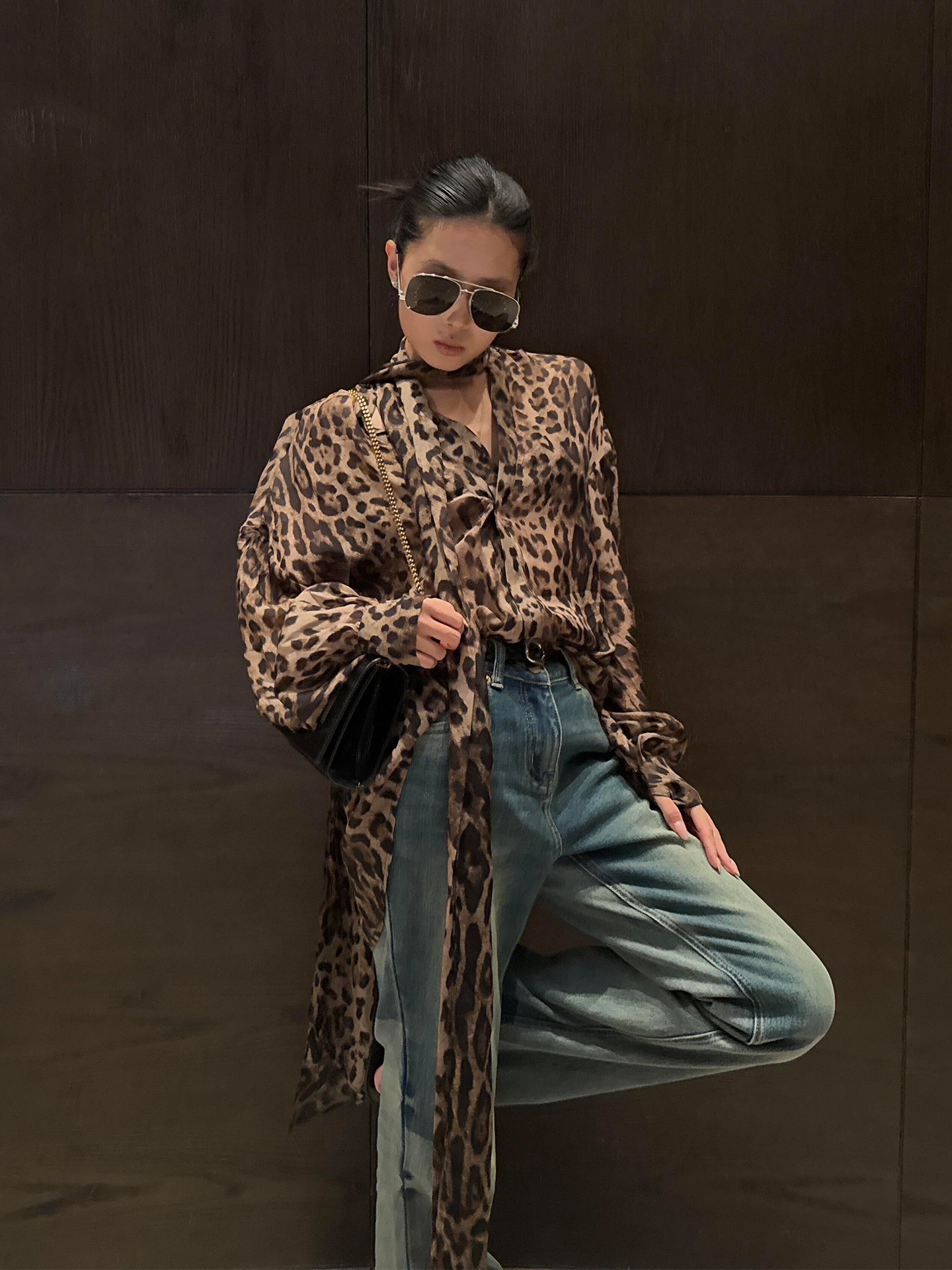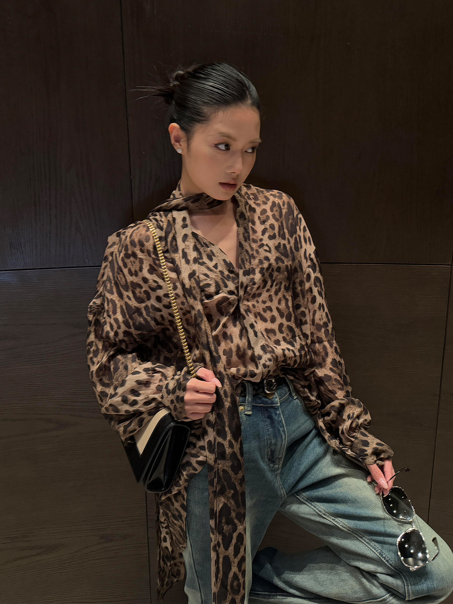 Sağa dönün / Çenin buddan yuxarı vəhşi canlılıq bəbir naxışlı lent rəngli qadın uzunqol köynəyi