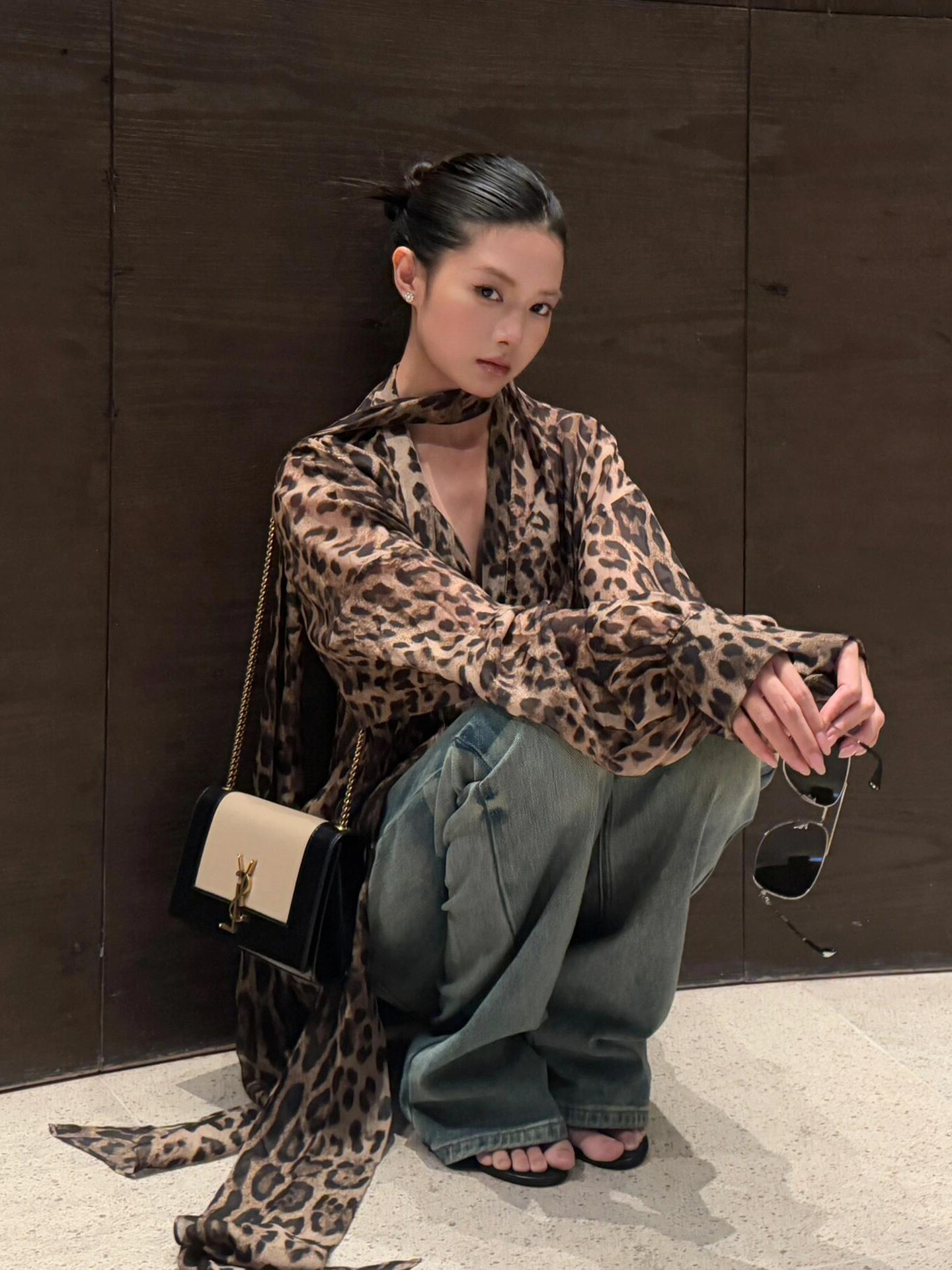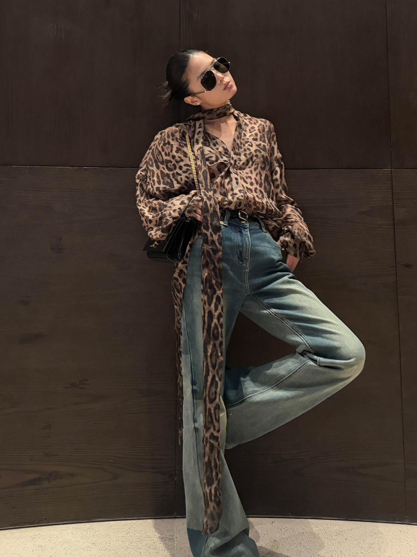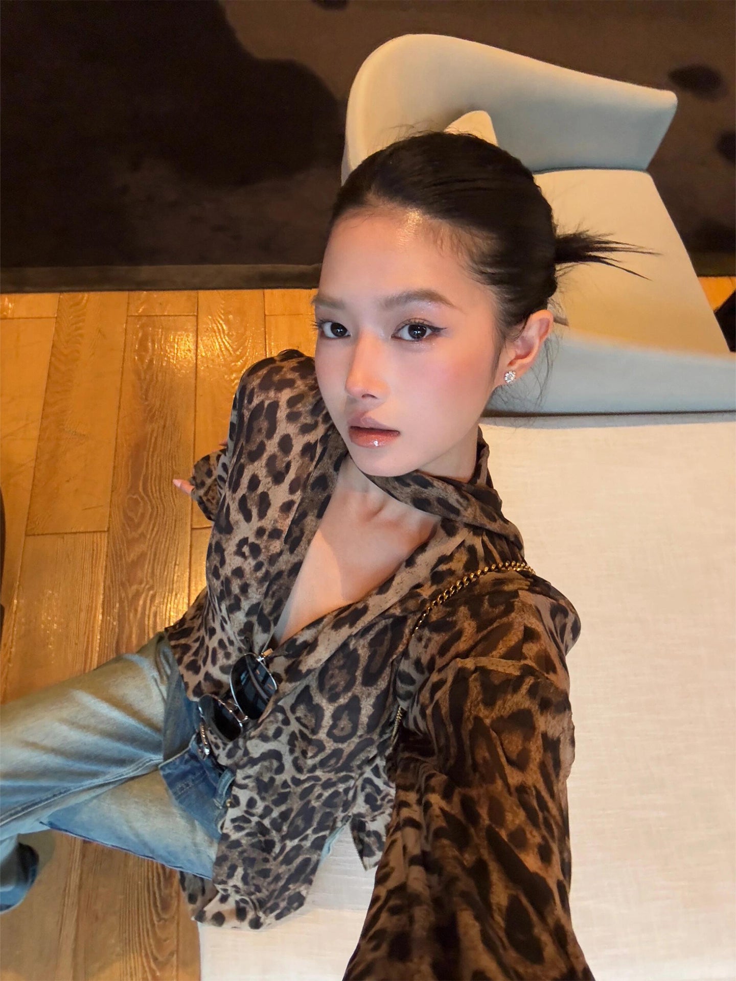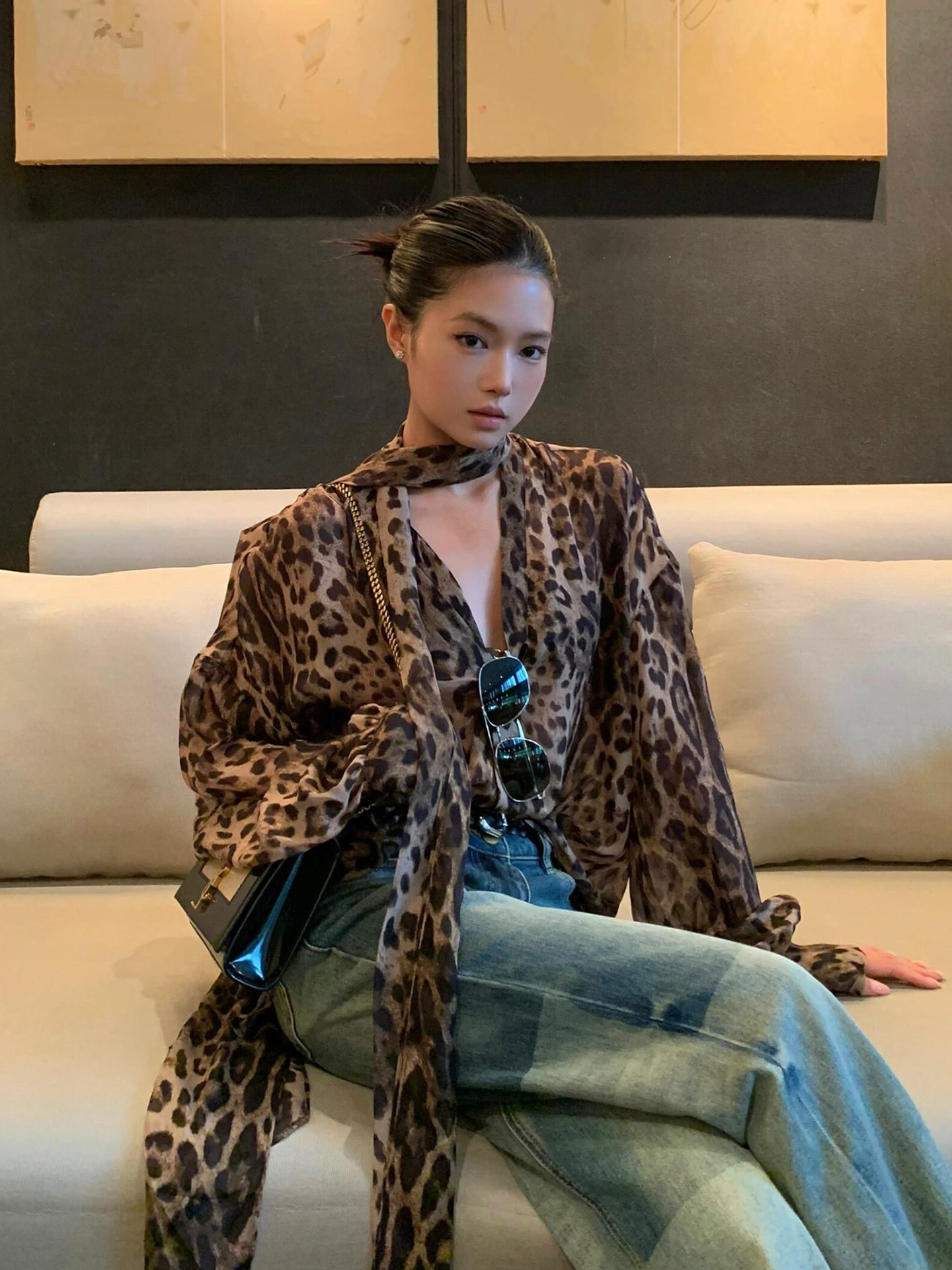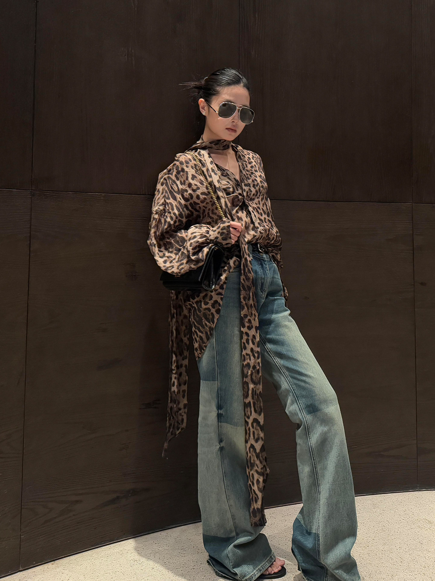 Sağa dönün / Çenin buddan yuxarı vəhşi canlılıq bəbir naxışlı lent rəngli qadın uzunqol köynəyi