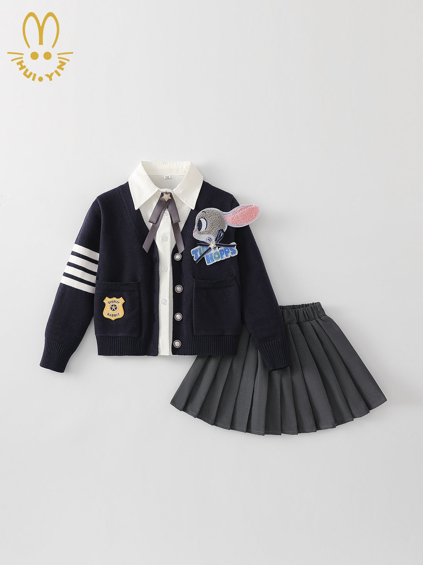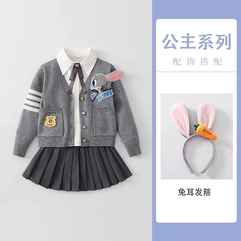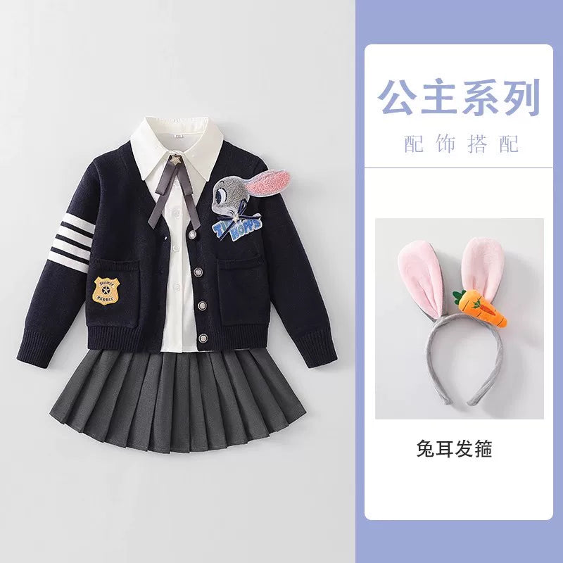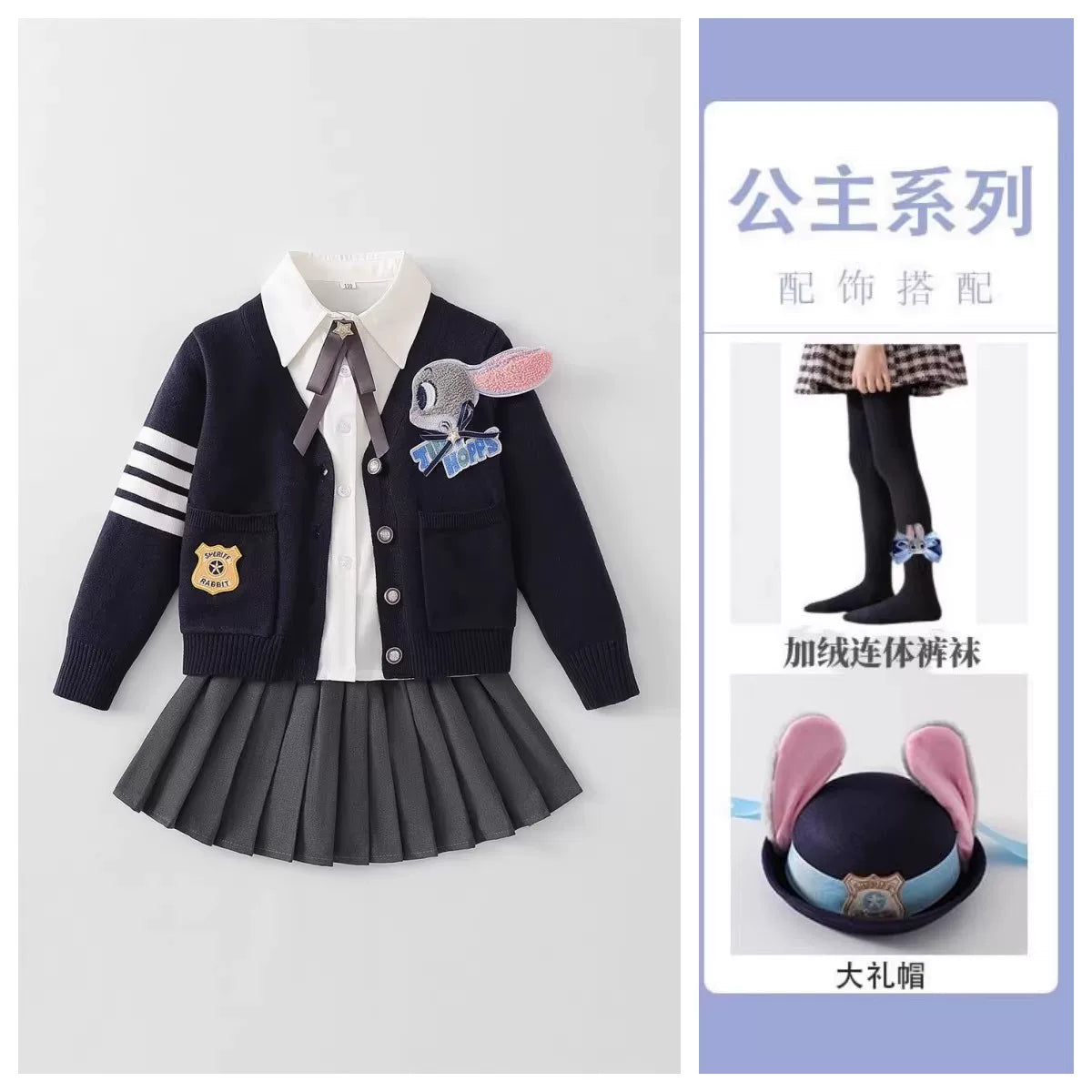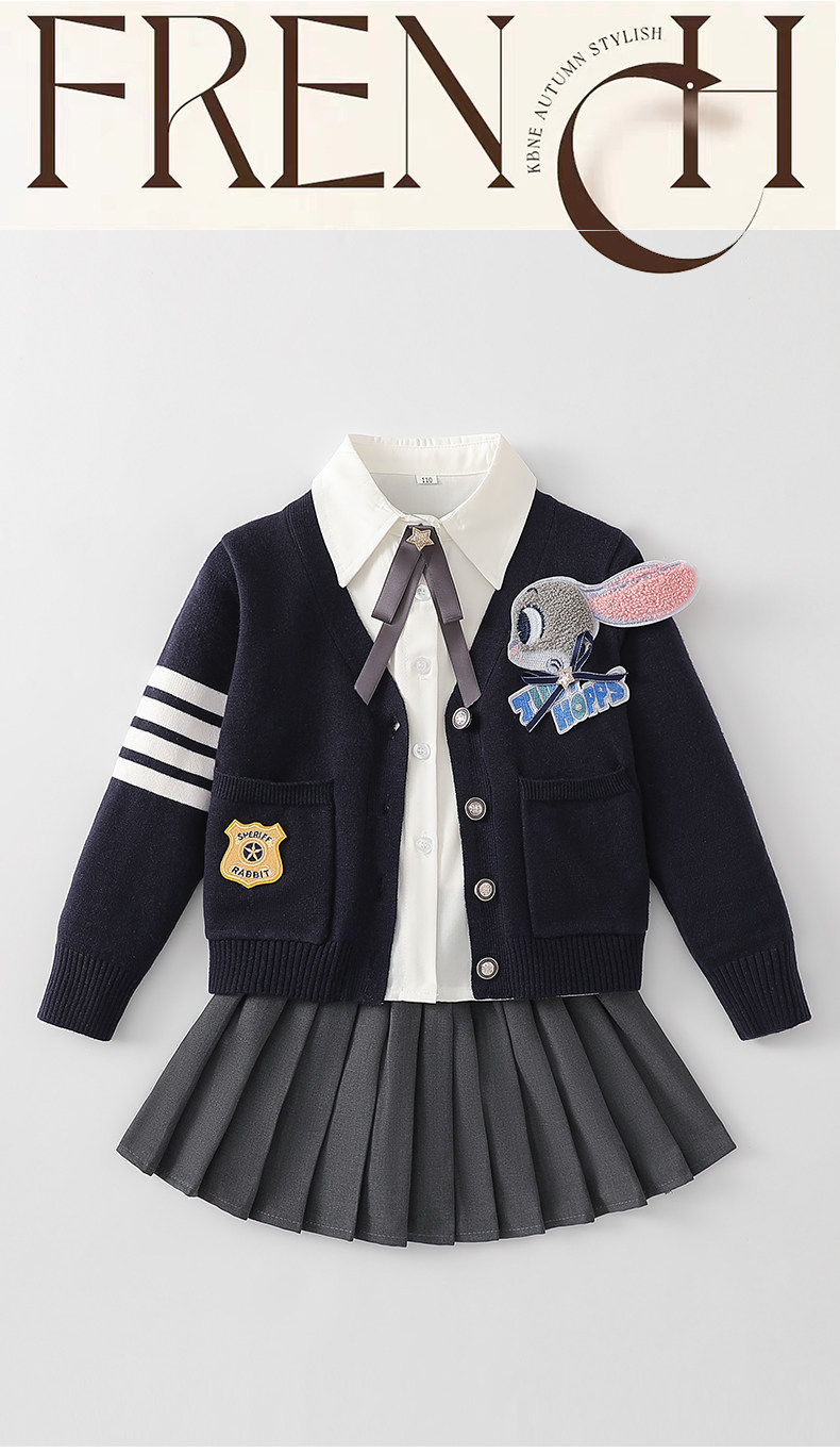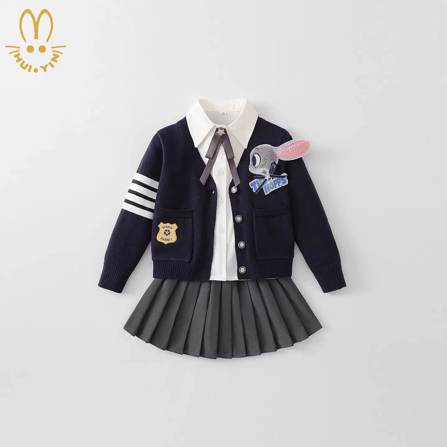 Yeni payız üslubunda qızlar üçün dovşan polis məmuru sviteri üç hissəli dəst, JK ətəyi, dəbli payız və qış uşaq ad günü geyimləri