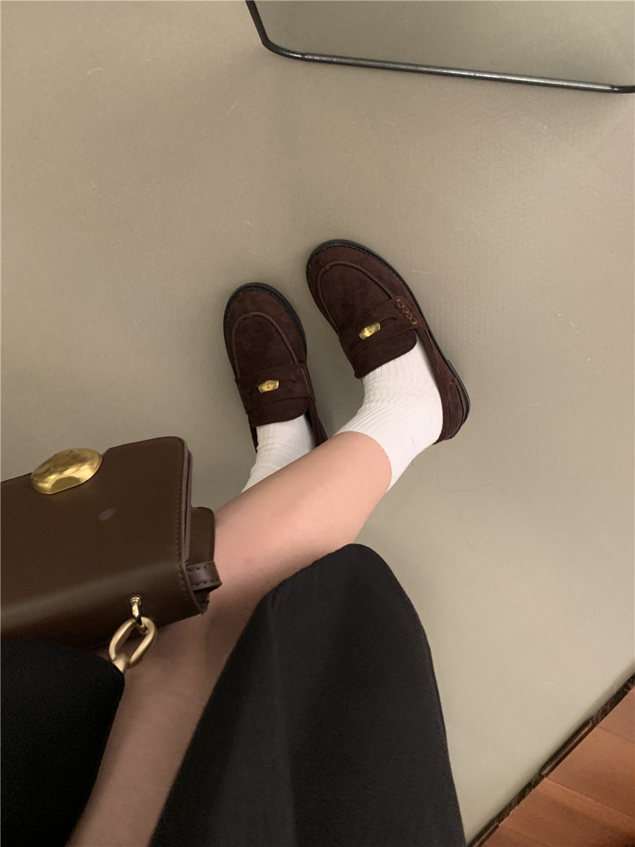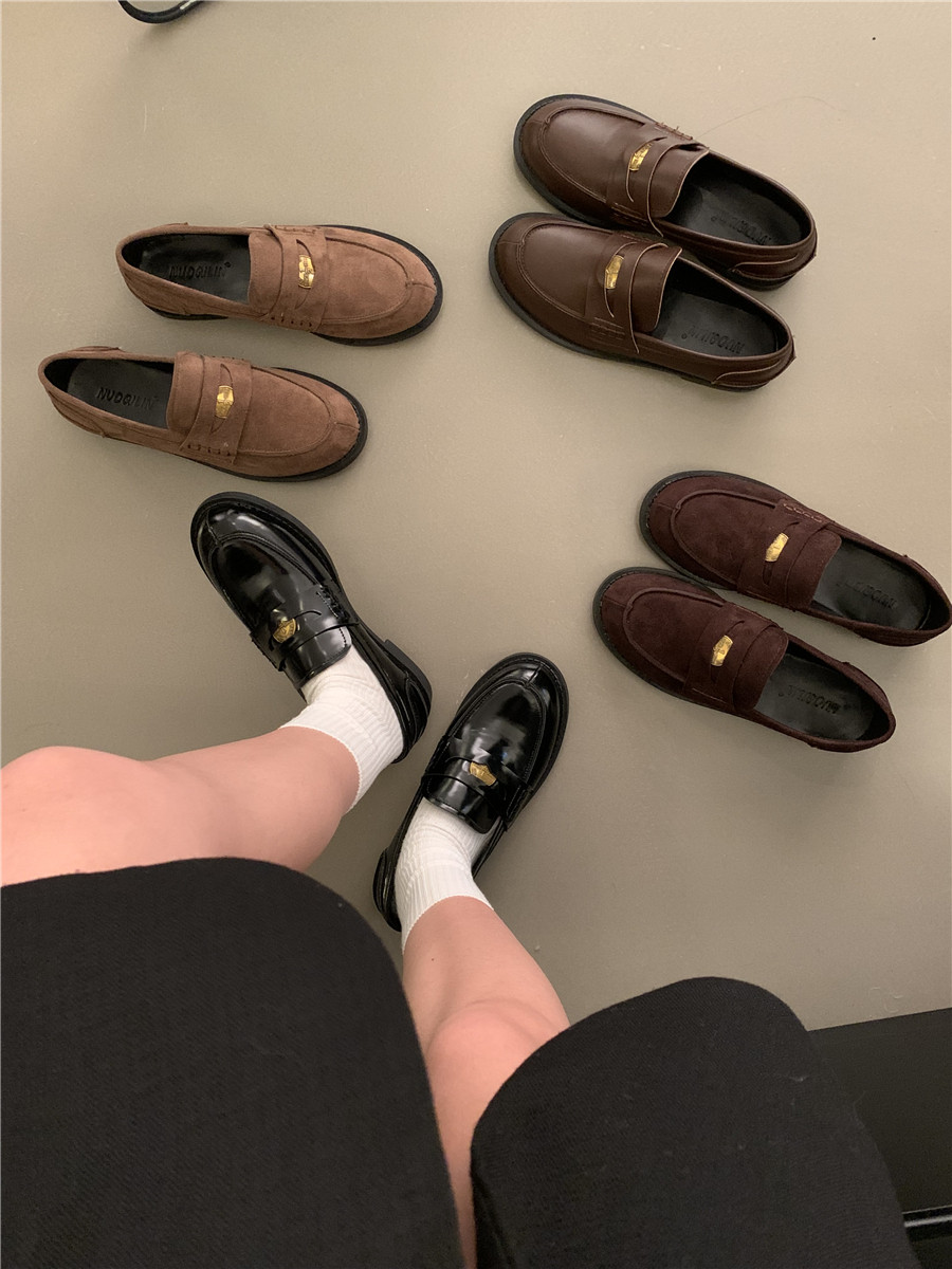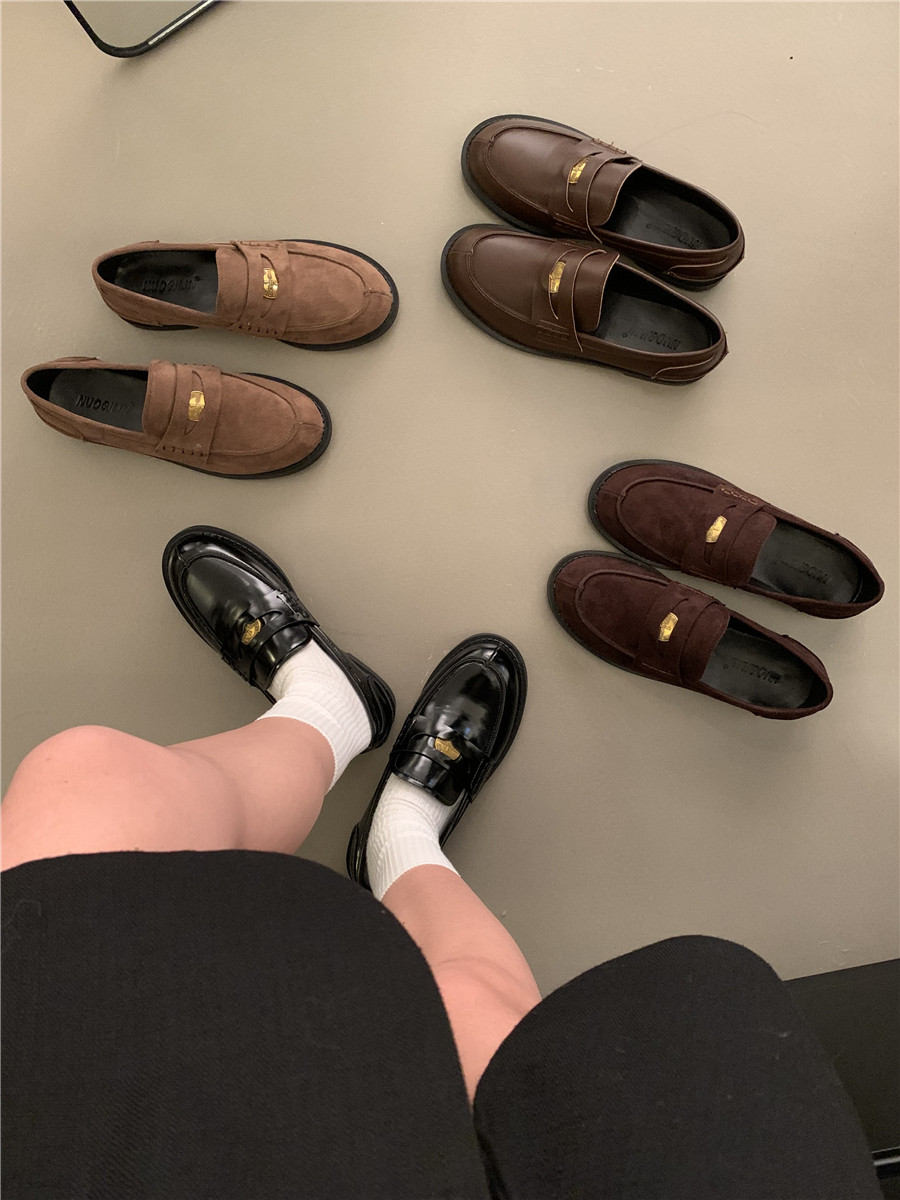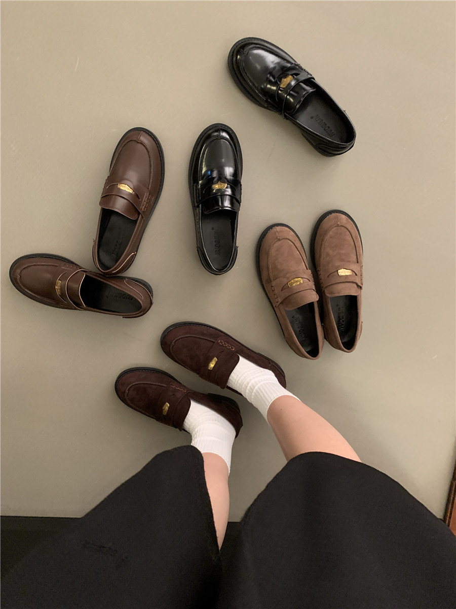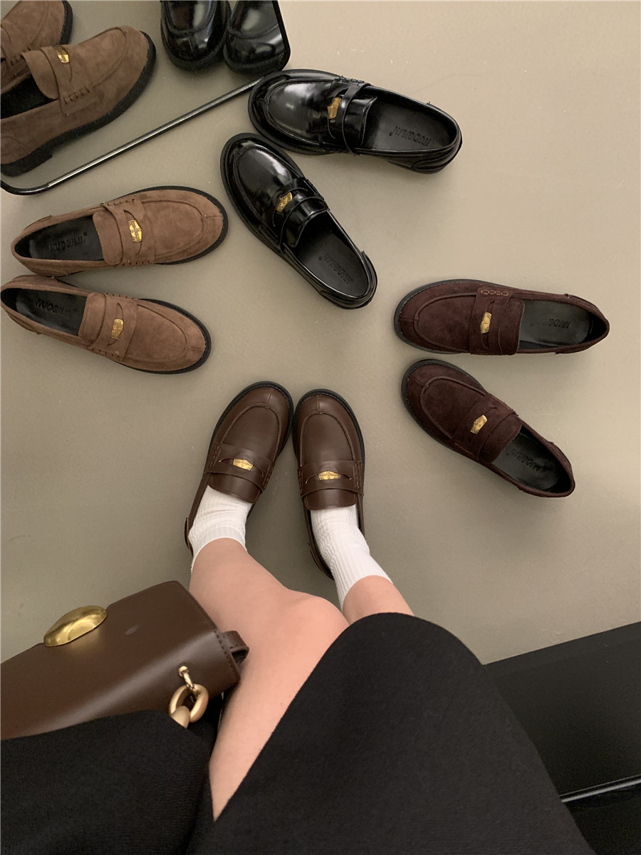 Yun astarlı qəhvəyi qızılı sikkə mokasinlər, payız və qış mokasinləri, qara rəngli tək ayaqqabılar, qadın ayaqqabıları, Britaniya üslubunda dəri ayaqqabılar