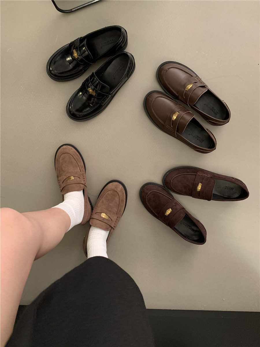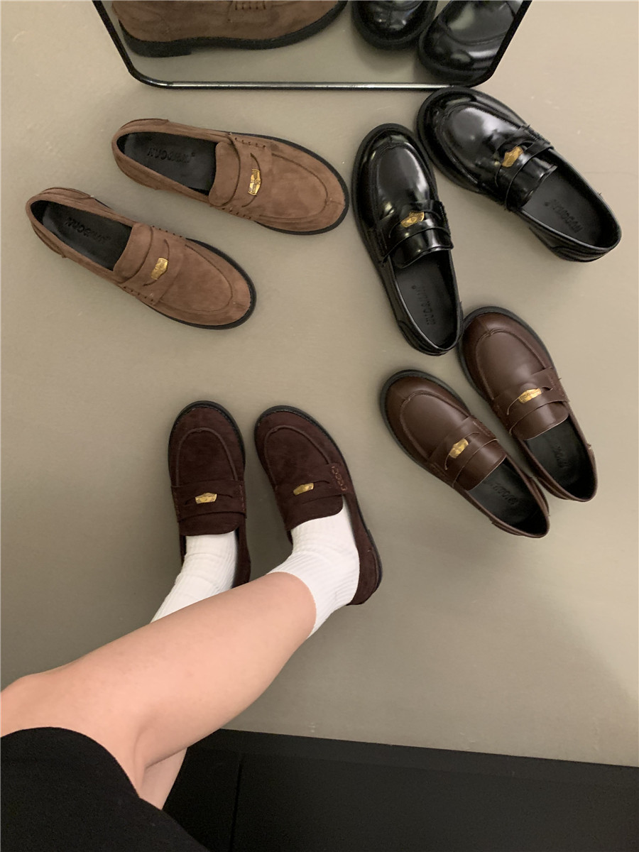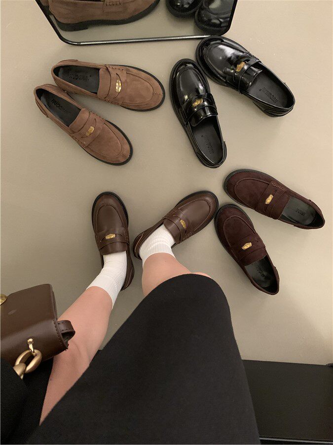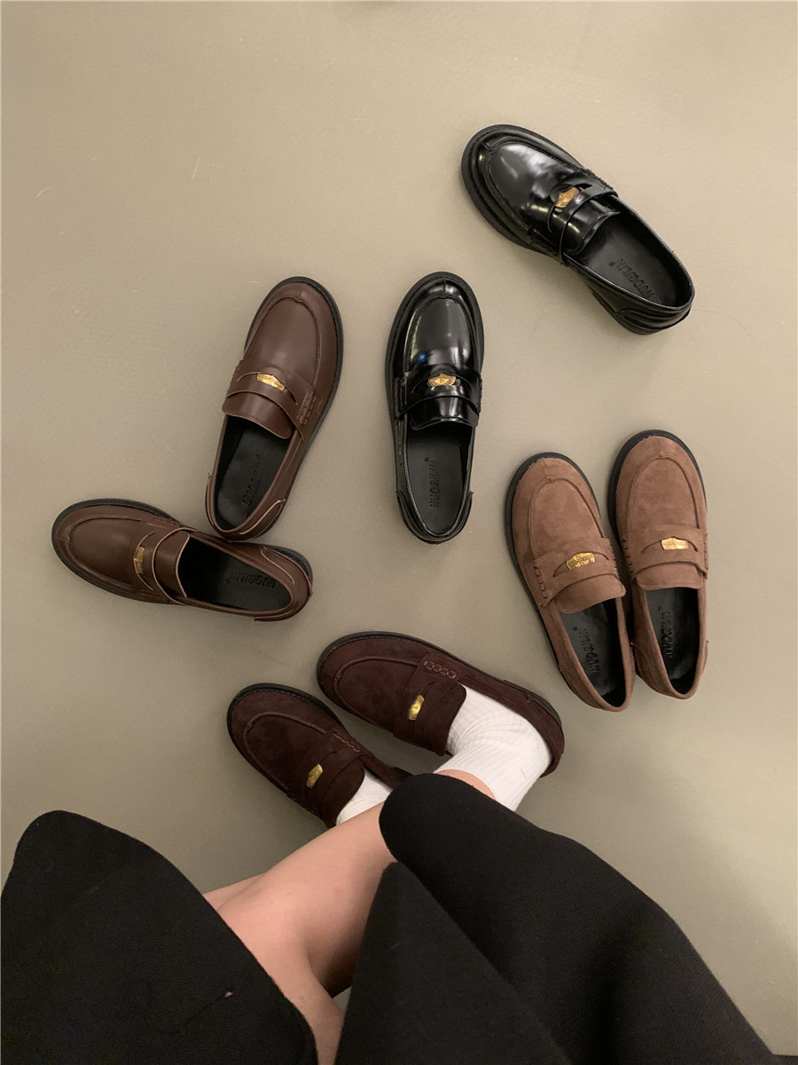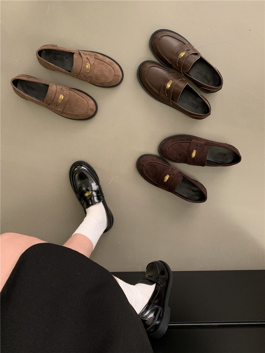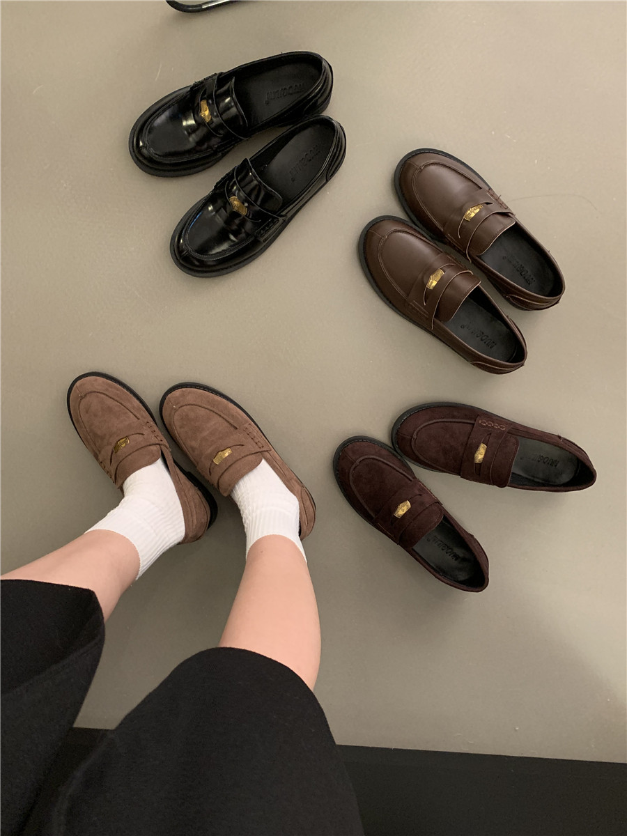 Yun astarlı qəhvəyi qızılı sikkə mokasinlər, payız və qış mokasinləri, qara rəngli tək ayaqqabılar, qadın ayaqqabıları, Britaniya üslubunda dəri ayaqqabılar
