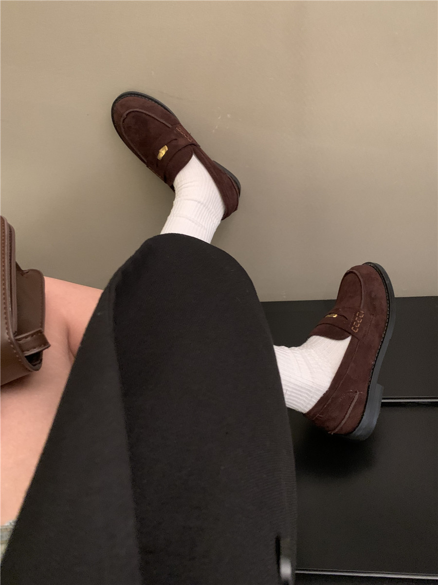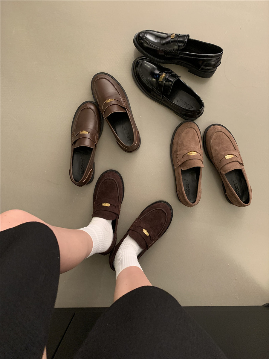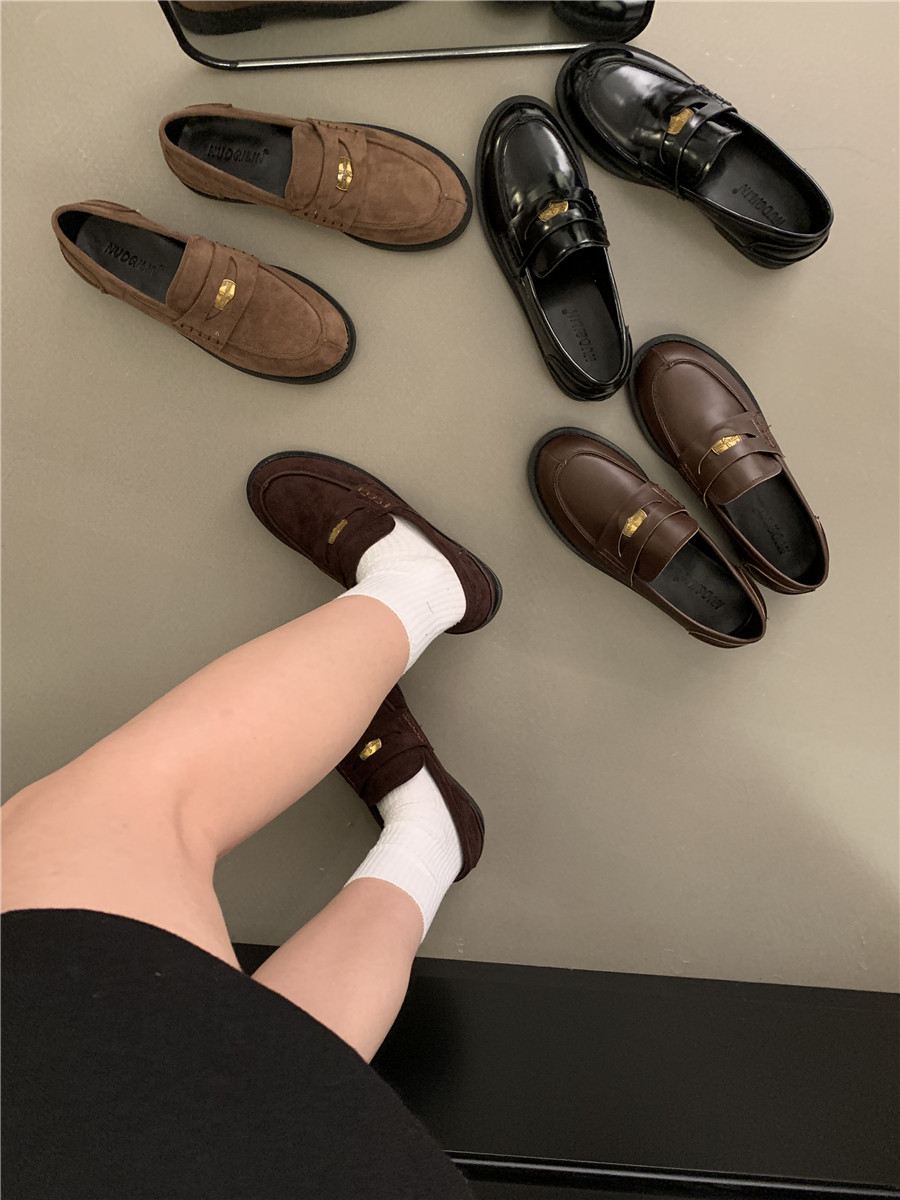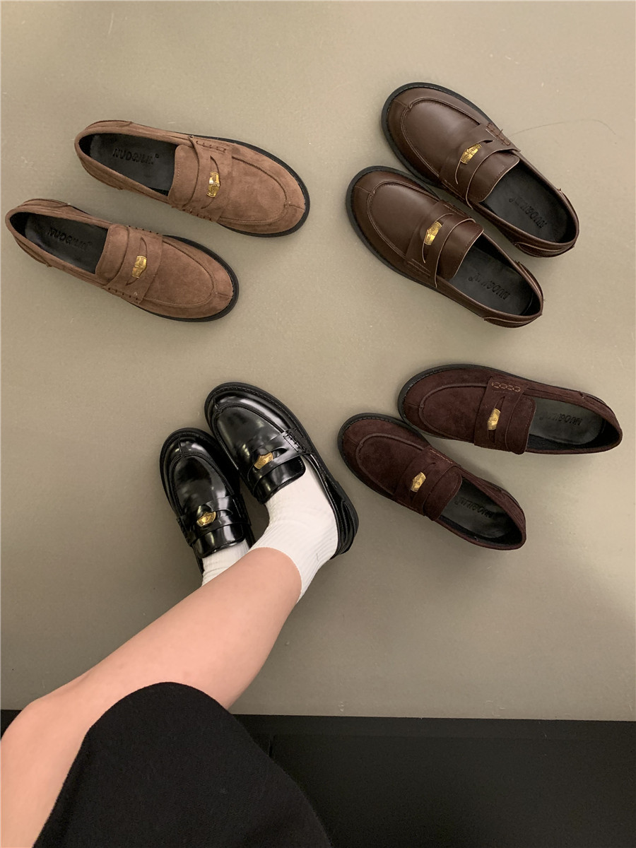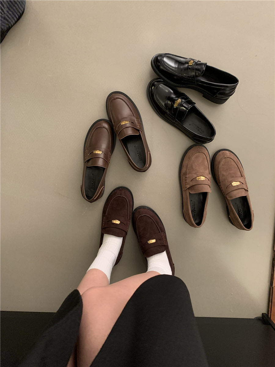 Yun astarlı qəhvəyi qızılı sikkə mokasinlər, payız və qış mokasinləri, qara rəngli tək ayaqqabılar, qadın ayaqqabıları, Britaniya üslubunda dəri ayaqqabılar