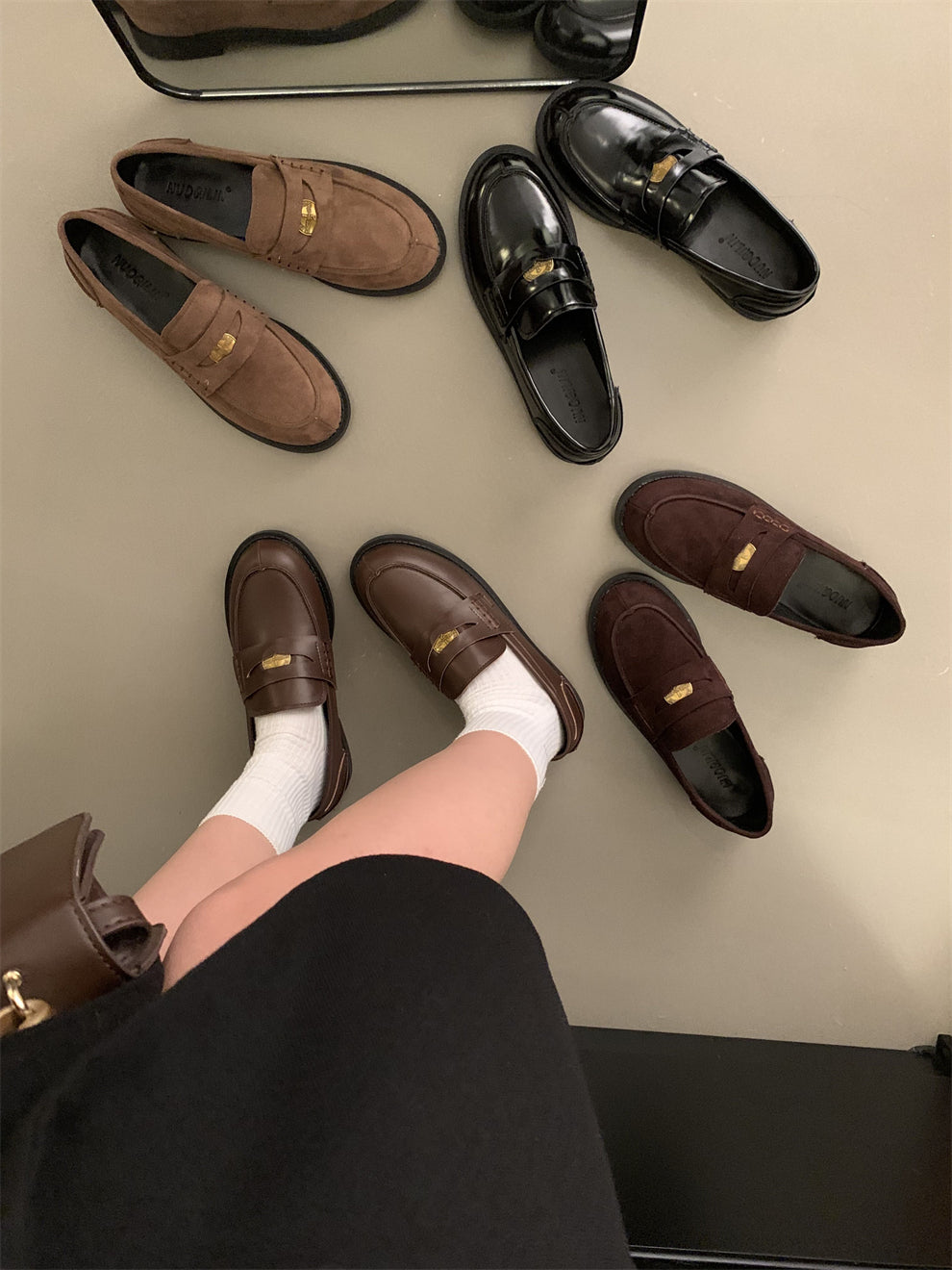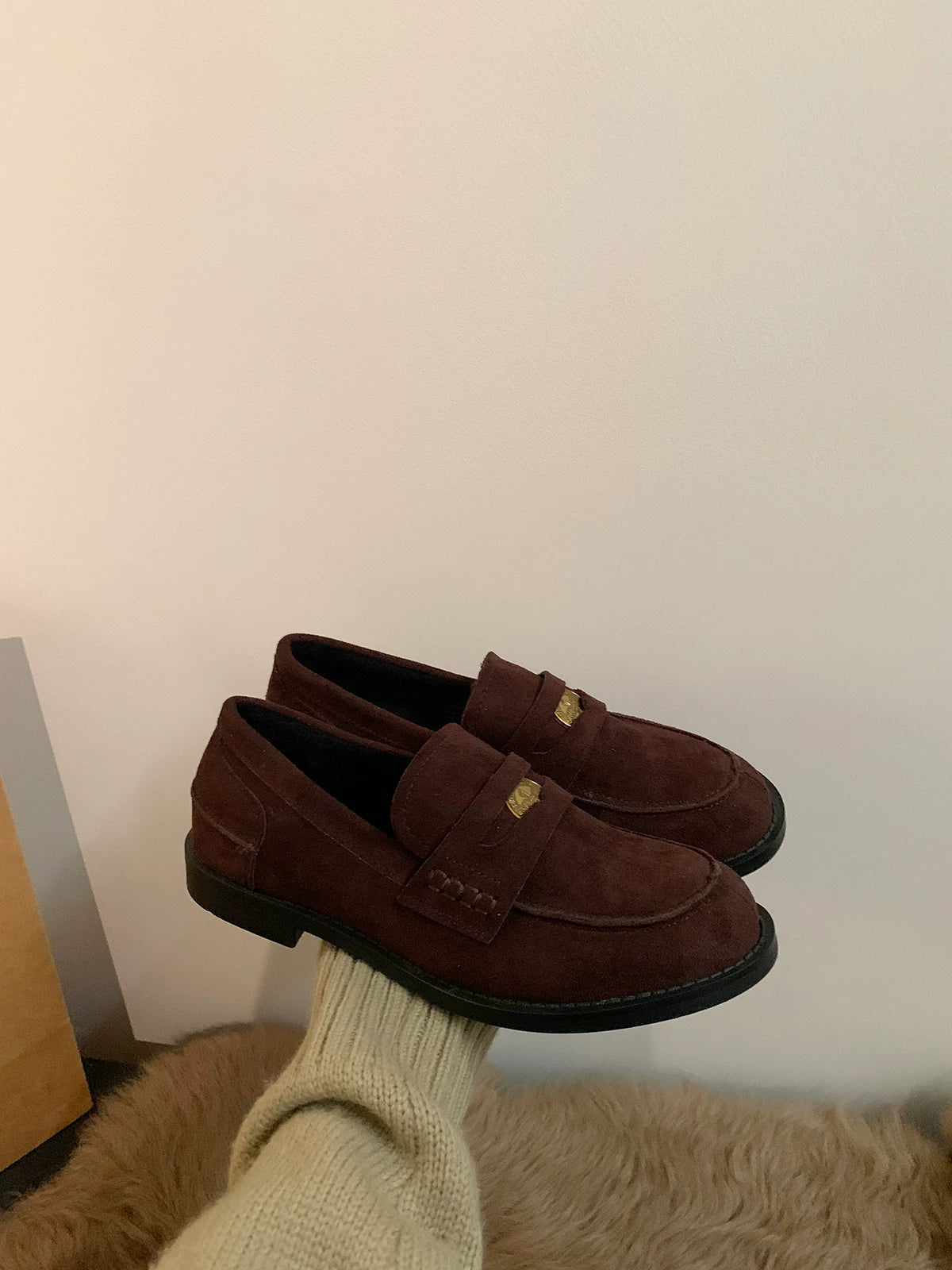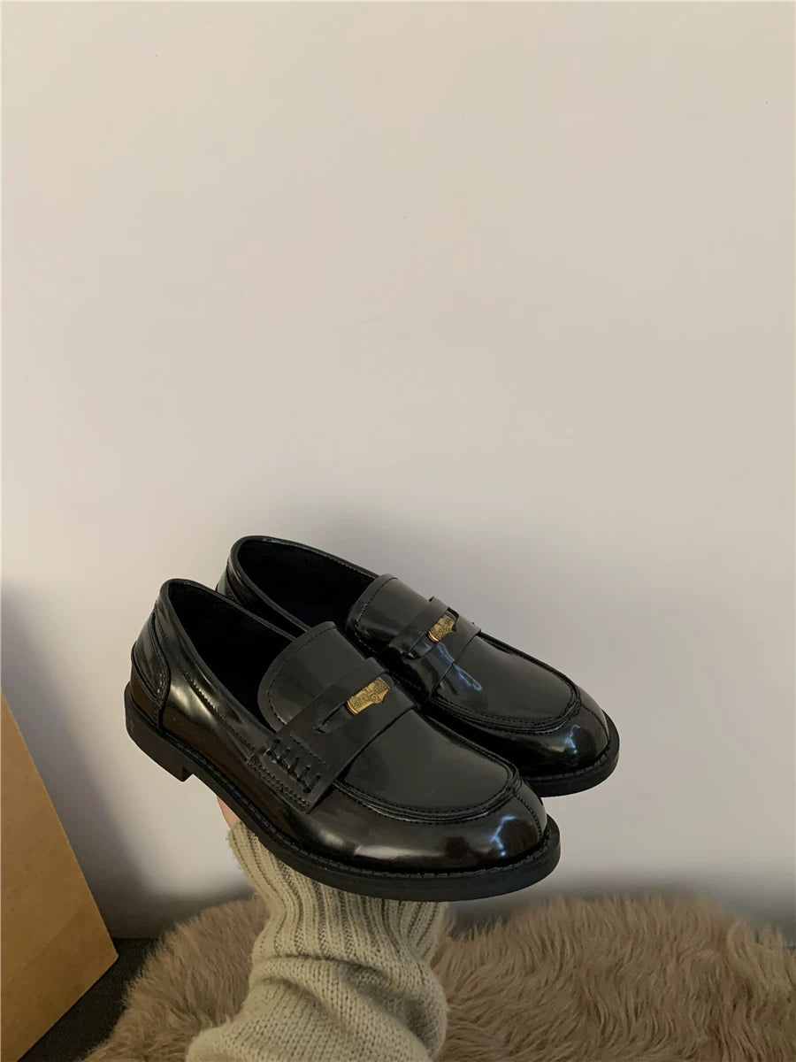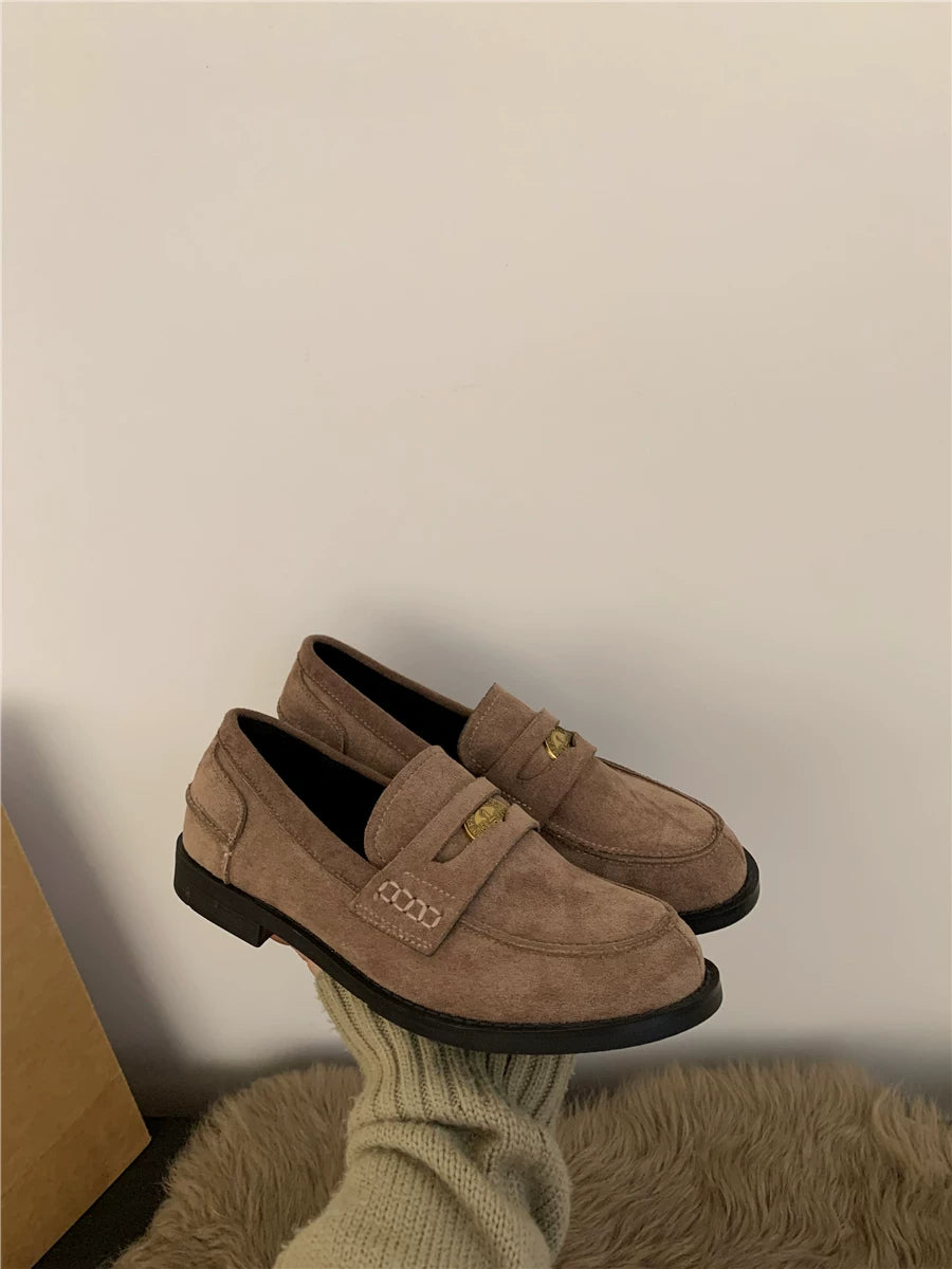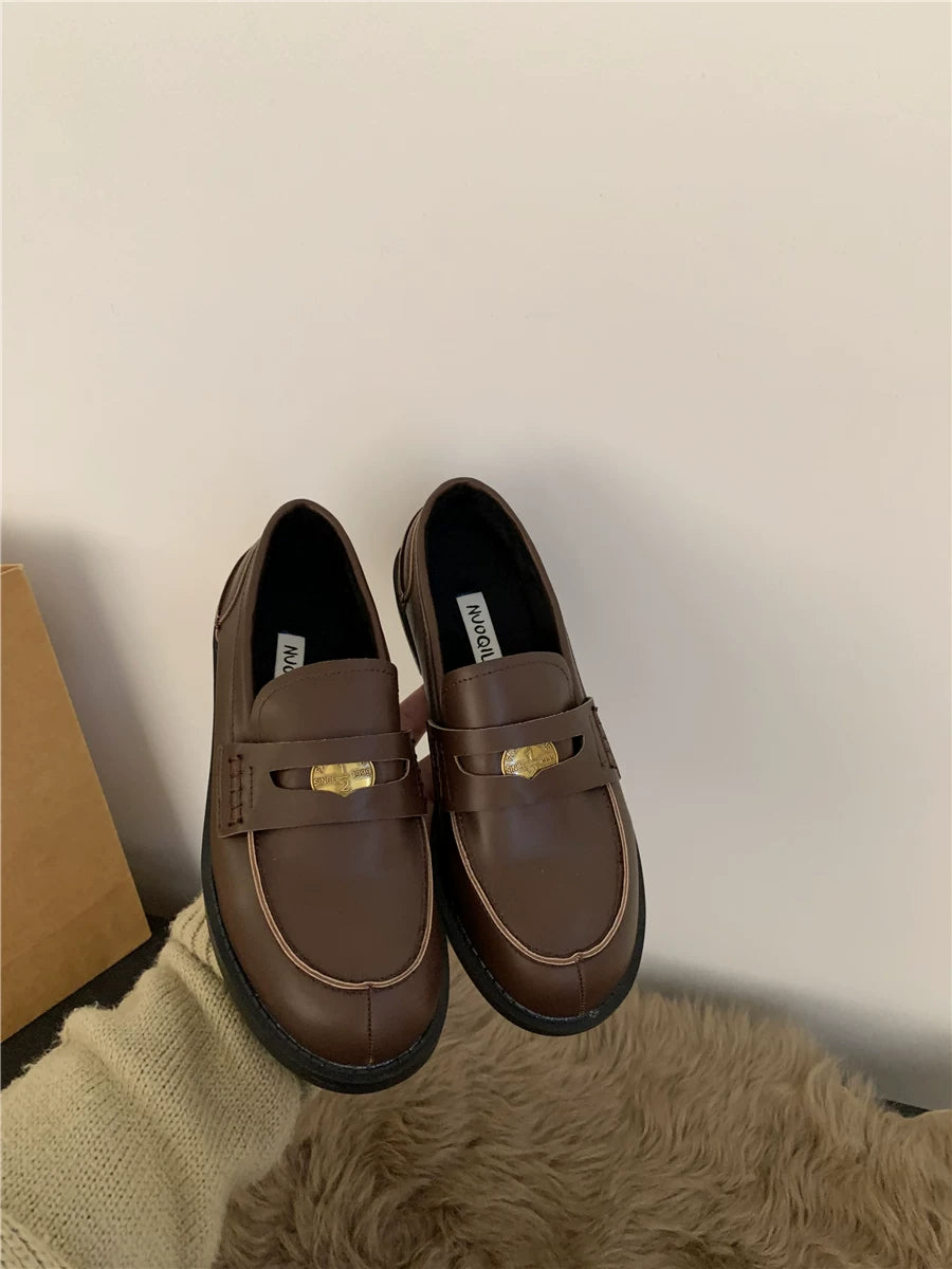 Yun astarlı qəhvəyi qızılı sikkə mokasinlər, payız və qış mokasinləri, qara rəngli tək ayaqqabılar, qadın ayaqqabıları, Britaniya üslubunda dəri ayaqqabılar