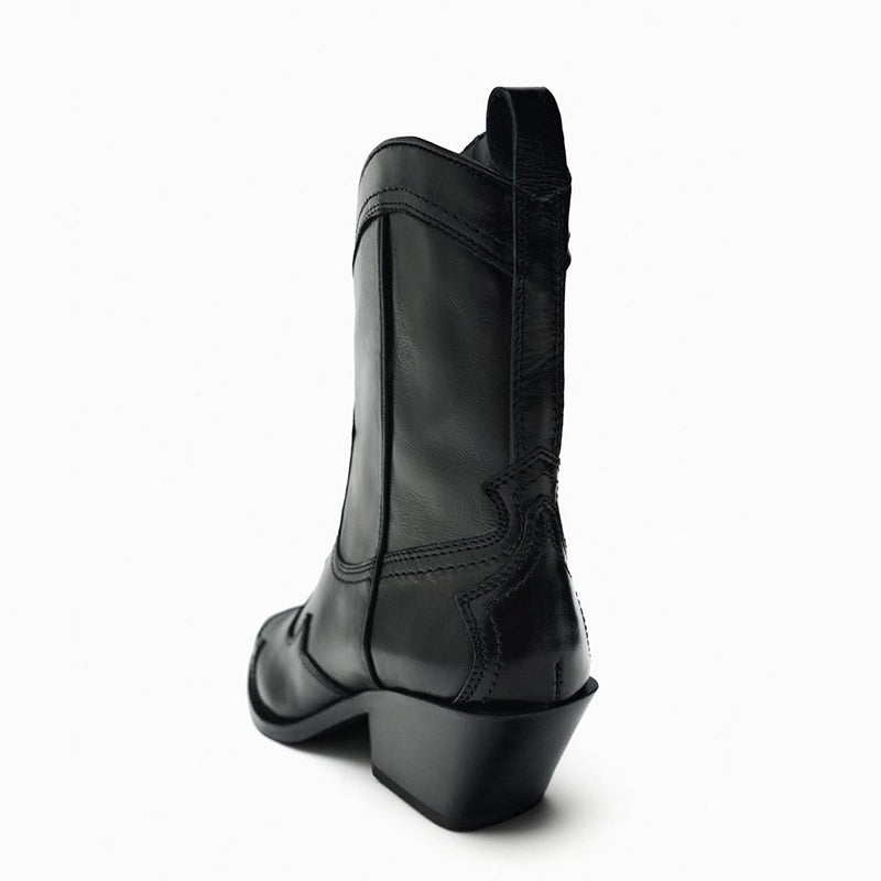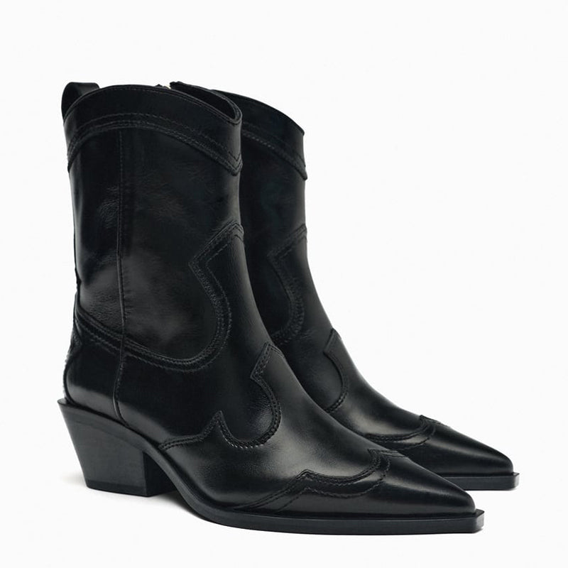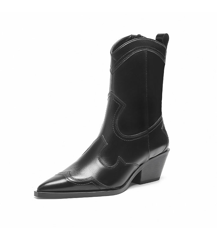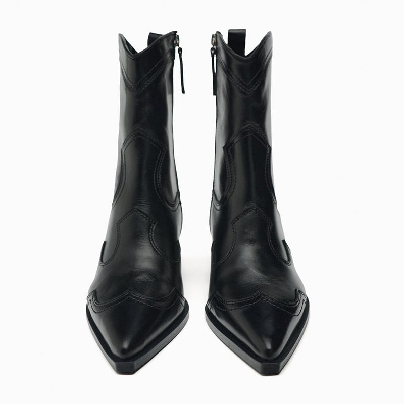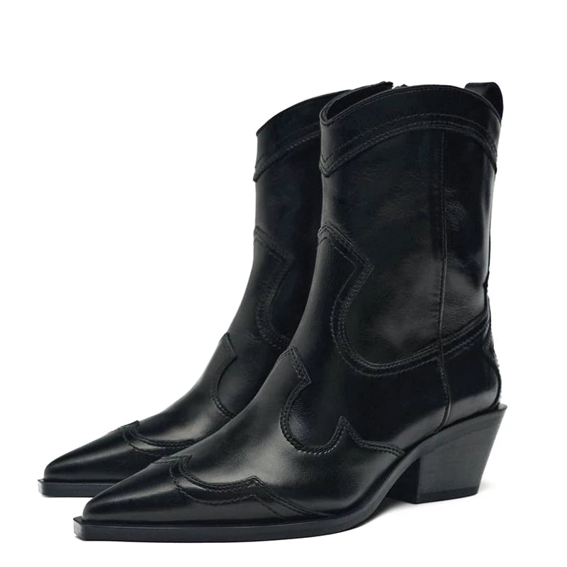 ZA2025 Yeni Orijinal Dəri Hündürdaban Qərb Kovboy Çəkmələri Retro Uclu Barmaqla İşlənmiş Hündürdaban Ayaq Biləyi Çəkmələri Qalın Dabanlı Martin Çəkmələri Qadınlar üçün